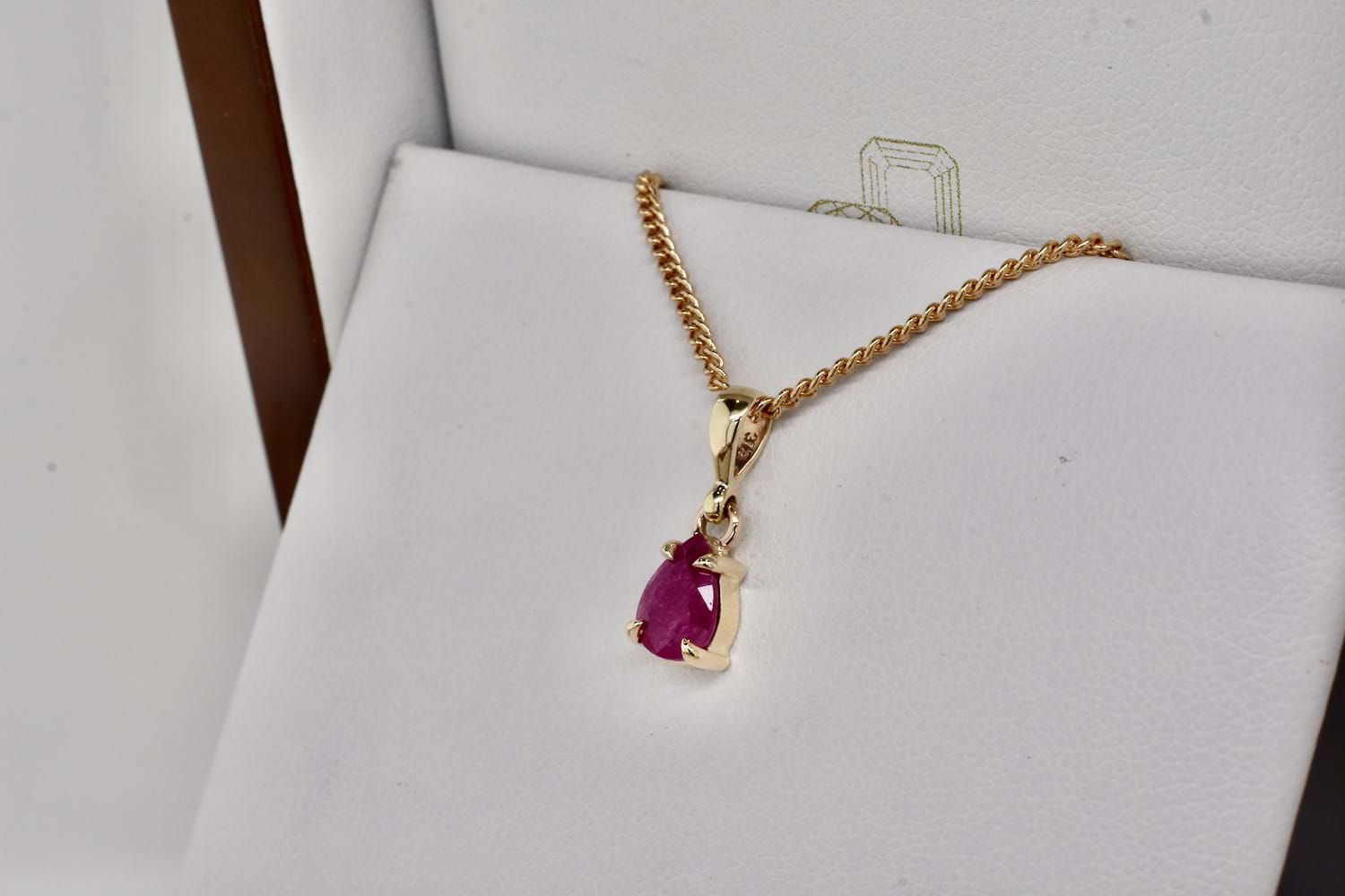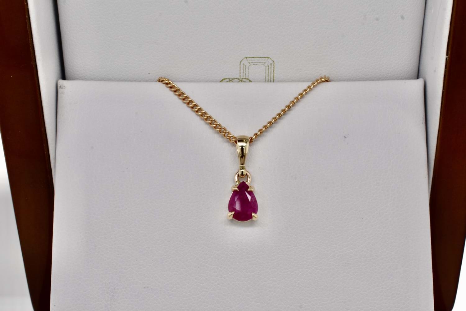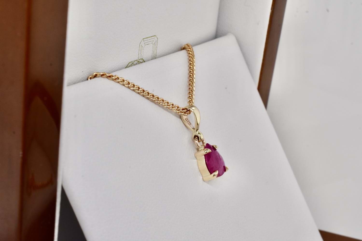 This simple and timeless handmade 9ct yellow gold pendant features a pearshape ruby (H) measuring approx. 8x6.4mm cap and two claw set with a plain bale. Chains are available for separate purchase