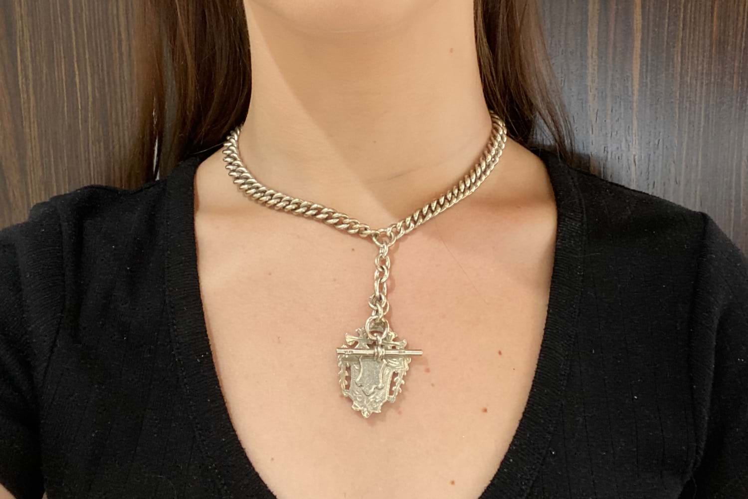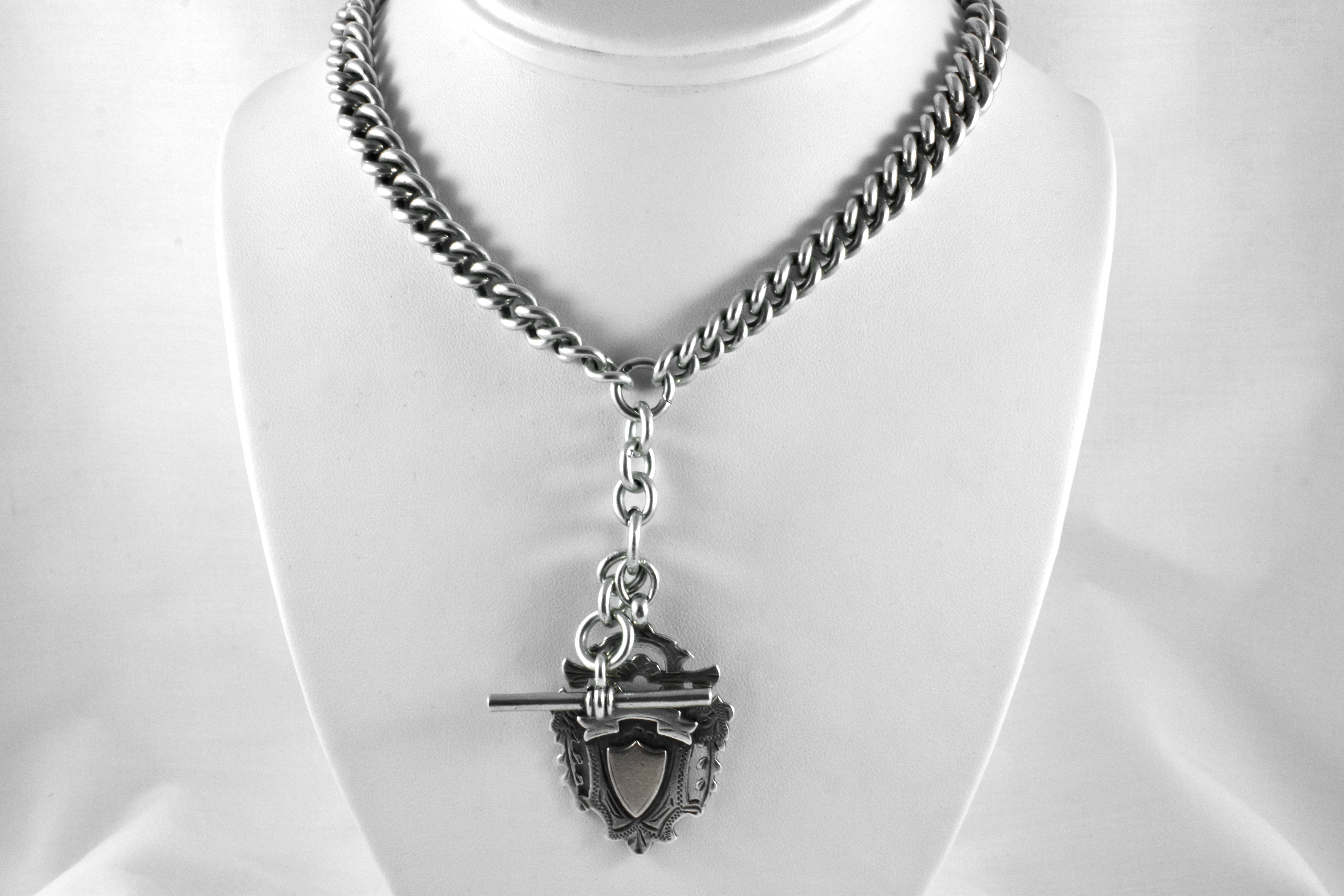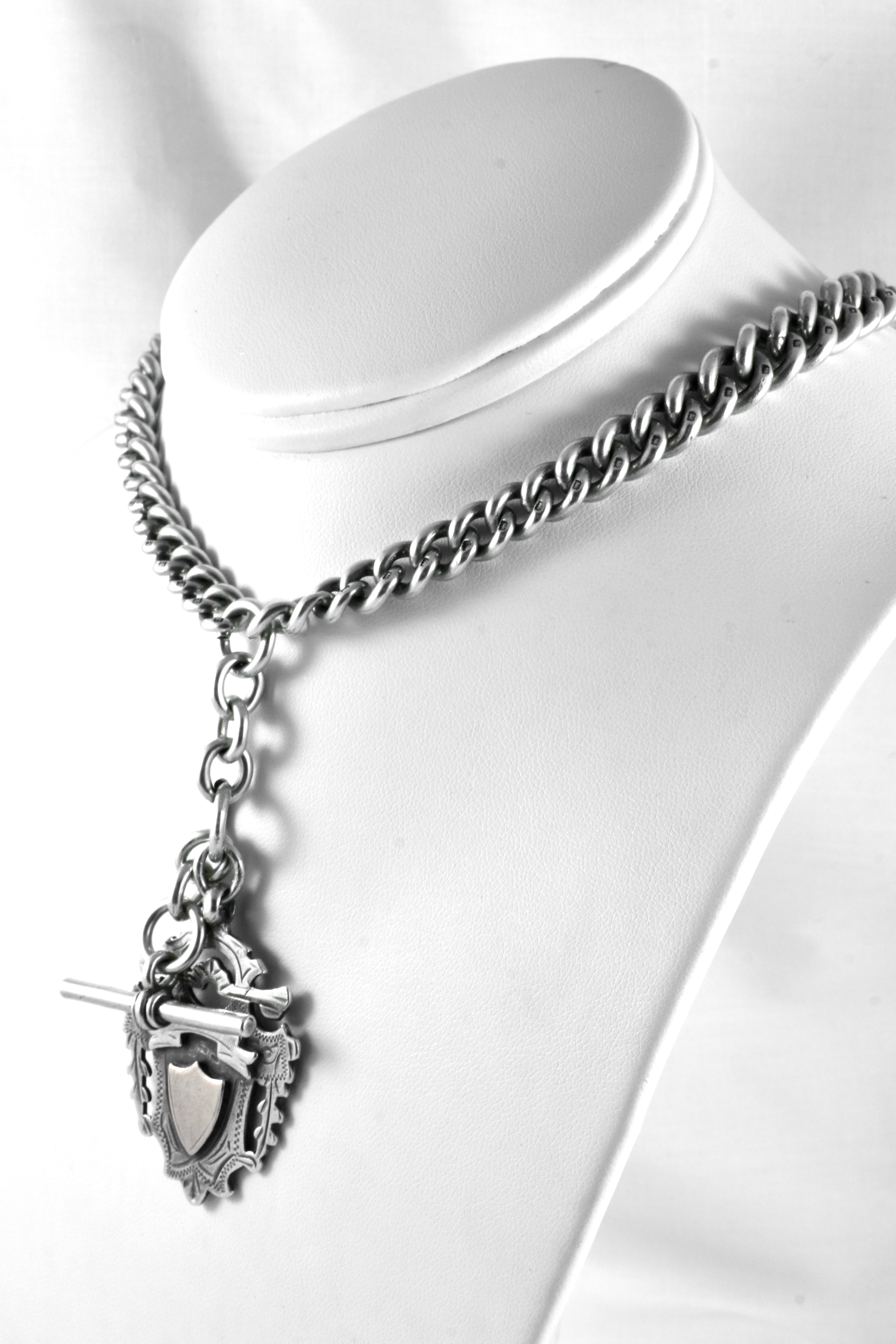 A lovely antique sterling silver fob chain, 41cm long with a curb link graduating from 7.2 to 9.8mm with one swivel and T-bar Birmingham 1919, with a 9ct gold and silver engraved shield Birmingham 1917