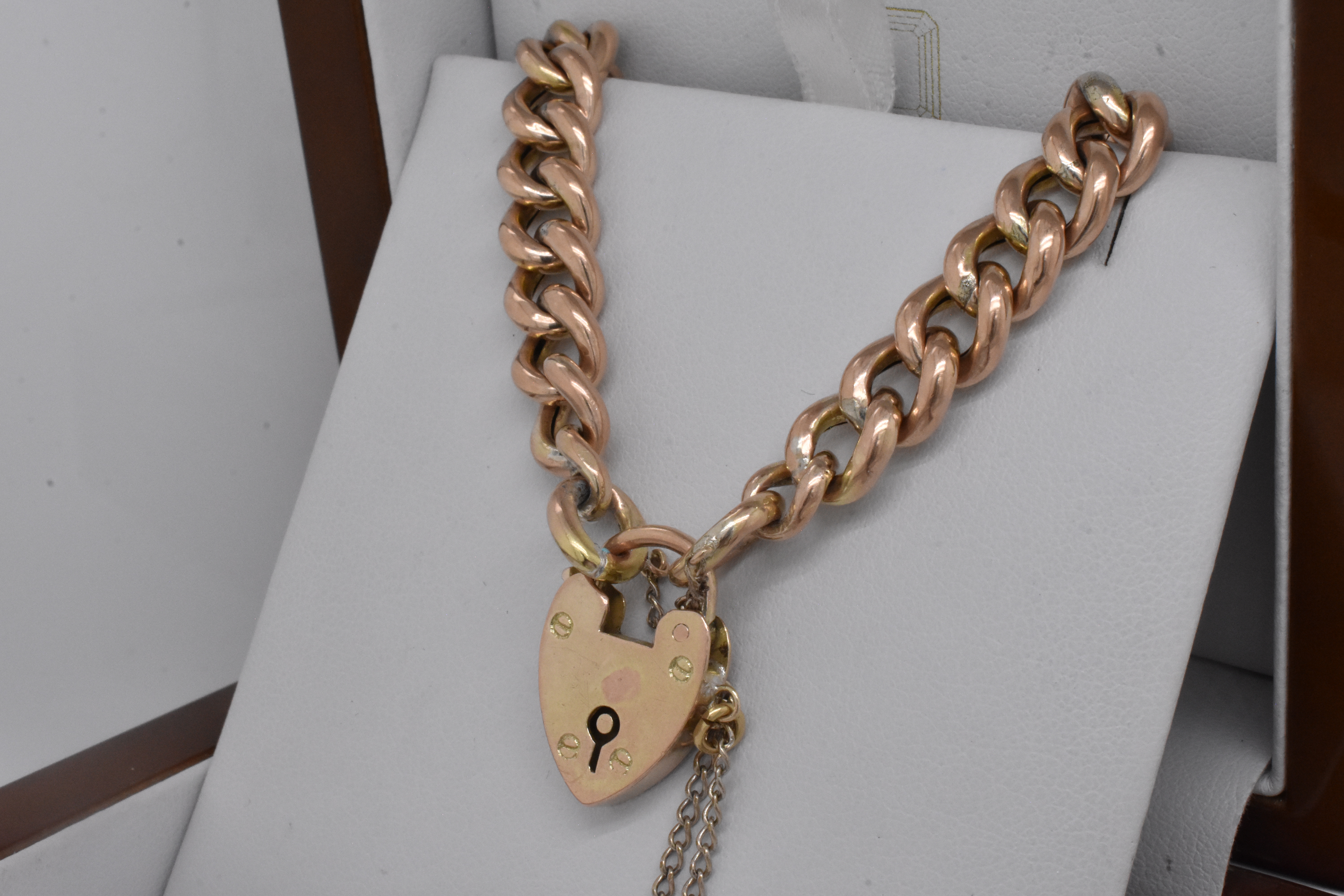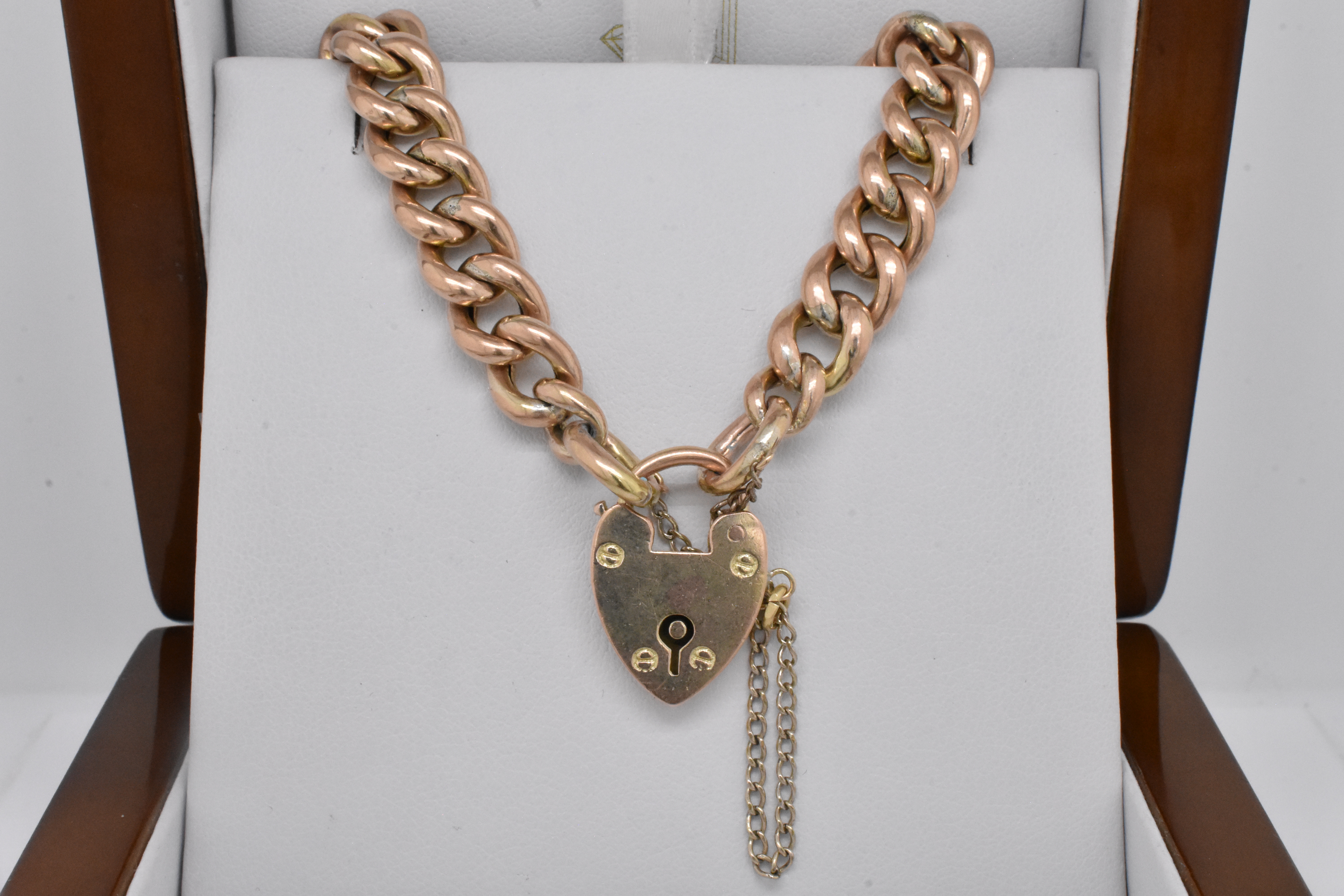 A quintessential piece, this 9ct yellow gold bracelet features hollow curb links with an antique heart shaped padlock hallmarked Birmingham 1906, with safety chain. Bracelet is 19.5cm long and weighs 15.06g