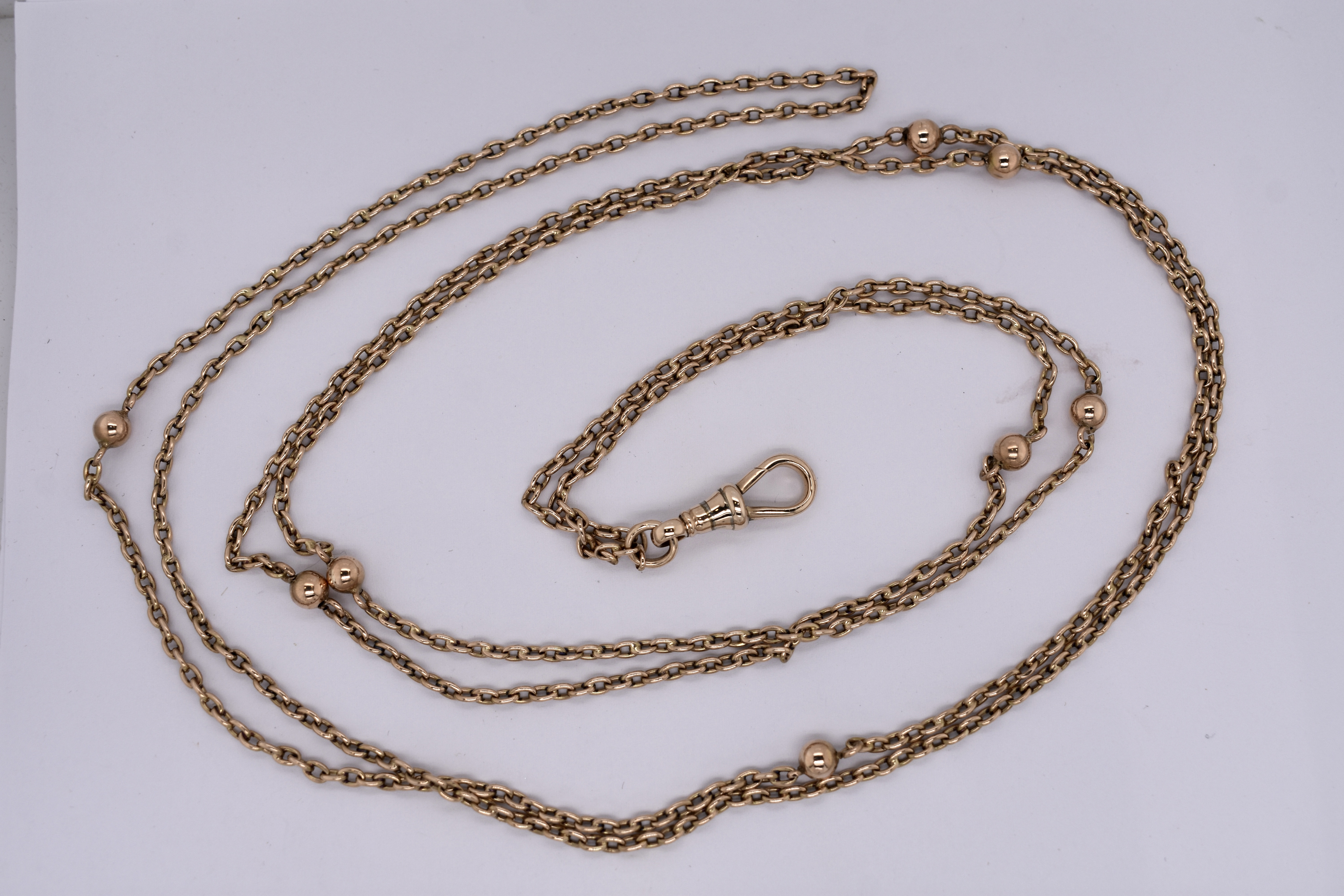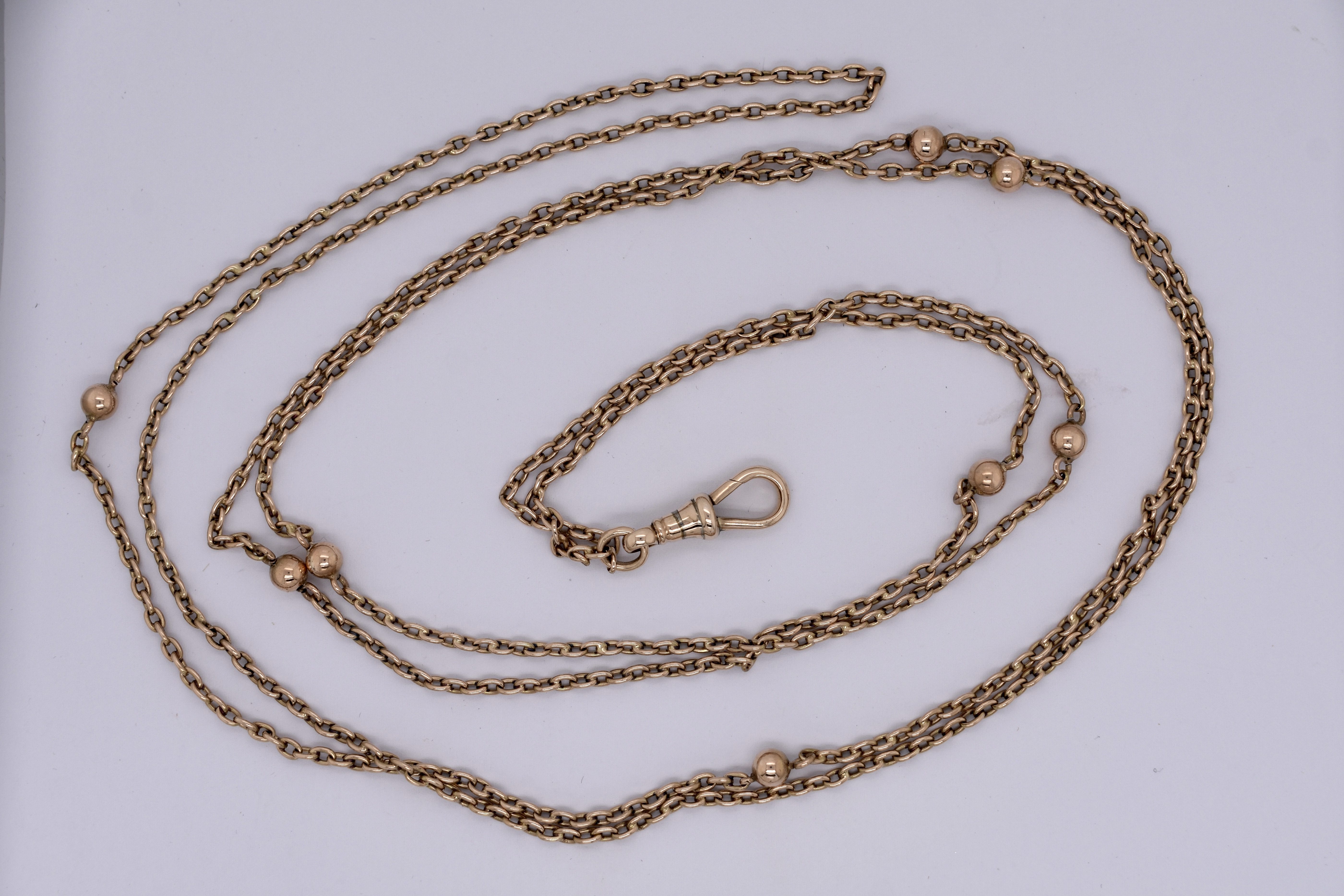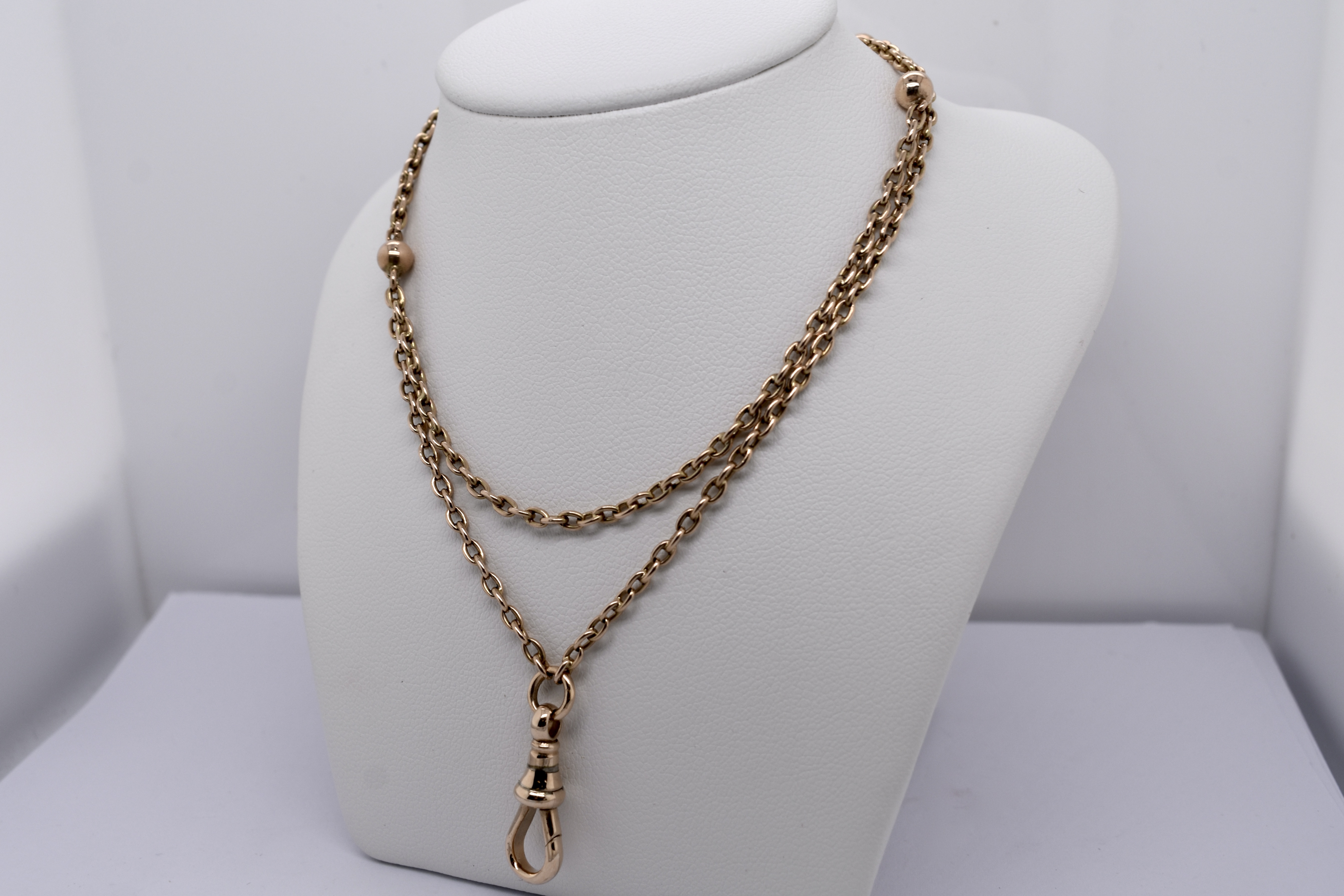 A lovely antique 9ct yellow gold muff chain in a trace link with an accent ball link set at intervals around the chain with a single swivel clasp. The chain measures 137cm and weighs 23.65grams. Muff chains make a versatile and fabulous addition to your jewellery collection and can be worn in a multitude of ways. Independent Valuation Supplied
