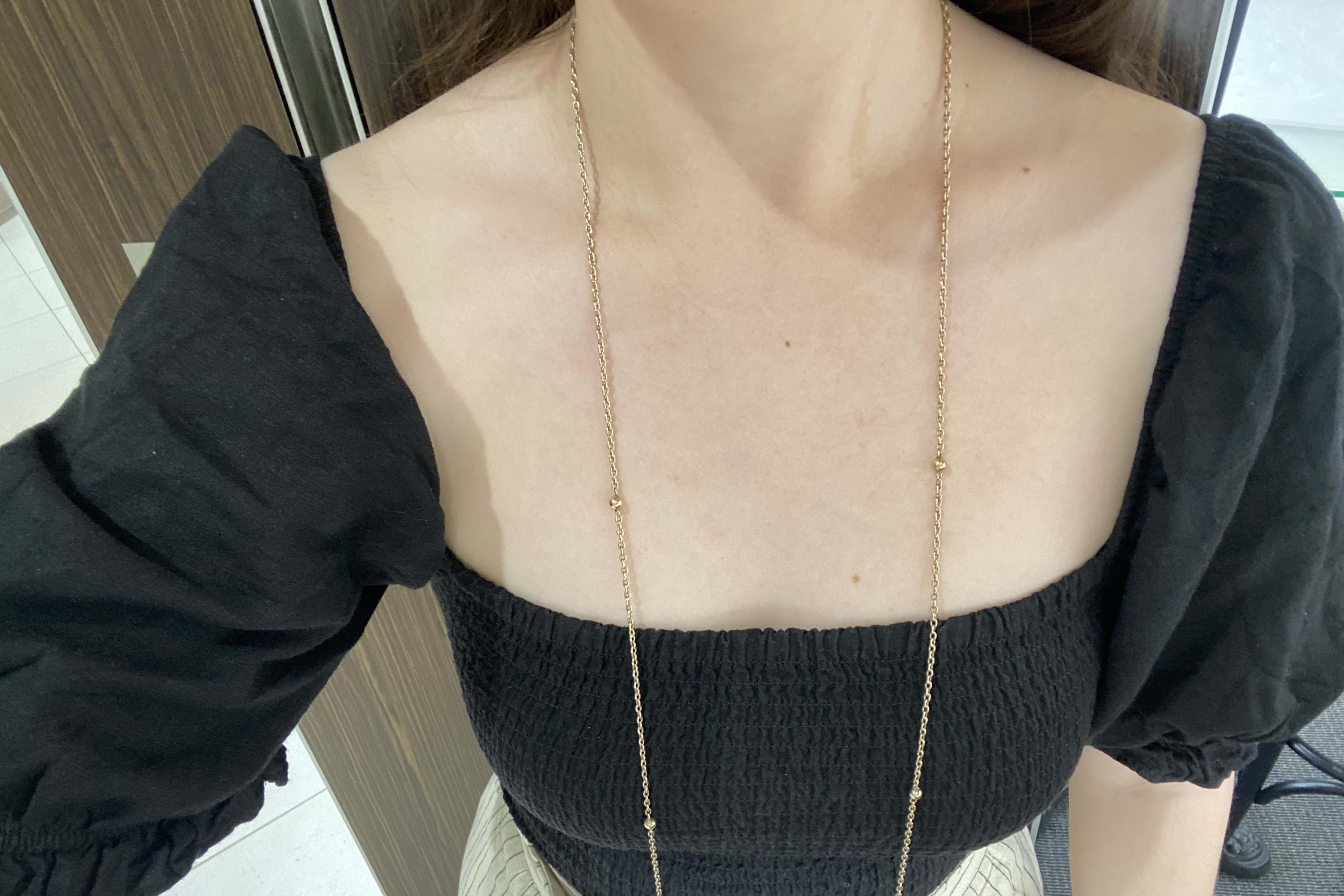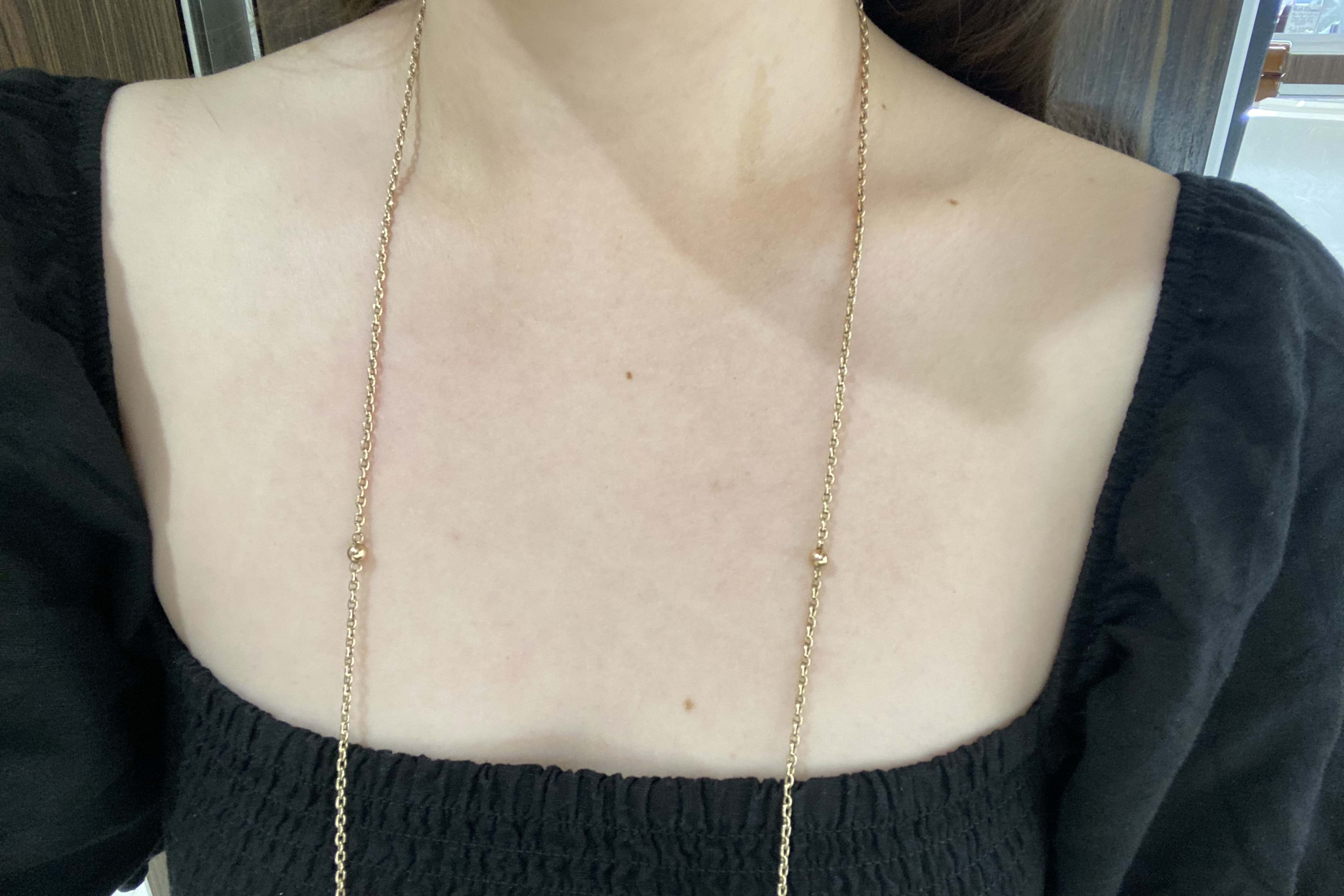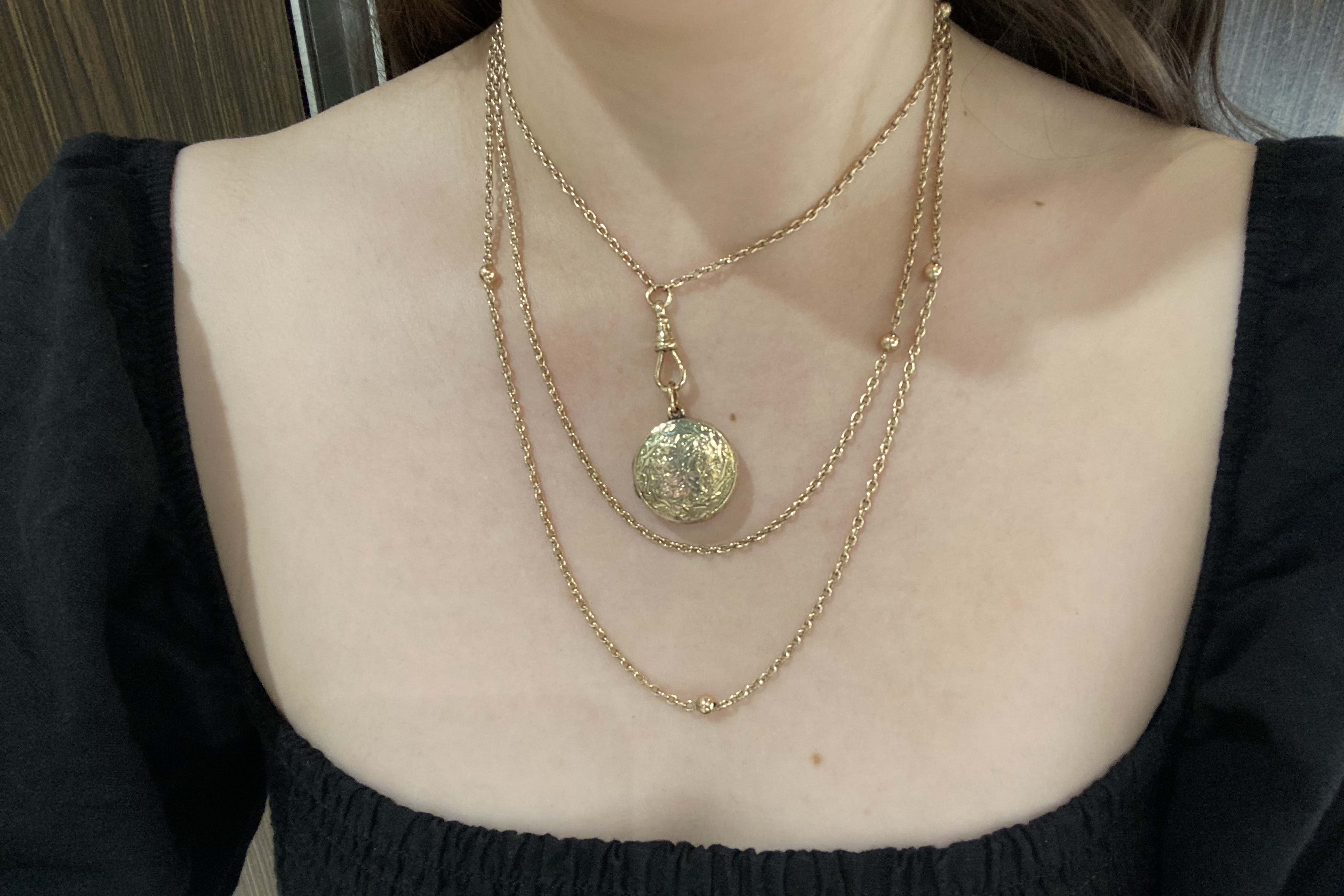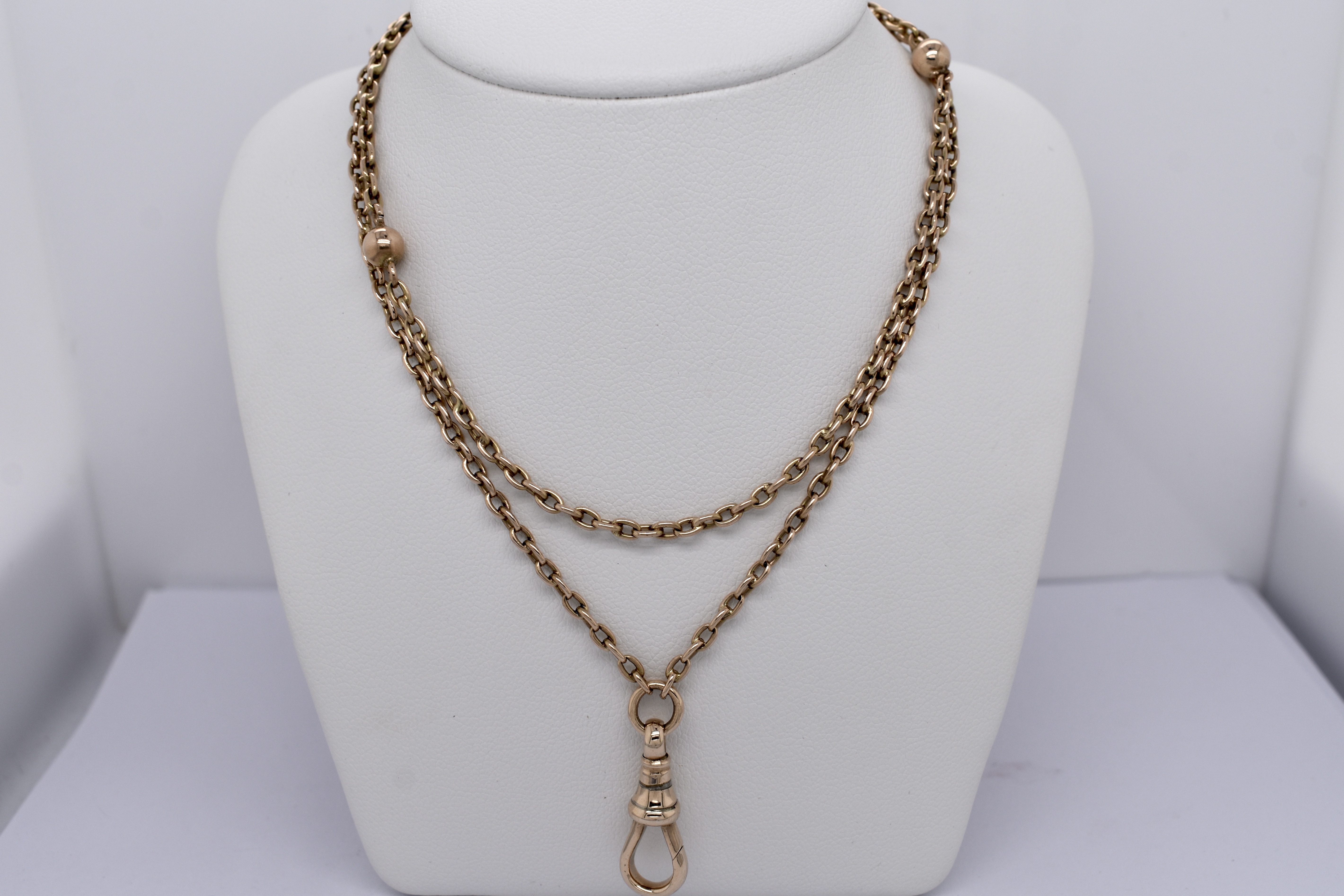 A lovely antique 9ct yellow gold muff chain in a trace link with an accent ball link set at intervals around the chain with a single swivel clasp. The chain measures 137cm and weighs 23.65grams. Muff chains make a versatile and fabulous addition to your jewellery collection and can be worn in a multitude of ways. Independent Valuation Supplied