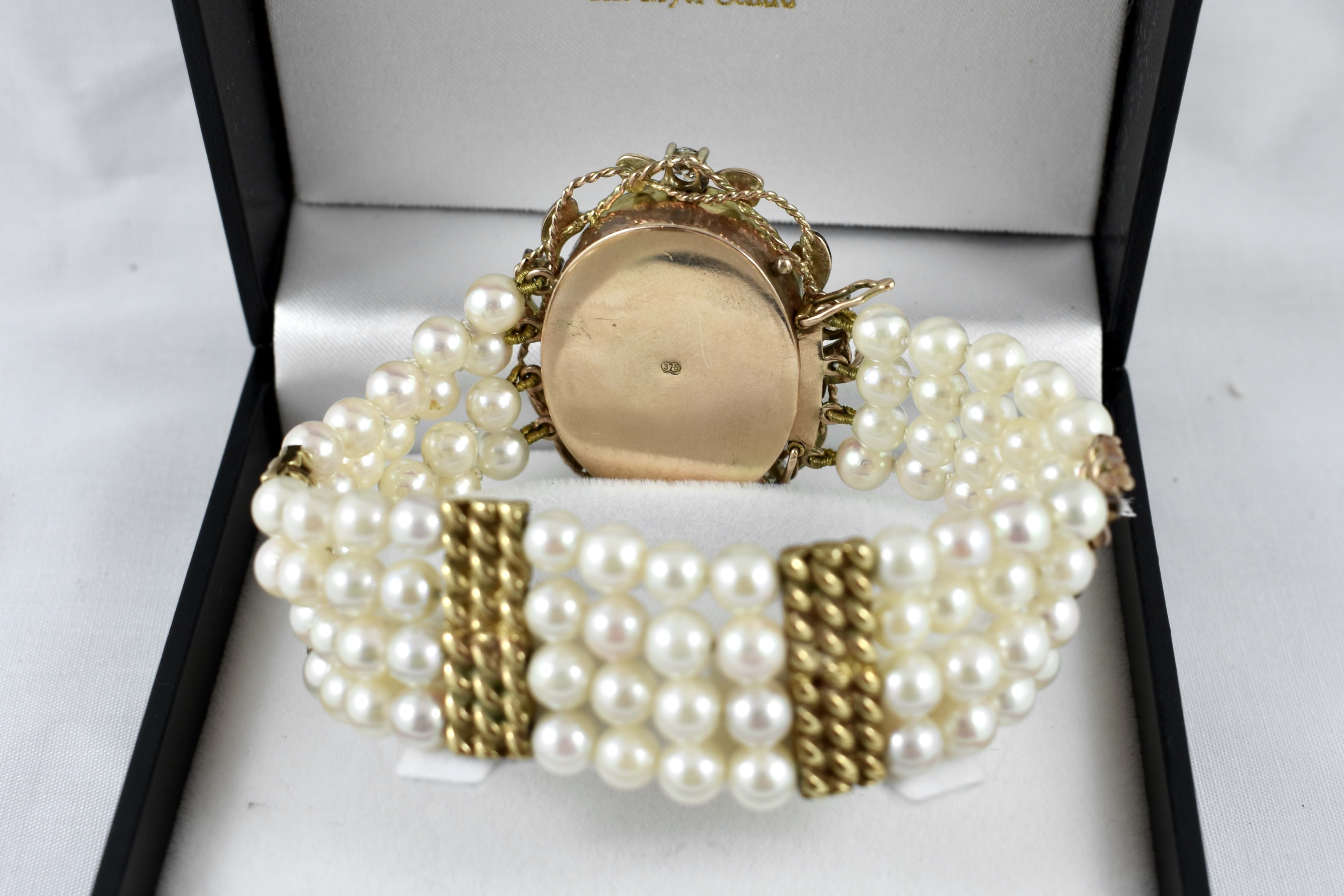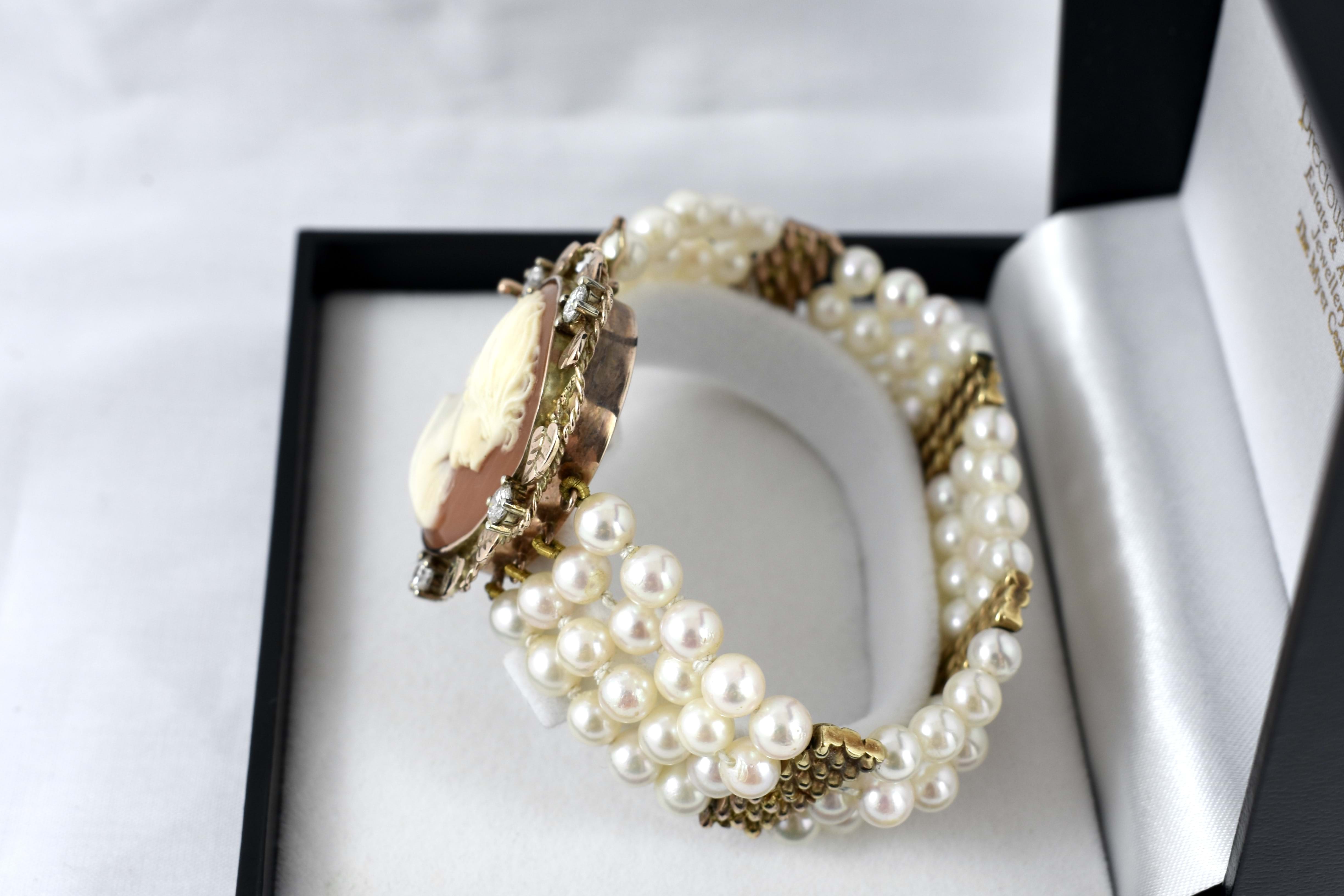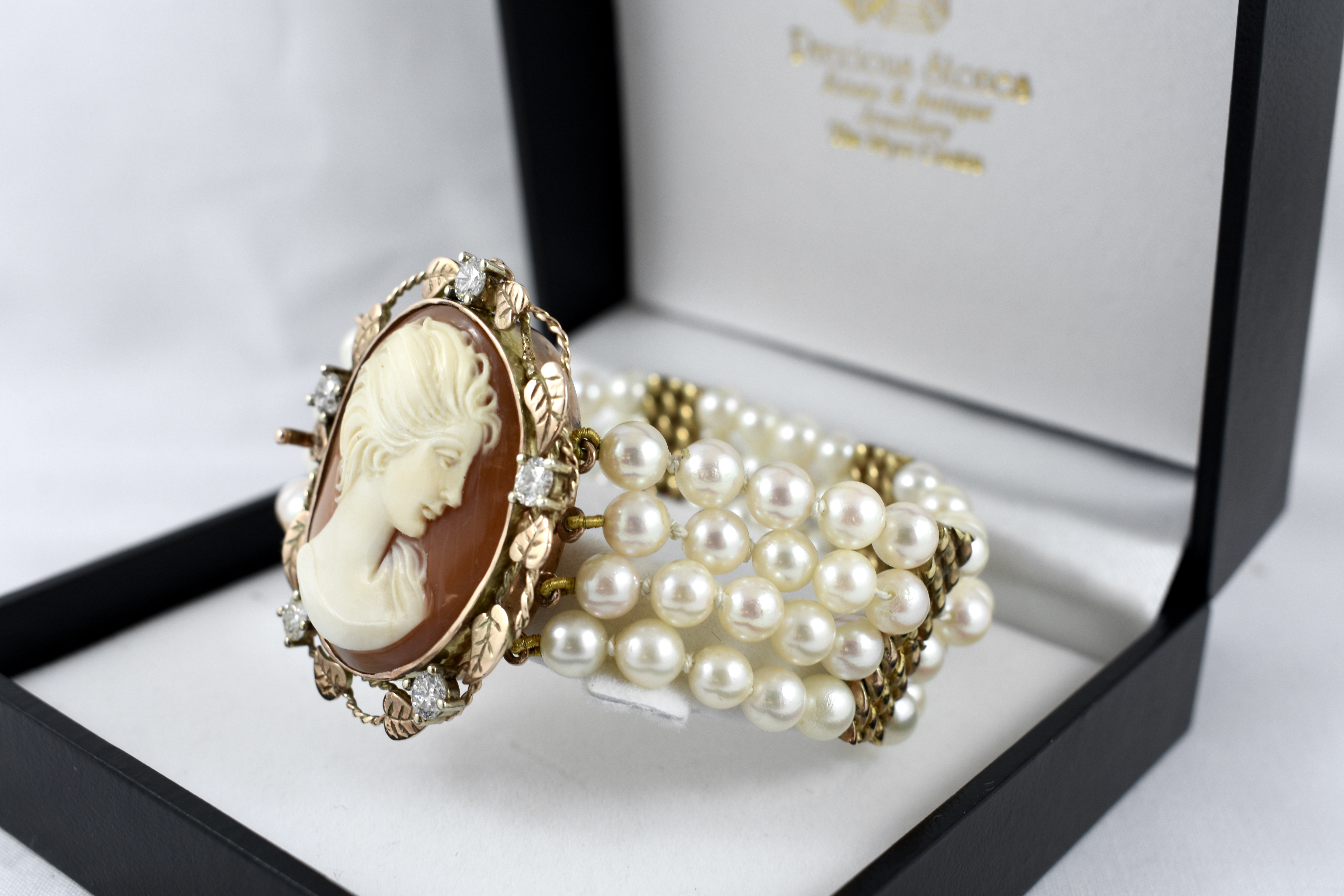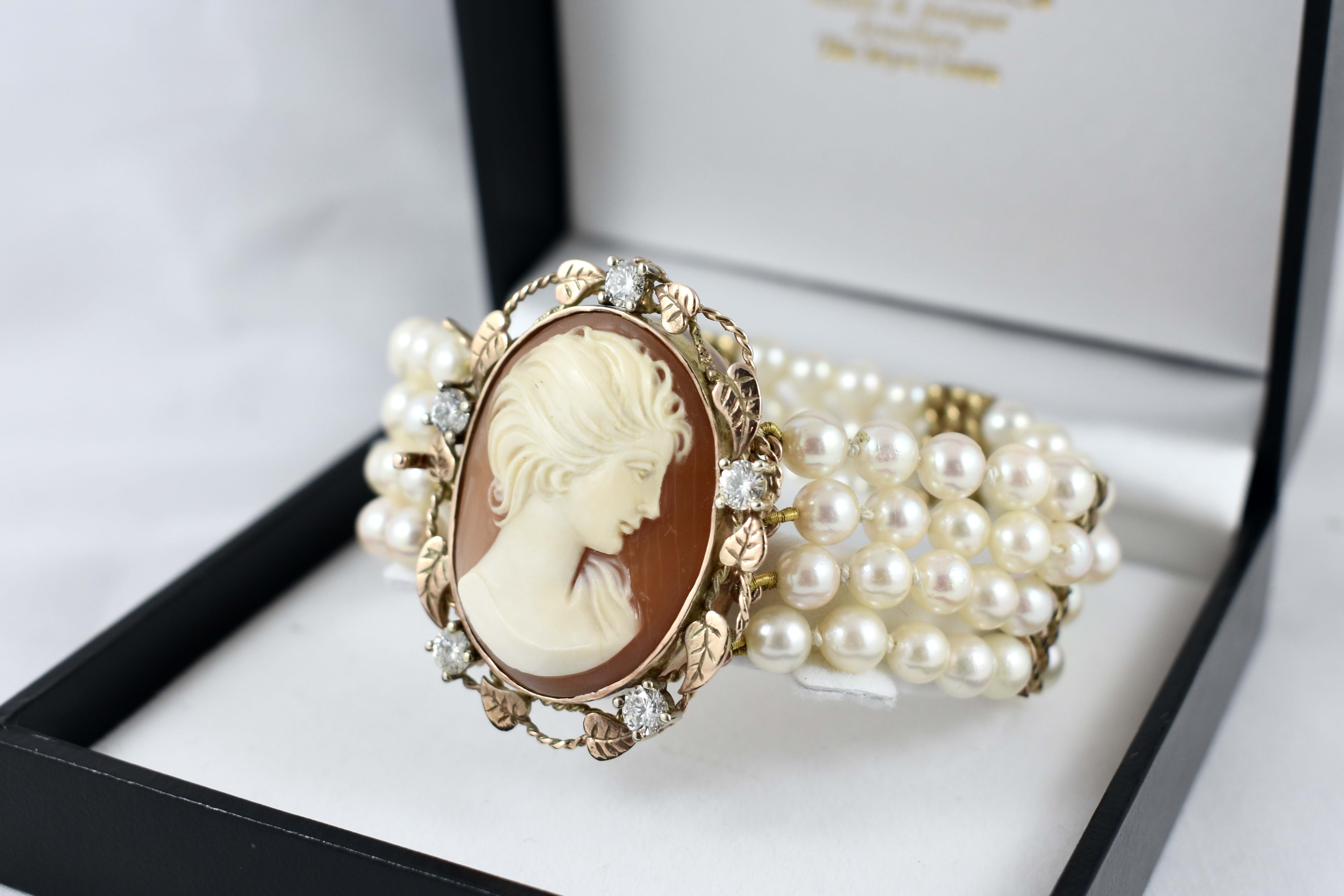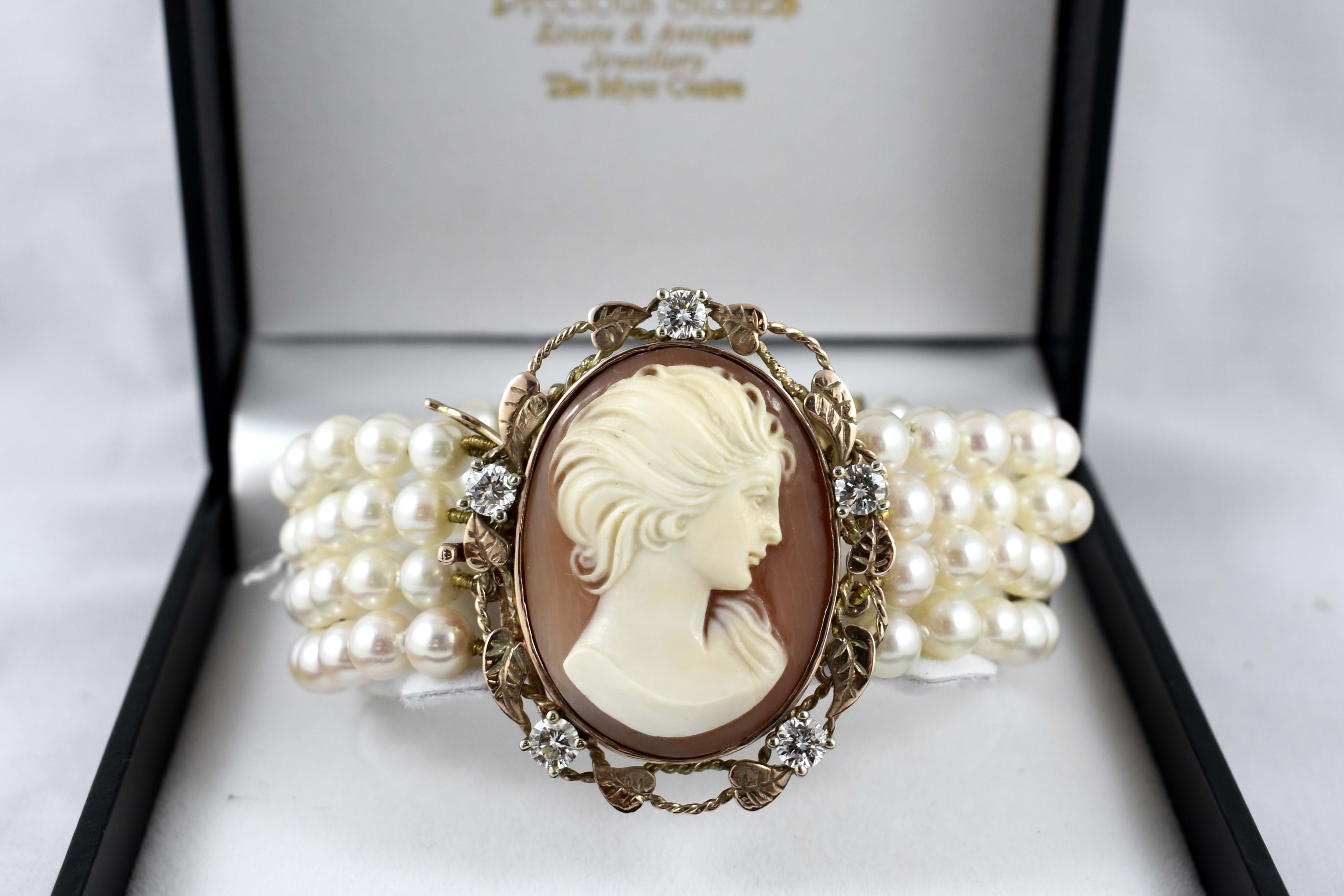 Featuring an beautiful oval cameo carving of a ladies head, with a twisted wire and leaf surround, featuring five round brilliant cut 3.65-3.80mm diamonds, totalling 1.00ct G/H SI . This stunning shell cameo is set into a 9ct yellow gold frame with four strands of 5.25-5.40mm near round Akoya pearls, as a bracelet. The pearls are sectioned around the bracelet with four twisted grooved bars and it is finished with a box clasp and two figure of eight safety catches. Length 18cm. Independent Valuation Supplied.