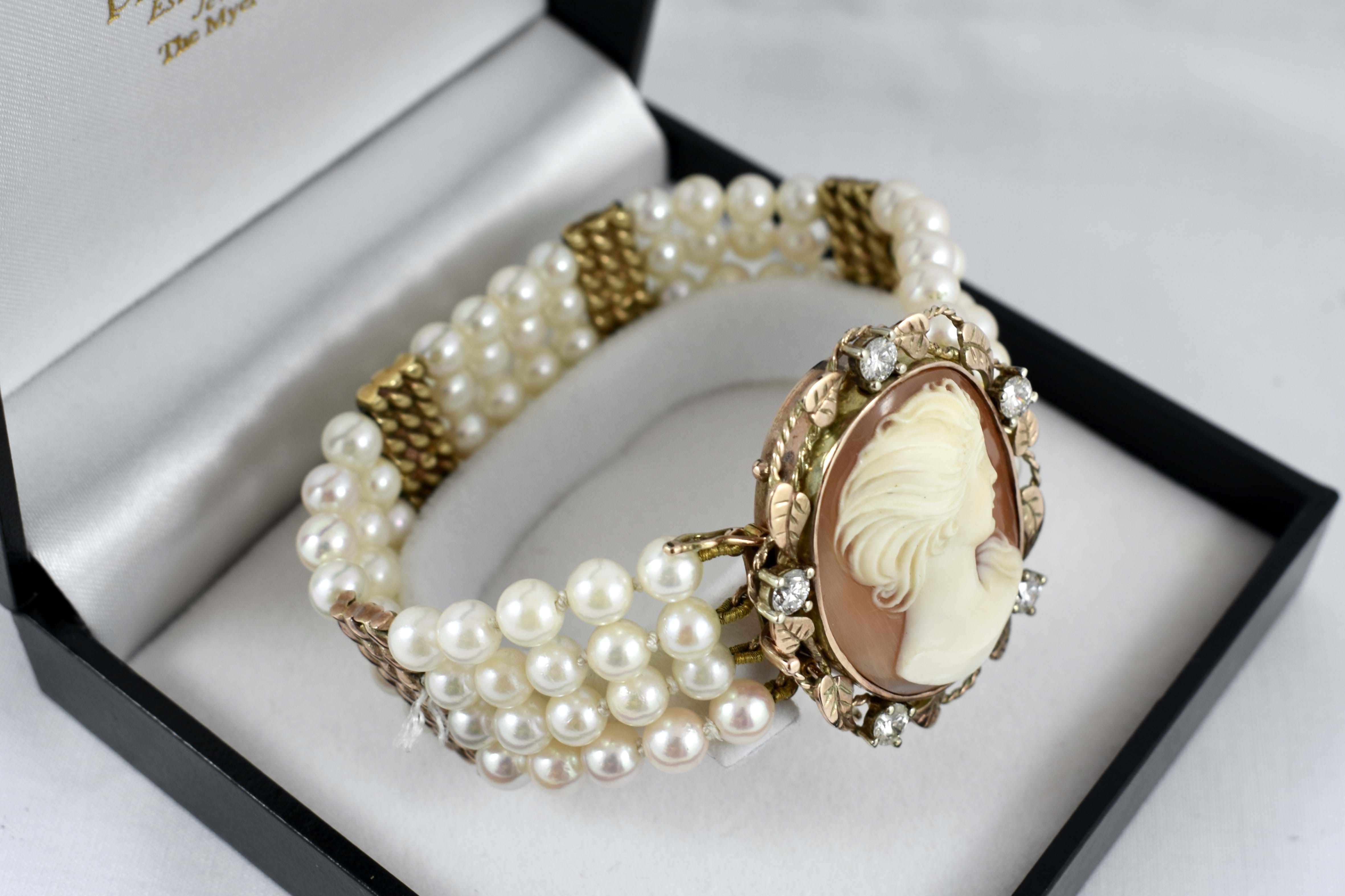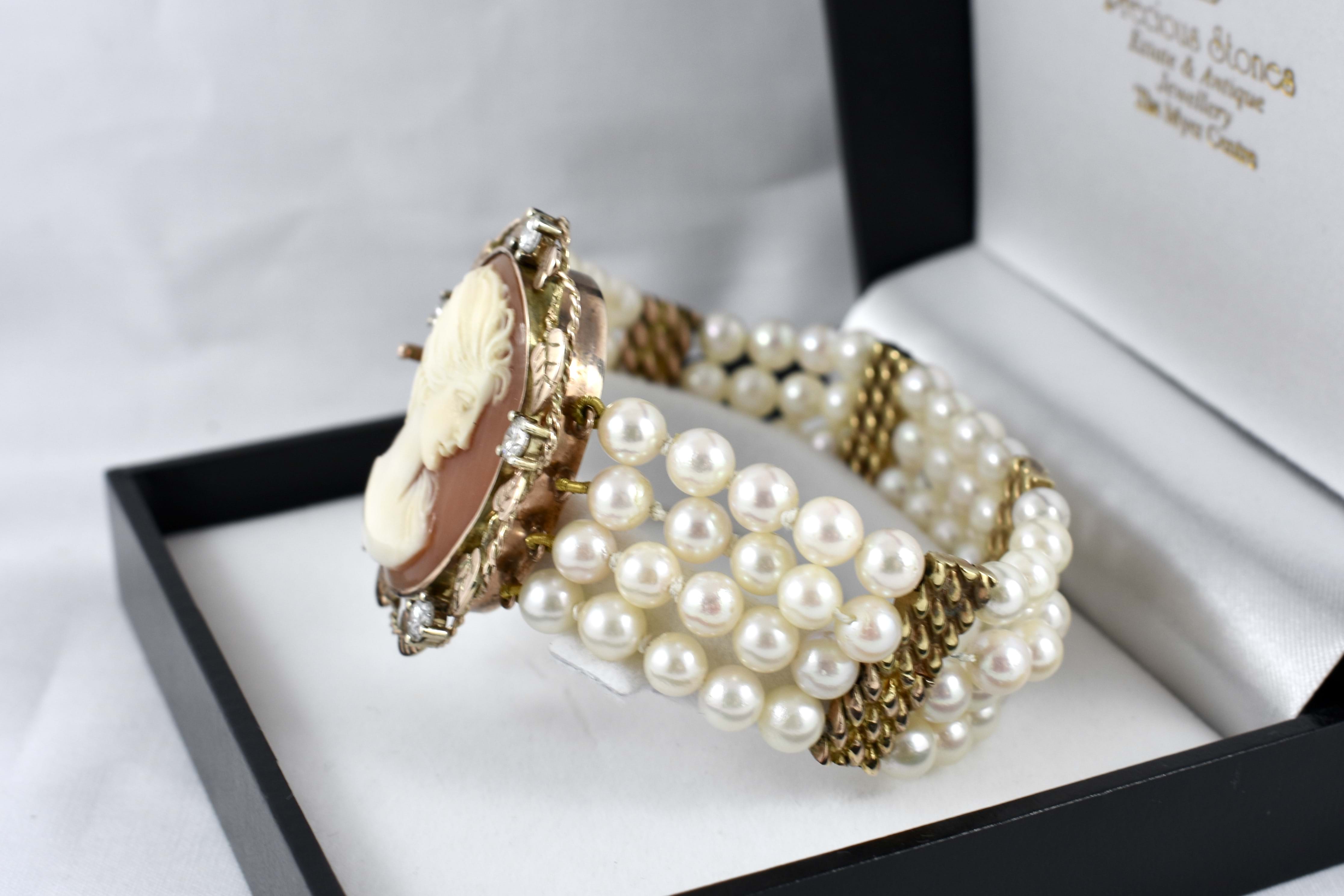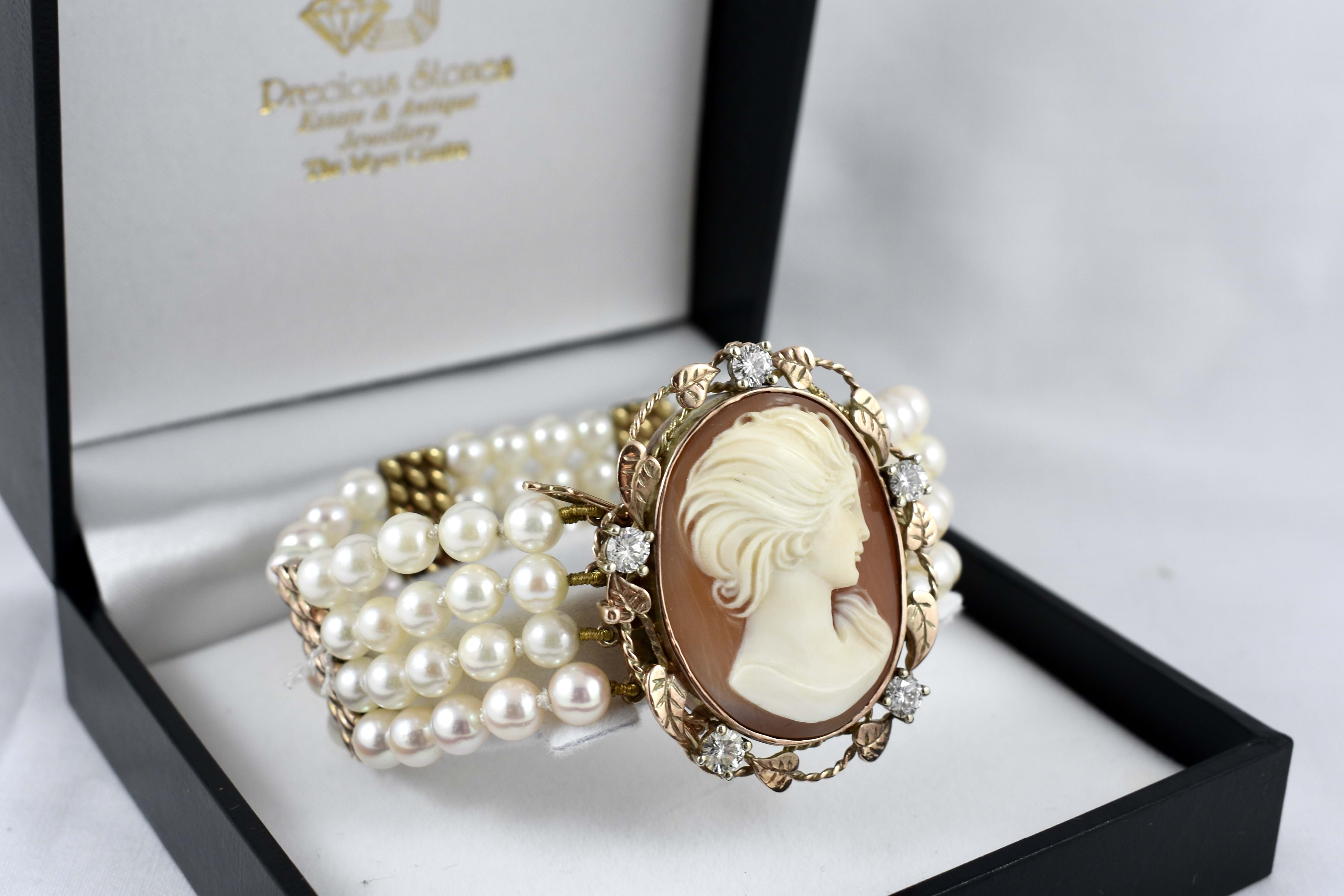 SOLD 9ct Yellow Gold Shell Cameo with Diamonds + Four Strand Akoya Pearl 18cm Bracelet