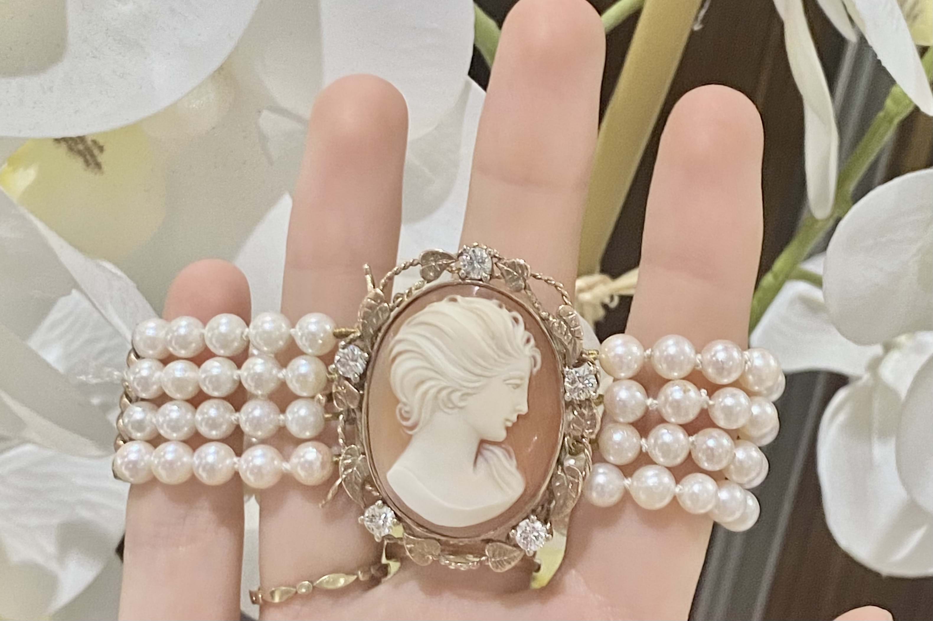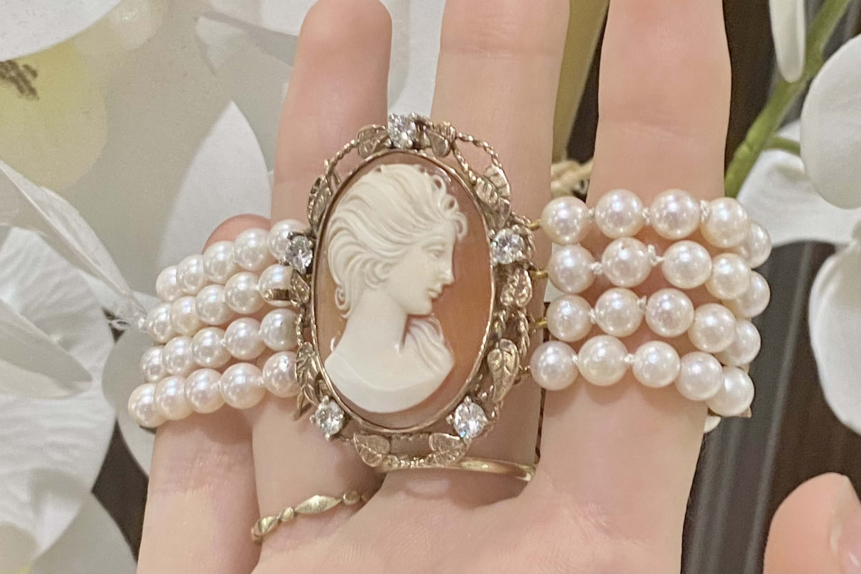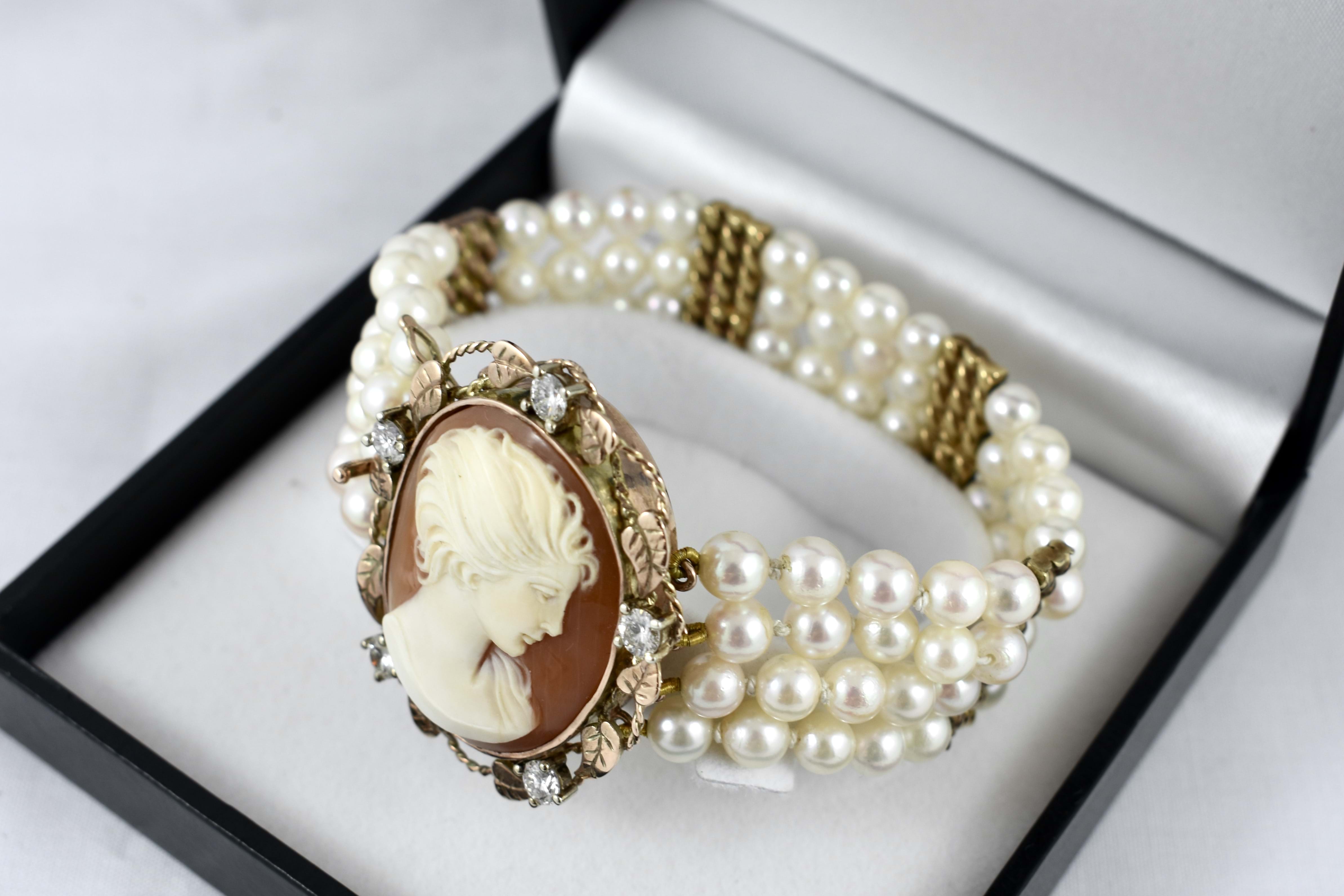 SOLD 9ct Yellow Gold Shell Cameo with Diamonds + Four Strand Akoya Pearl 18cm Bracelet