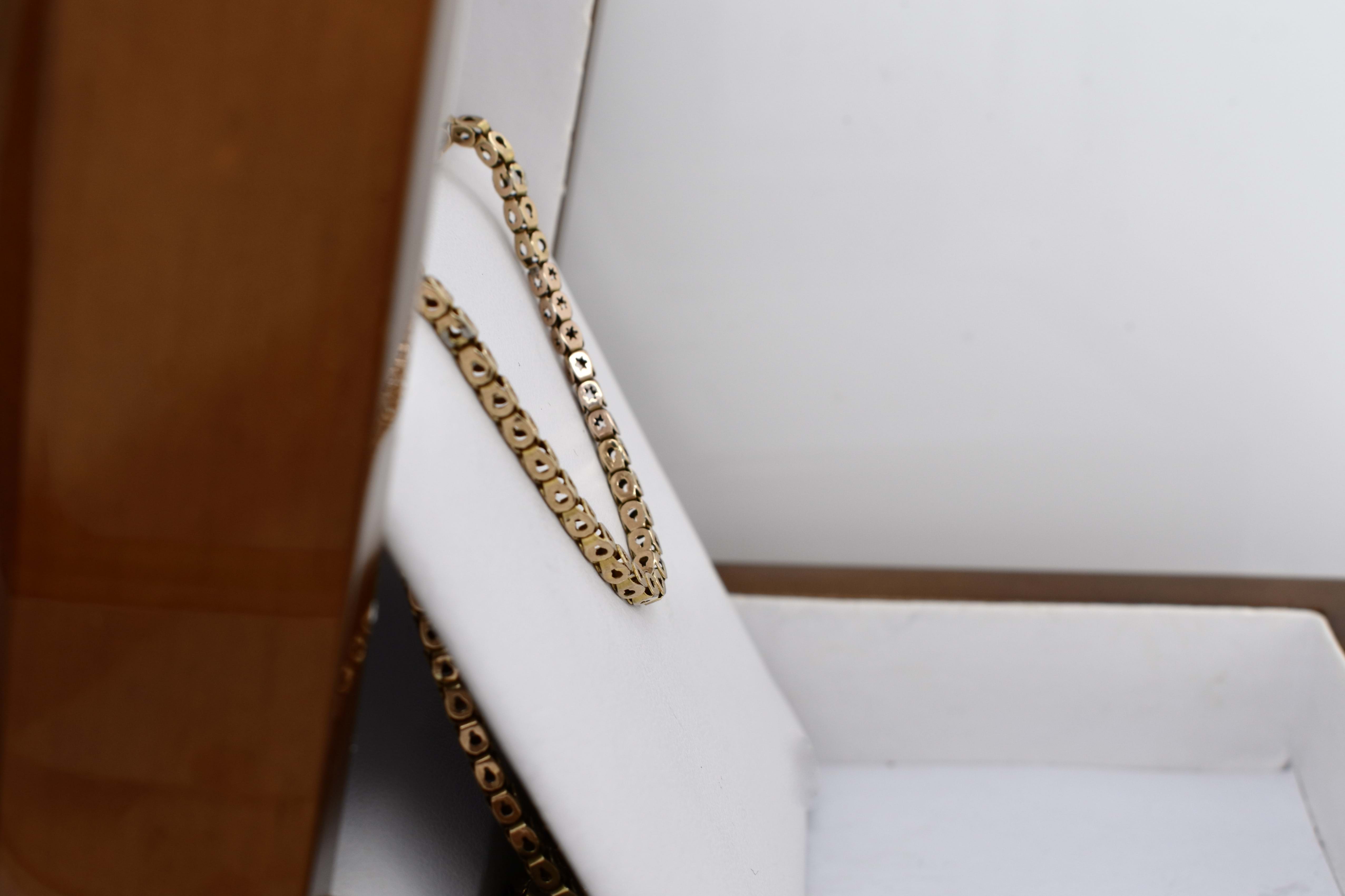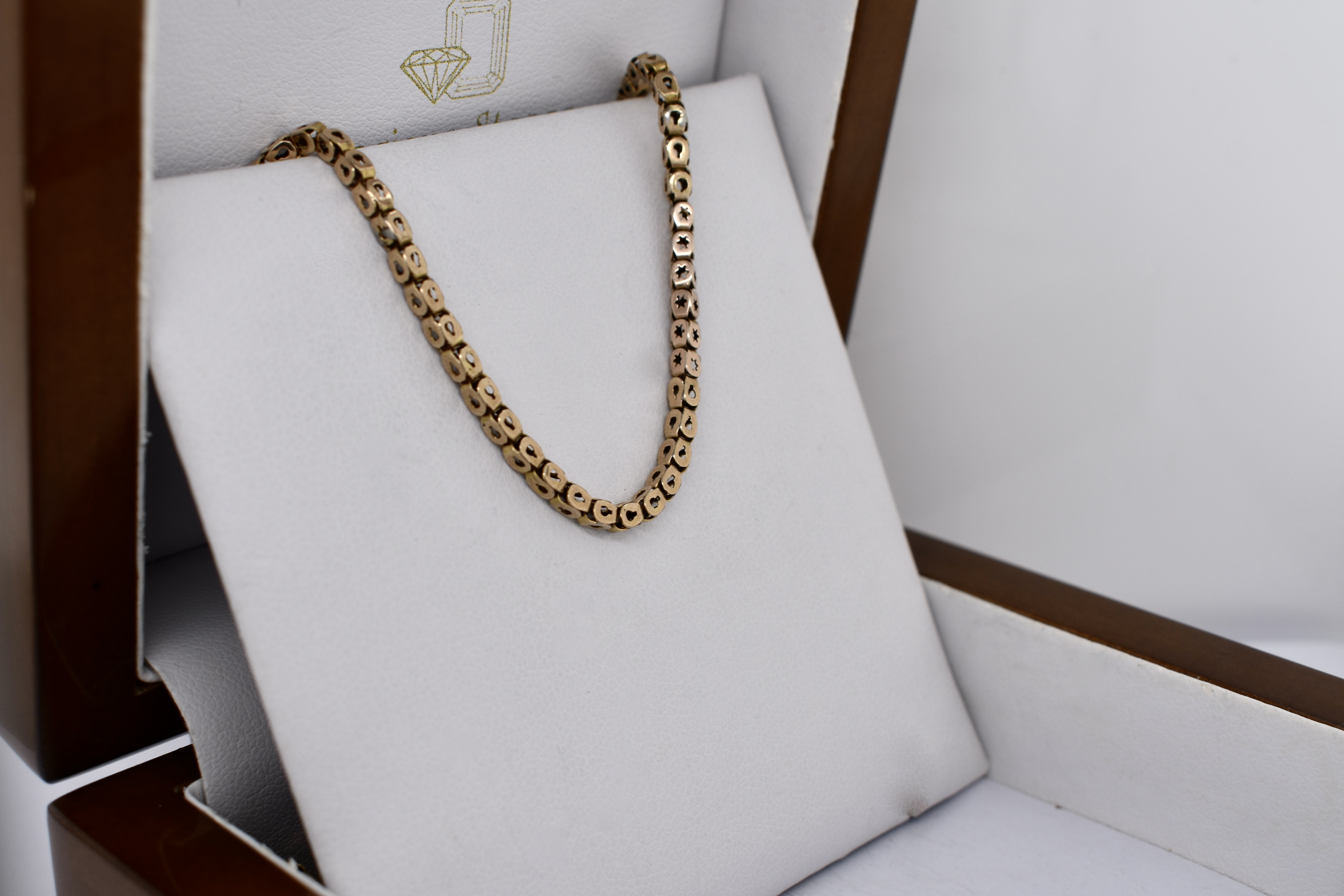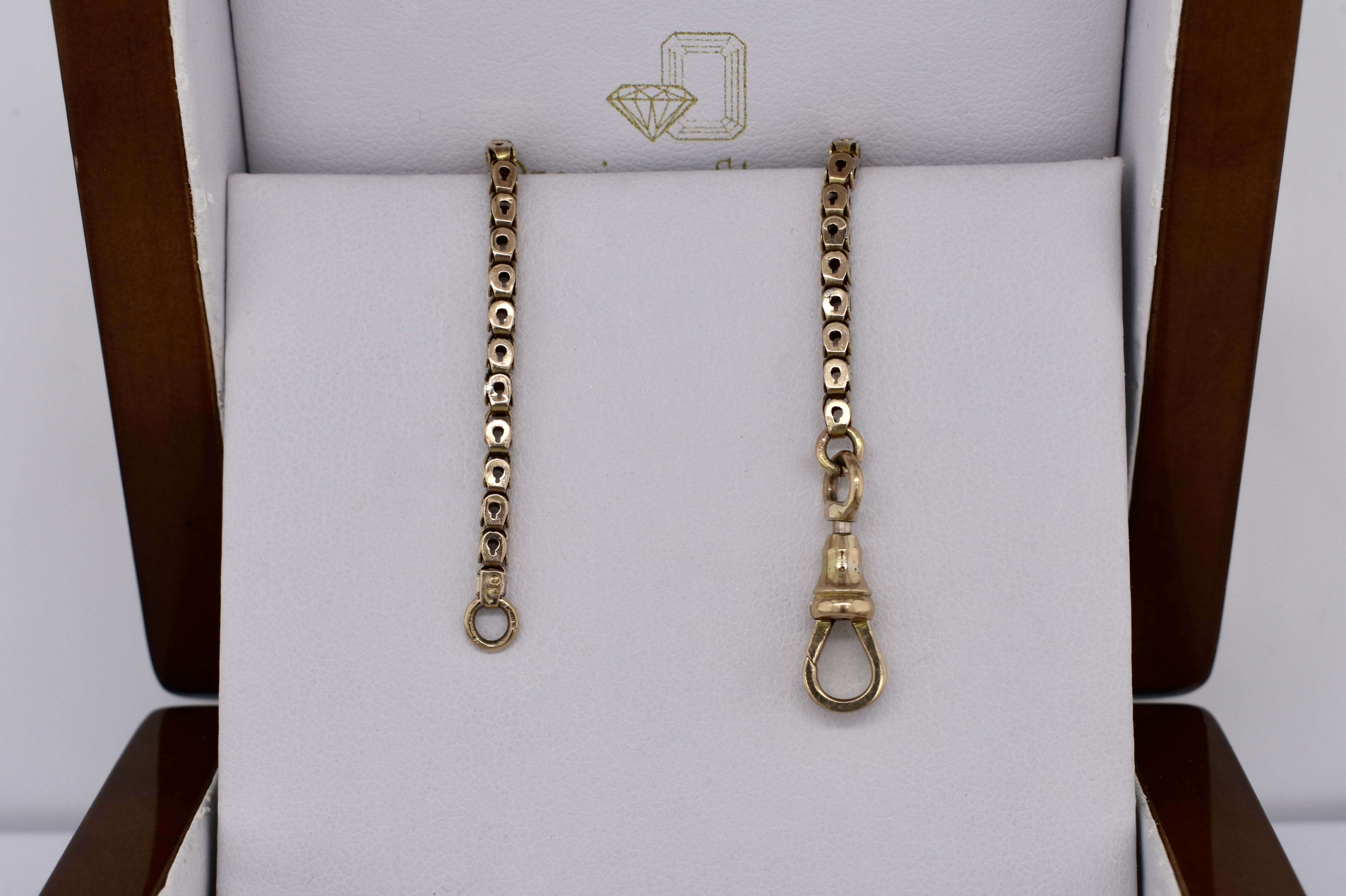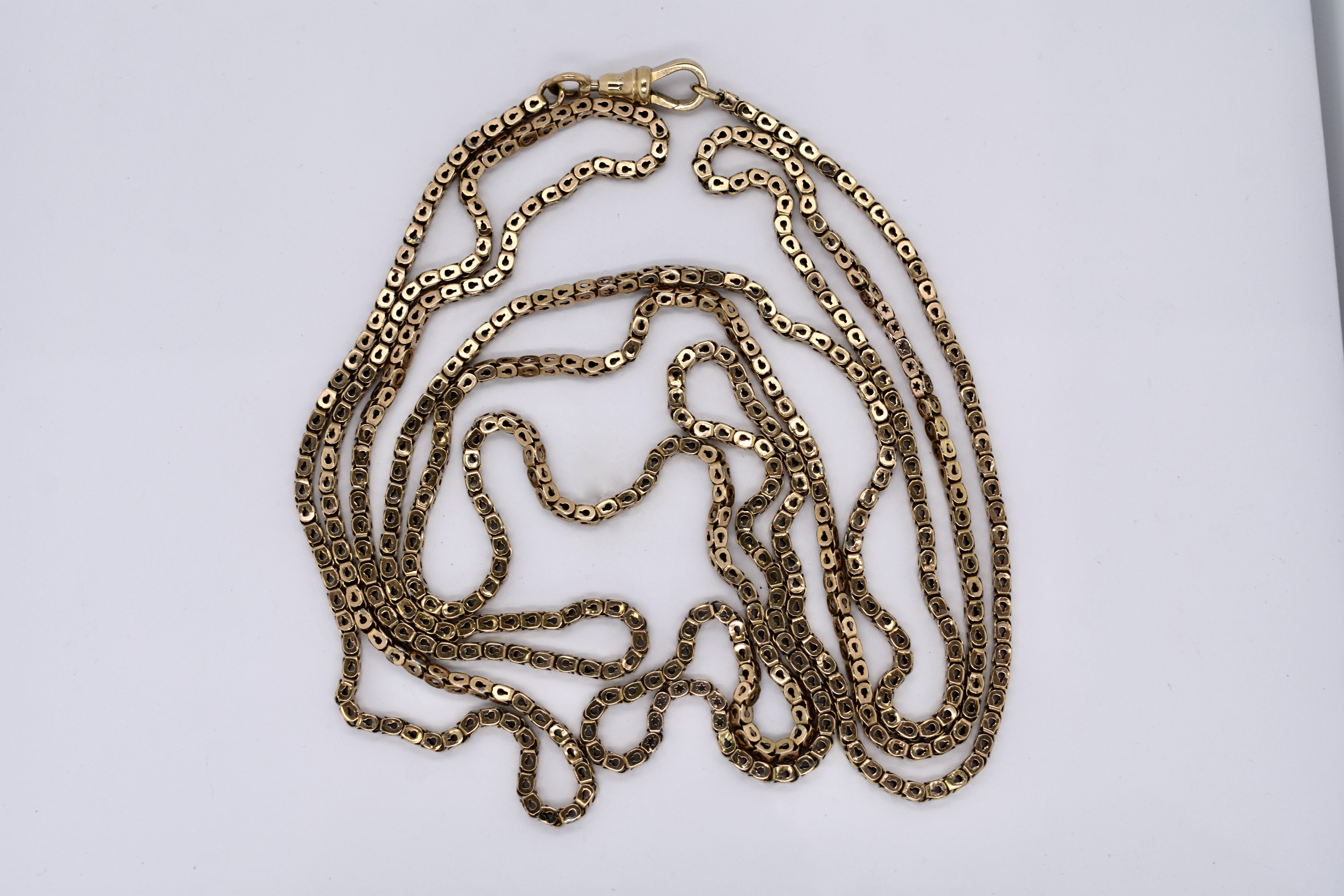 Beautiful antique 9ct yellow gold muff chain in a stunning pierced out cube link with a 21mm swivel clasp. The chain is Victorian and measures 148cm and weighs 28.46grams. Muff chains make a versatile and fabulous addition to your jewellery collection and can be worn in a multitude of ways. Independent Valuation Supplied.