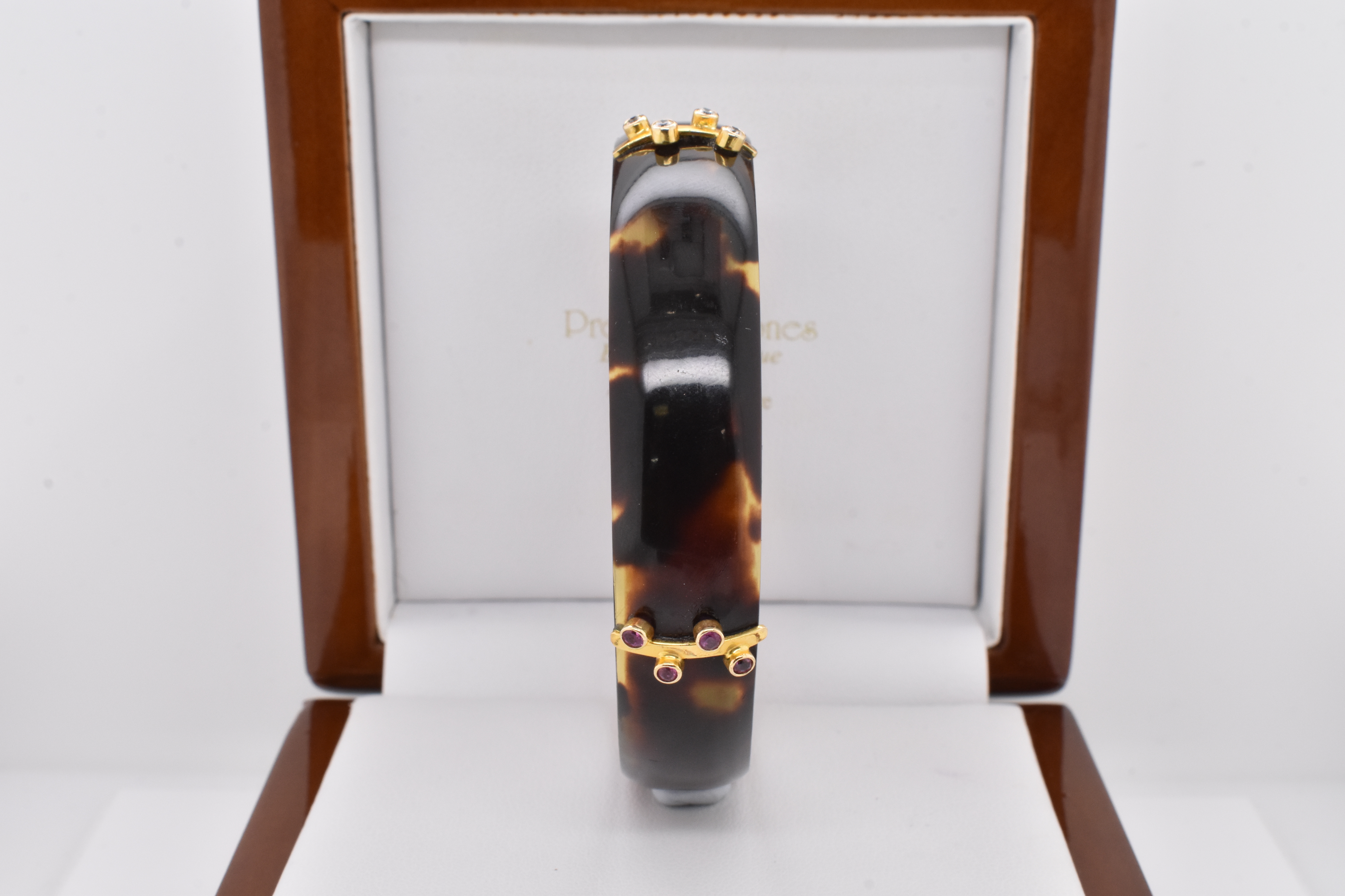 This antique bangle is crafted from tortoise shell in a slightly domed profile, with north/south/east/west 14ct yellow gold bars, bezel set with a total of eight round, pink sapphires totalling 0.40ct and eight round, colourless paste stones. Bangle is 62 x 12.5mm. Circa 1930