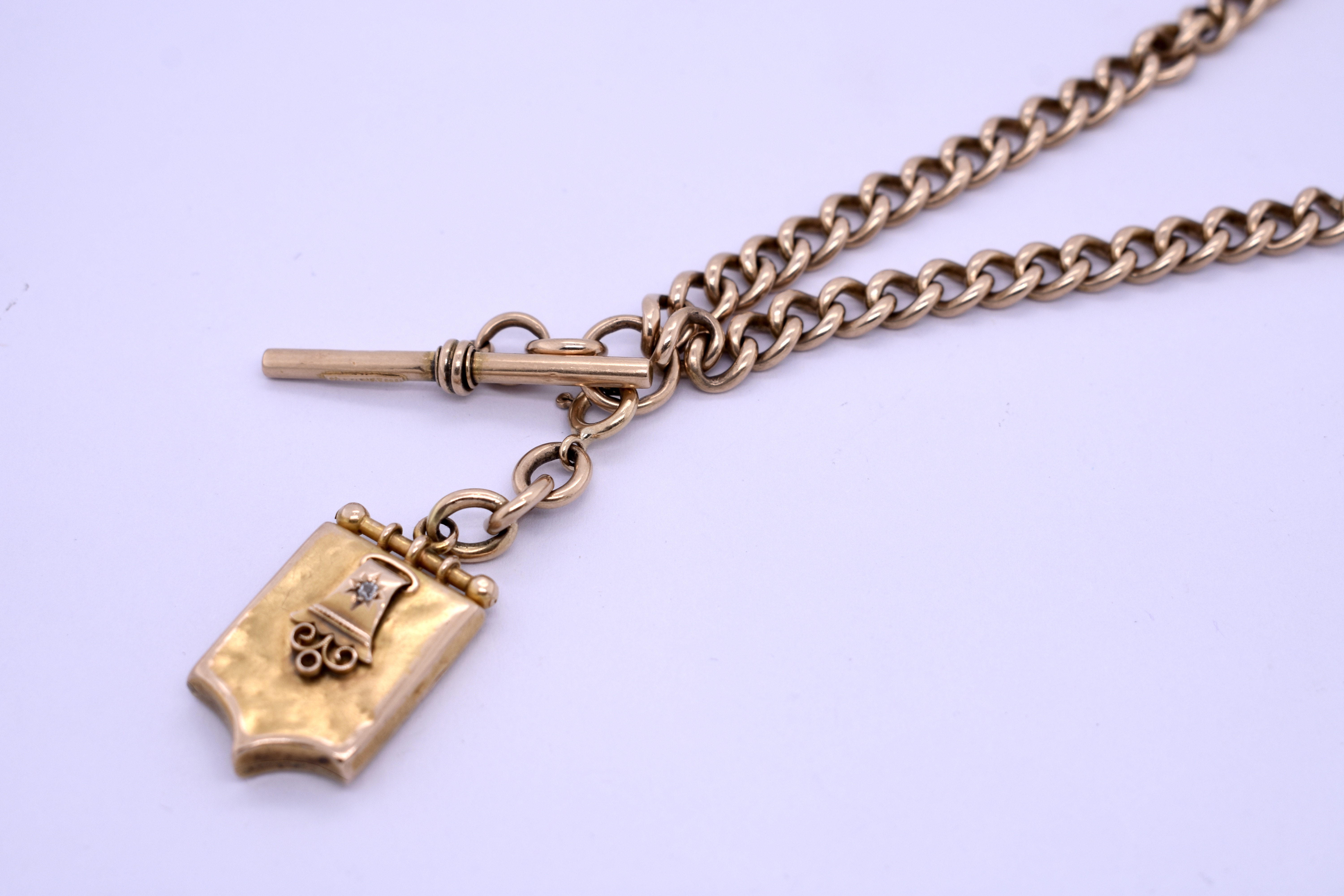 This gorgeous antique curb link chain is dated Chester 1911 and has a T-bar and locket hanging from the centre. The locket has an old European cut diamond equalling 0.05ct I P1, star grain set in the middle. Chain measures 45cm long and is completed with two swivel clasps on the ends. 60.08 grams. Independent Valuation Supplied