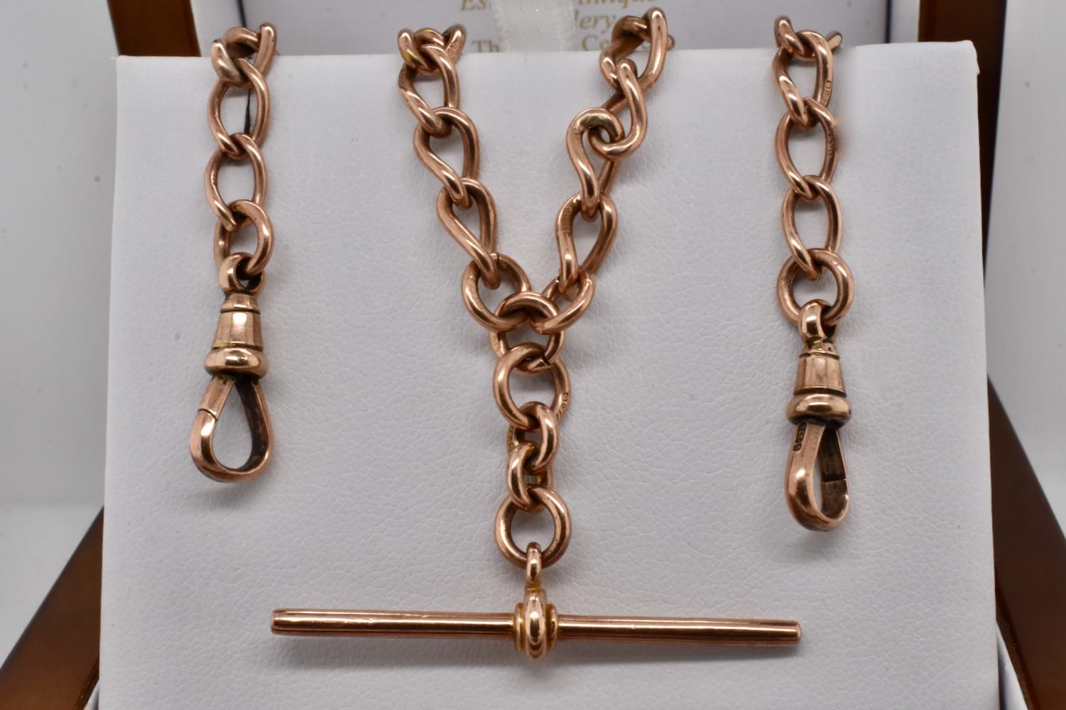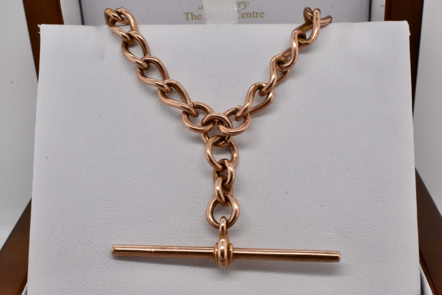 This open curb link Albert chain as been crafted in 9ct rose gold and has a Birmingham hallmark. Dated circa 1930s the chain has a fixed T-bar feature and two swivel clasps. 33.68grams. Independent Valuation Supplied