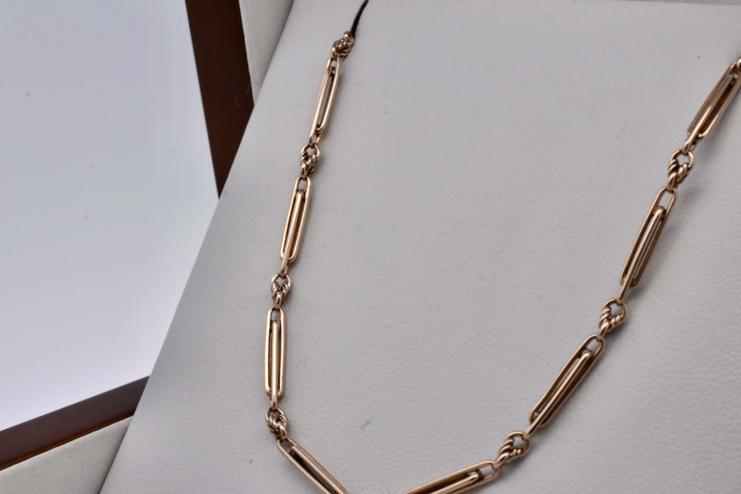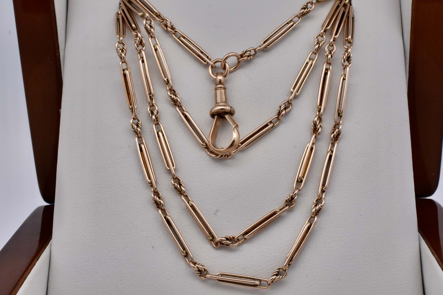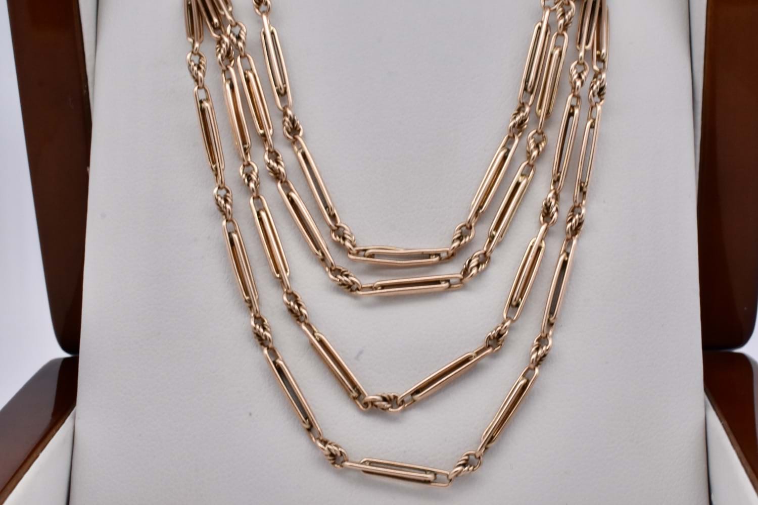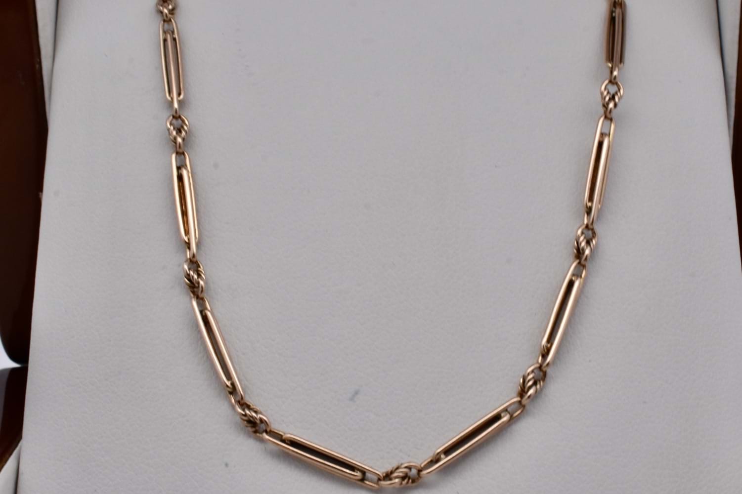 This antique 9ct yellow gold chain features a stunning combination of interlocking paperclip links and knot links, with one swivel. Chain weighs 20.01 grams and is 112cm long. Circa 1900