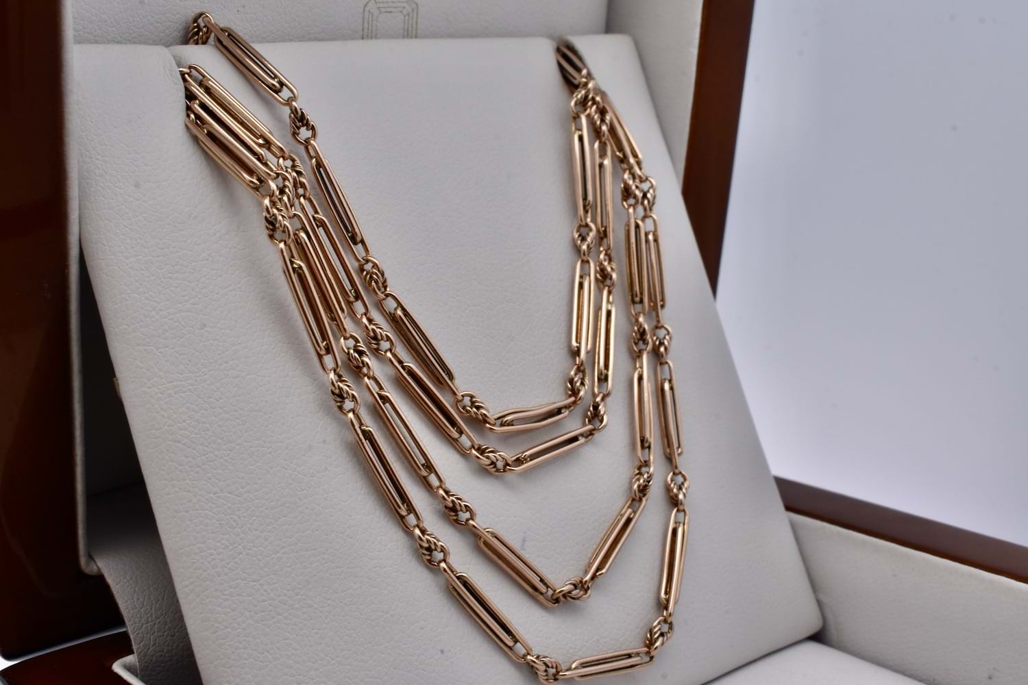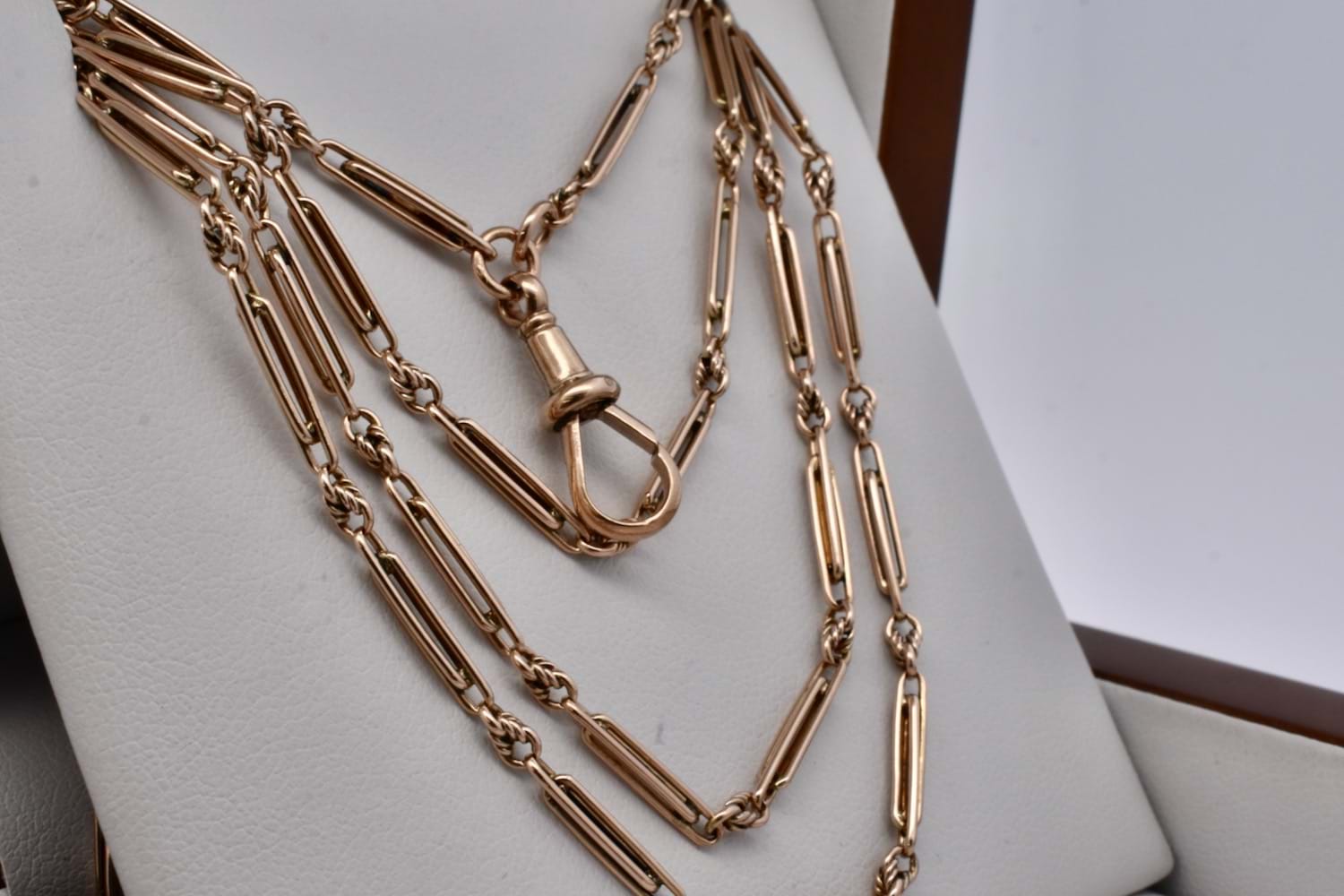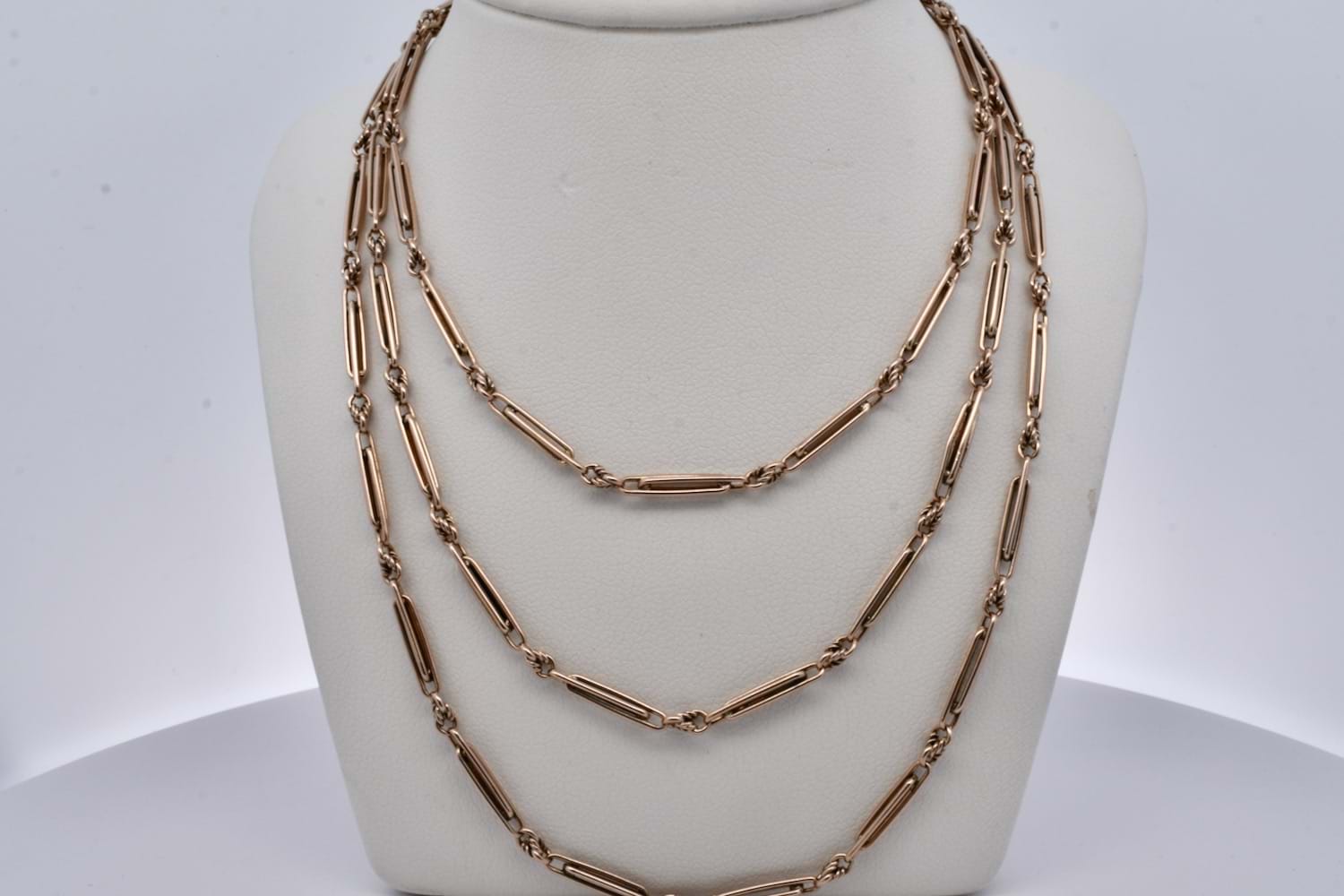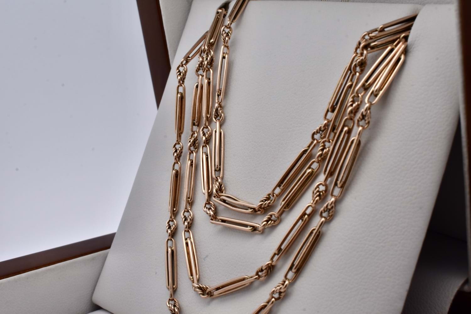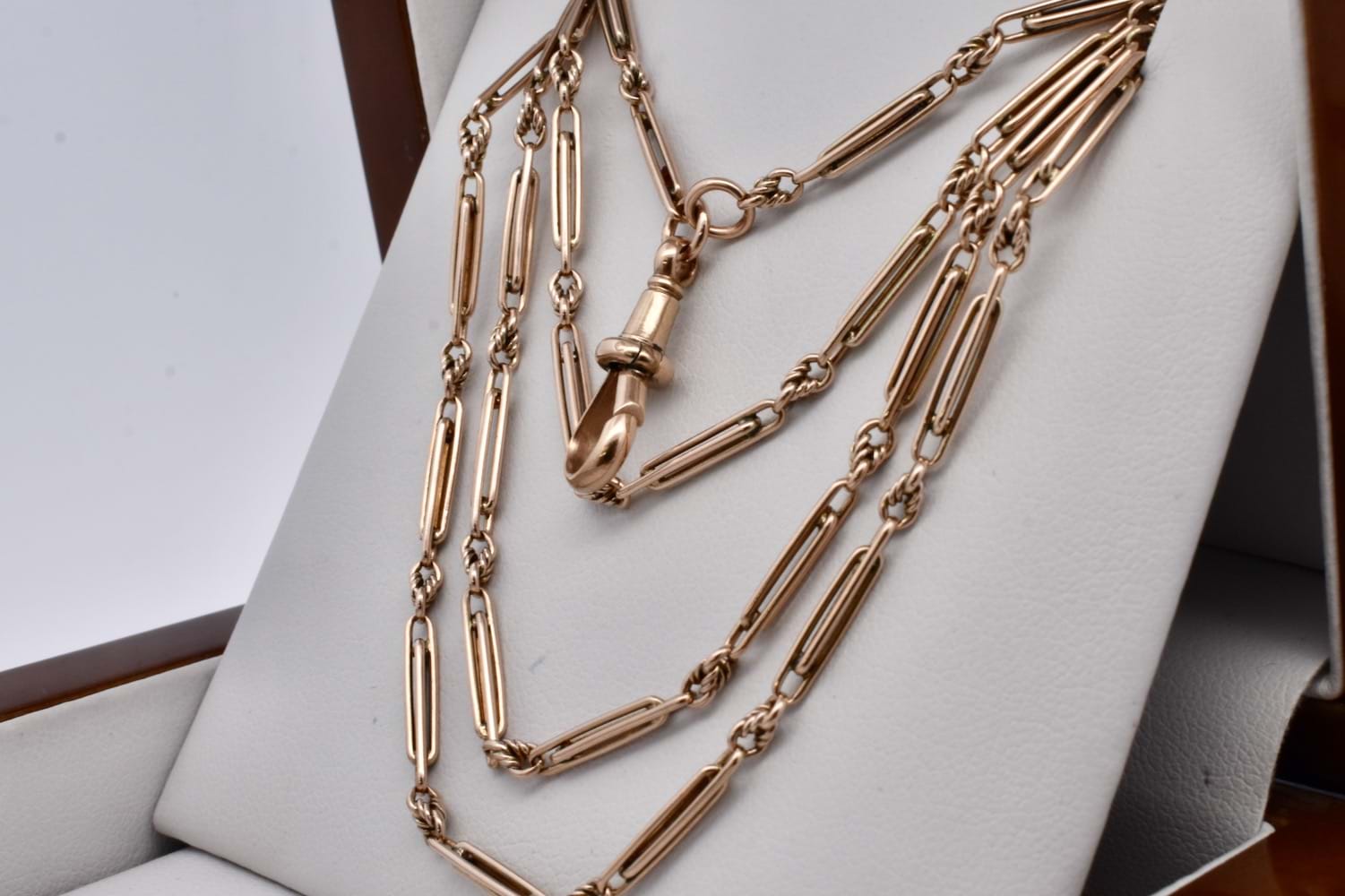 This antique 9ct yellow gold chain features a stunning combination of interlocking paperclip links and knot links, with one swivel. Chain weighs 20.01 grams and is 112cm long. Circa 1900
