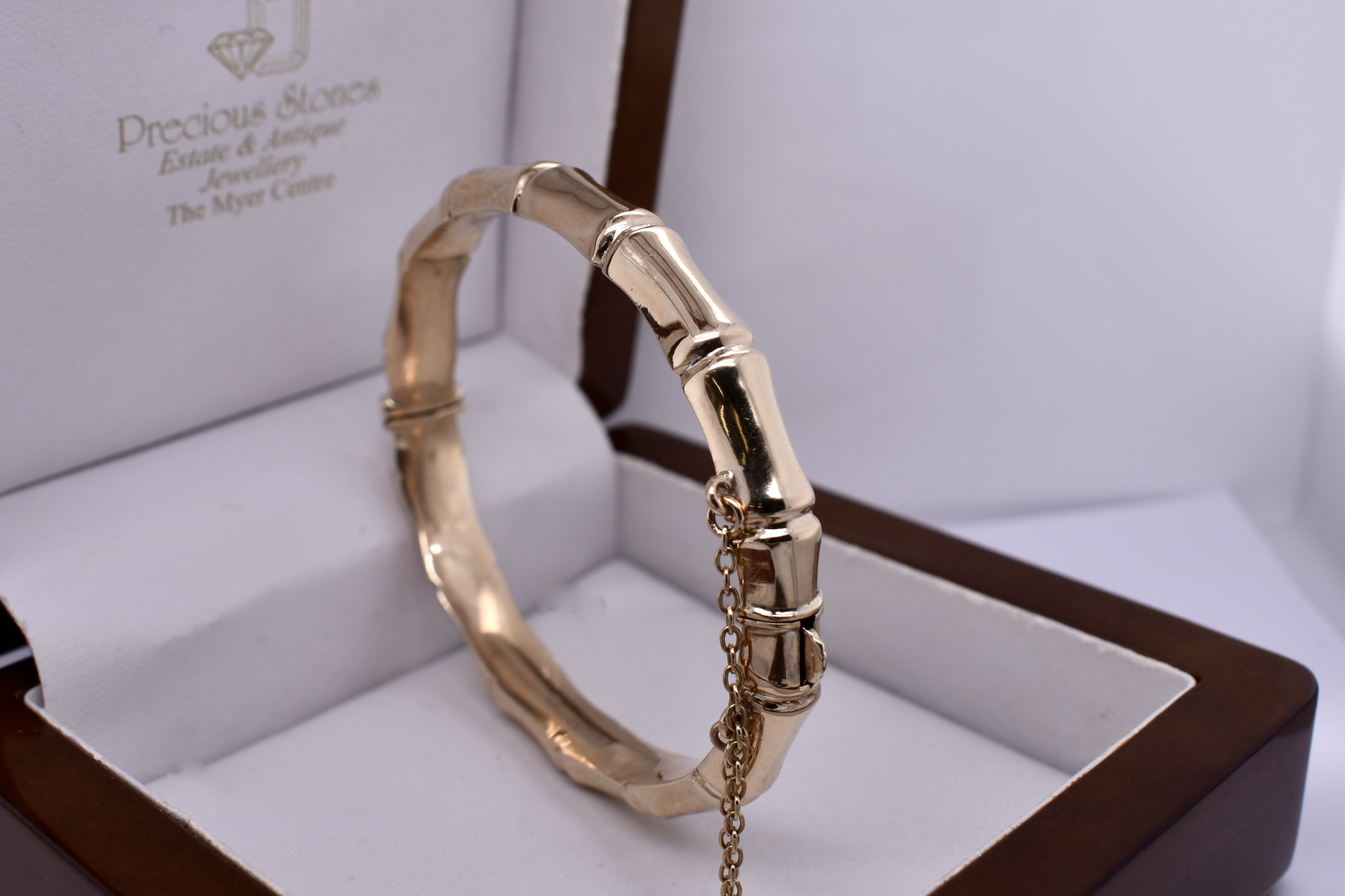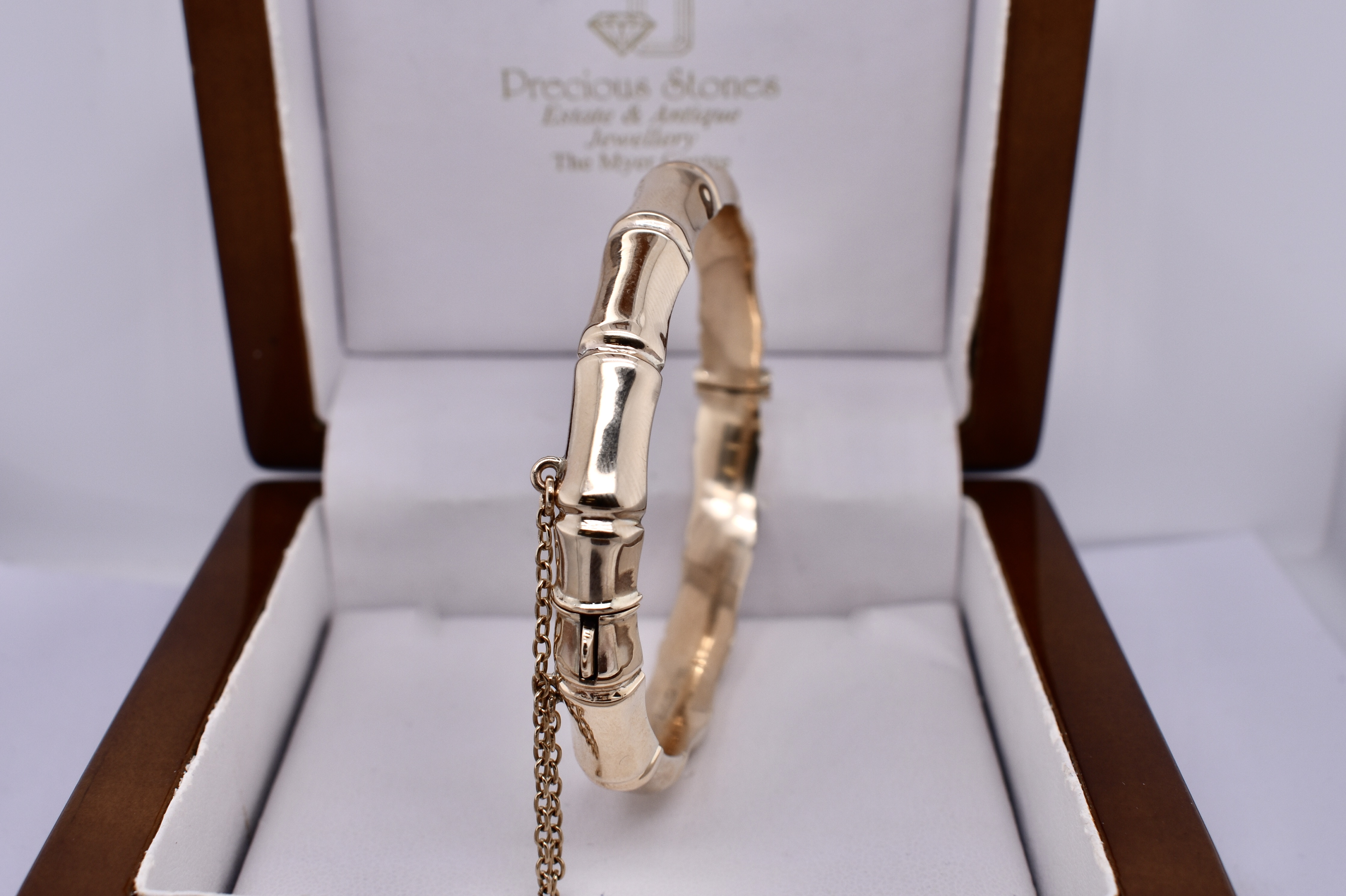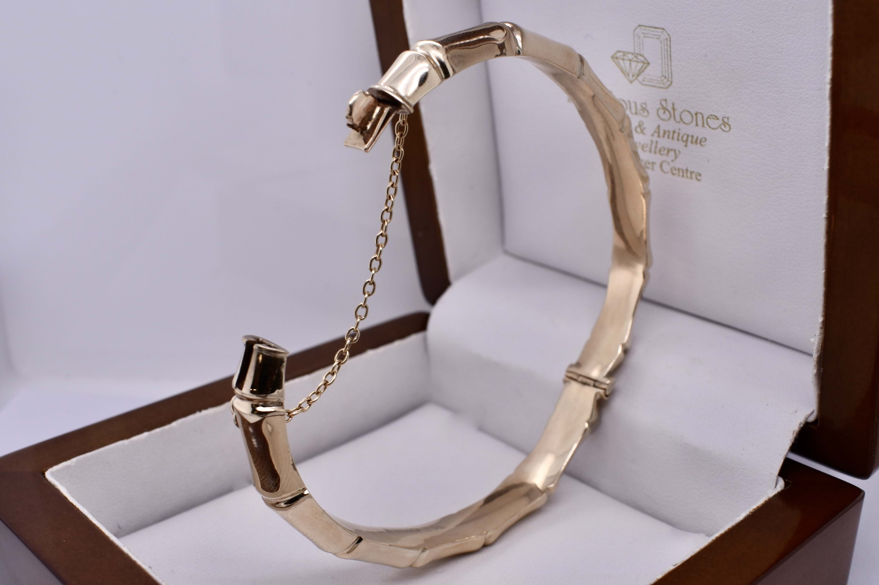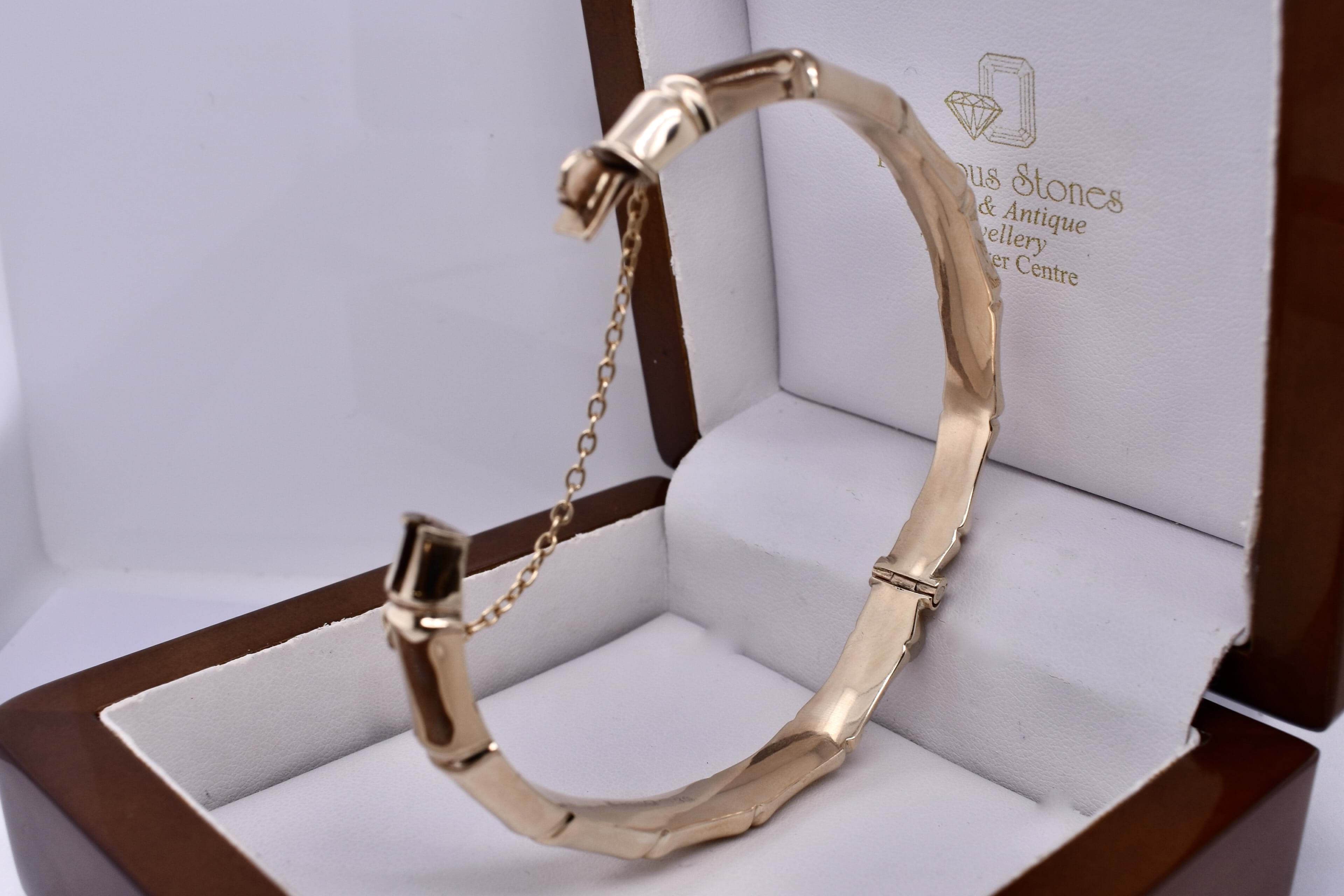 This stunning and very sought after bamboo style 9ct yellow gold hollow hinged bangle is in excellent condition. Measuring 8.11mm wide, with an internal diameter of 64x53mm. Completed with a concealed box clasp and safety chain. Hallmarked Birmingham 1978, the perfect bangle for a vintage/antique jewellery lover. Independent Valuation Supplied