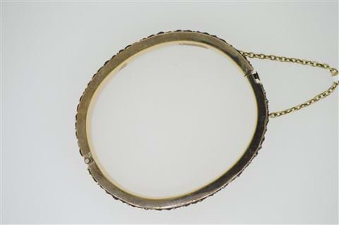 A stunning antique gold cased hinged bangle encrusted with 182 Bohemian Garnets in three rows on both sides. This piece is dated circa 1880's and comes with an Independent Valutation.