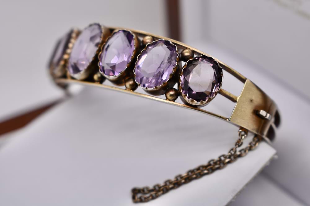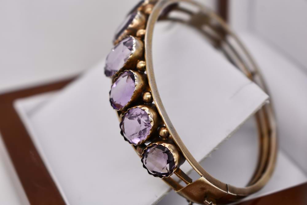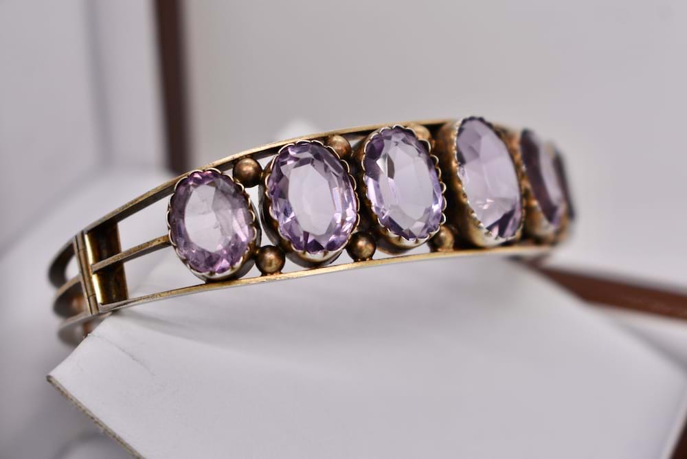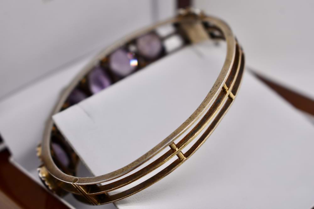 This antique hinged bangle is silver gilt and features seven graduated natural amethysts individually bezel set across the top half of the bangle. With a total of 25.20cts of amethyst and dated circa 1900 this bangle is a beautiful antique addition to any collection. Largest amethyst measures 14x10mm tapering down to smallest amethysts 10.5x8.5mm. Independent Valuation supplied