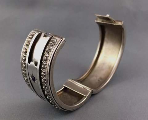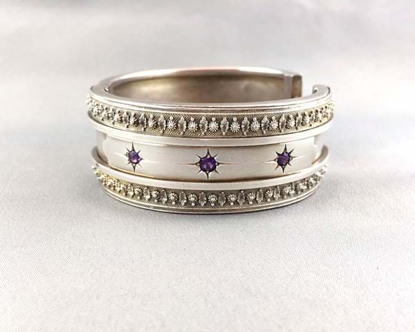 Striking Silver Victorian bangle, featuring three Amethysts'. Circa 1880