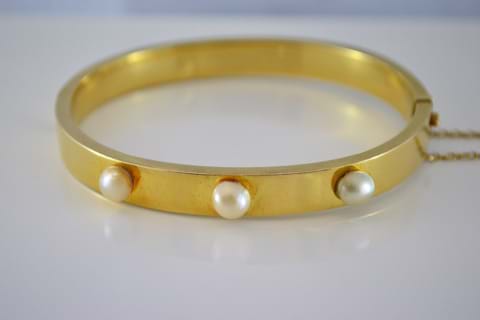 This genuine Hardy Brothers vintage bangle is crafted in 18ct yellow gold and features three creamy white keshi pearls. With a square profile this hinged bangle has a tongue & groove fitting with a safety chain. The perfect gift for the girl who loves vintage! Independent Valuation Supplied