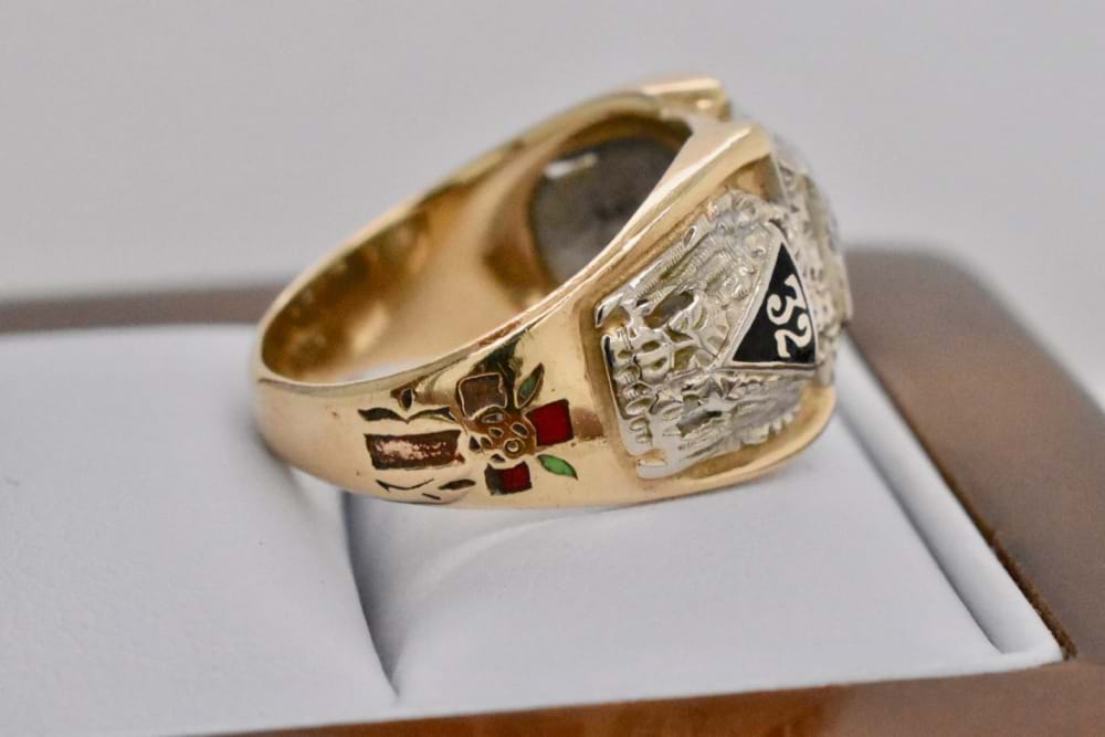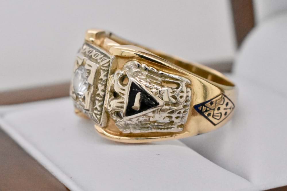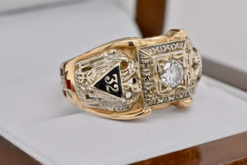 Crafted in 10ct yellow and white gold this Masonic ring features a 0.35ct diamond in the centre with wide tapering shoulders featuring raised symbolic details with enamel accents and engraved symbols with enamel accents. This ring is one of the 32nd degree of the Scottish Rite/Supreme council. Some damage to enamel relative to age of piece. Independent Valuation Supplied