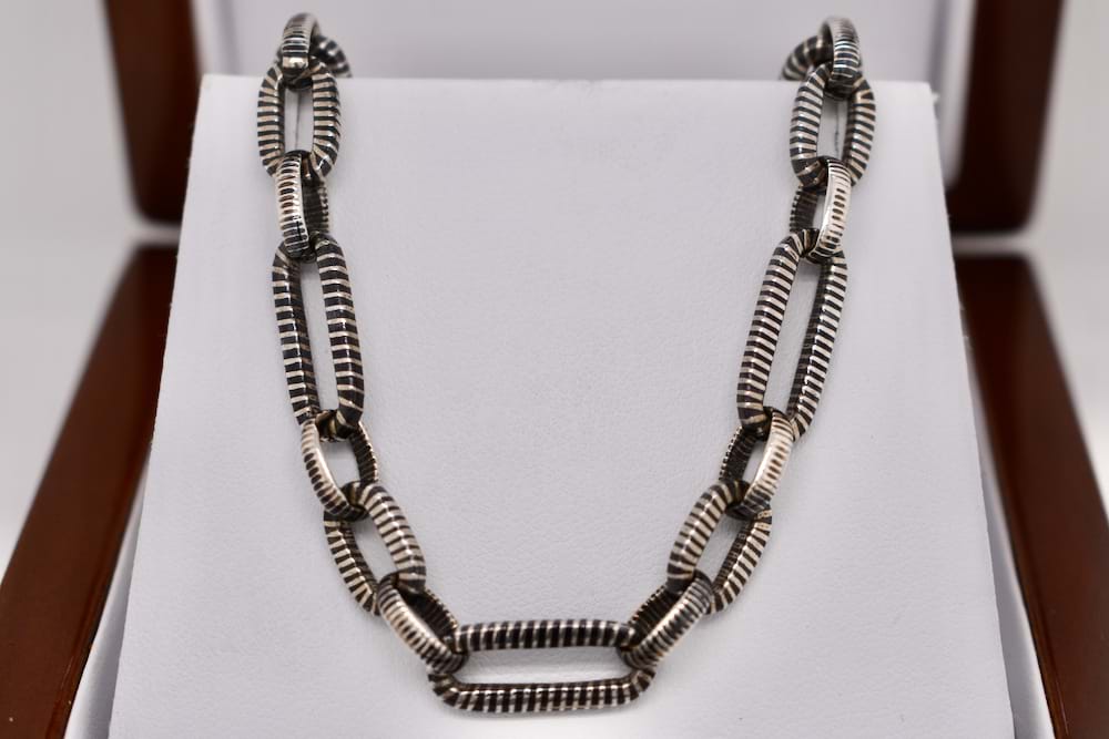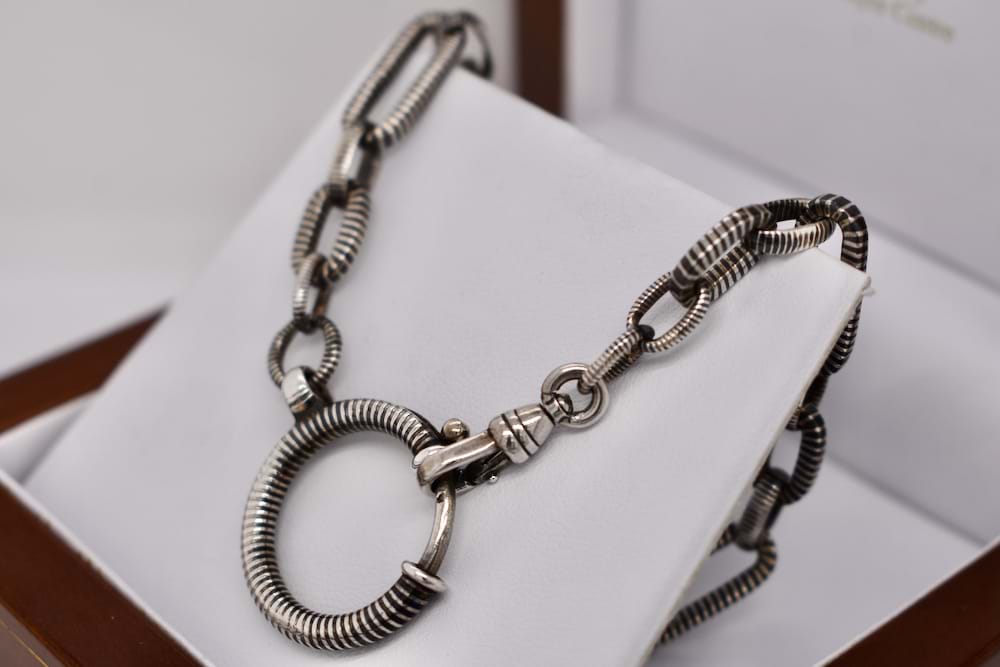 This interesting antique watch chain is in its original condition, made from niello and featuring large links with striped detail. The chain is 25.5cm in length and has a swivel plus bolt ring.