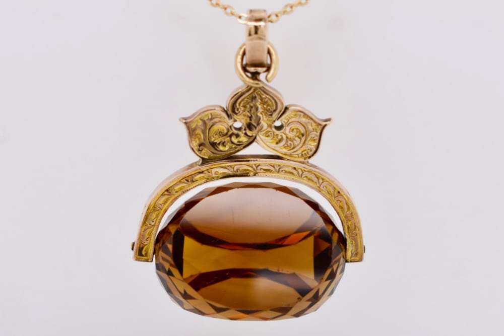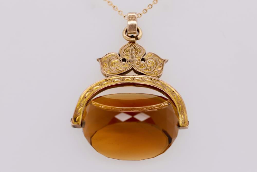 Dated circa 1930 this 10ct yellow gold spinner has a beautiful engraved top and a faceted three-side smokey quartz spinner. Independent Valuation Supplied. Chains available for separate purchase