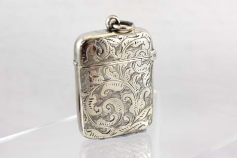 This stunning example of an antique vesta case has been crafted in sterling silver and is hallmarked Birmingham 1900. In impeccable condition and featuring intricate leaf/vine engraving this vesta also boasts a plain shield. Independent Valuation Supplied