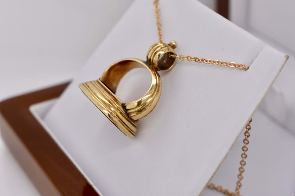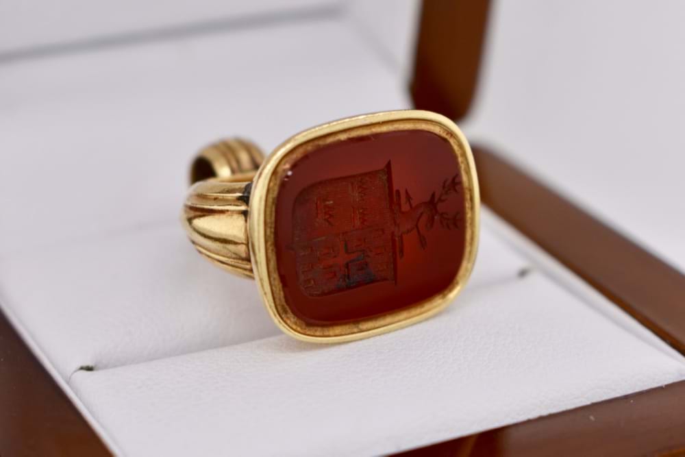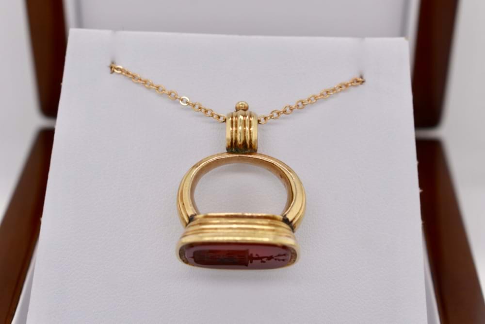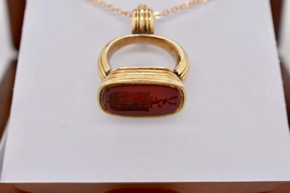 Breautiful antique 14ct yellow gold seal dated circa 1900 set with a cushion shaped Carnelian Intaglio of a family crest. Independent valuation supplied