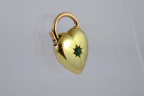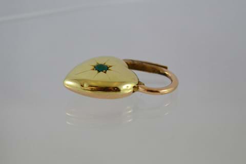 Set with a small cabochon turquoise this beautiful, simple, heart padlock has been crafted in 15ct rose and yellow gold. A difficult thing to source, this antique padlock makes a beautiful addition to a bracelet or when paired with a fine gold chain as a feature. Circa 1900. Independent Valuation Supplied.