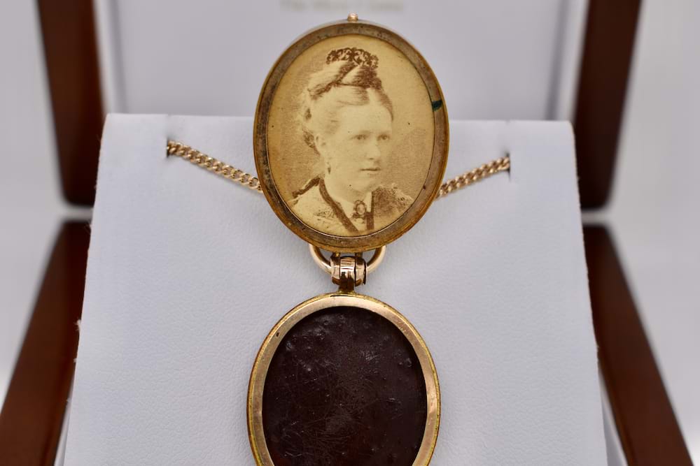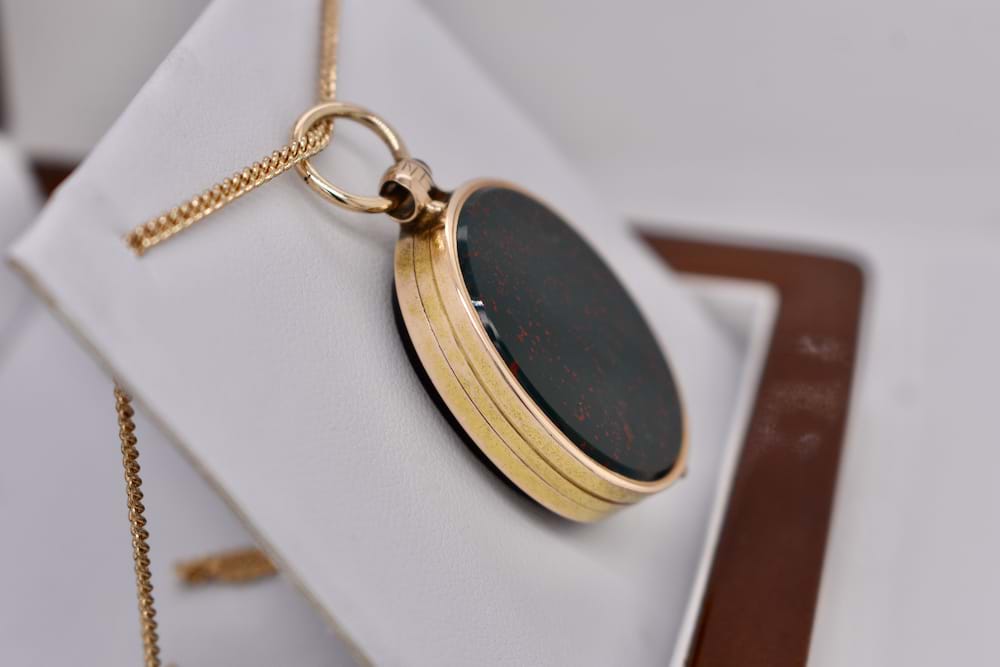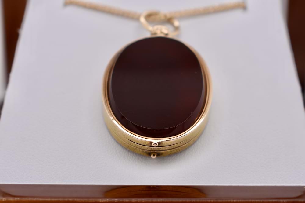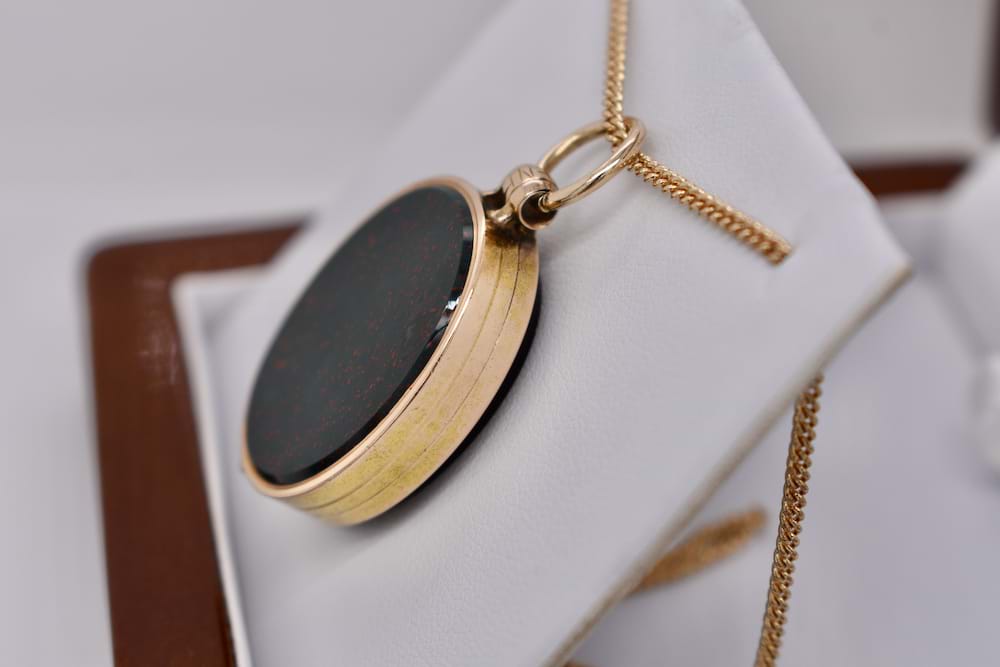 A late Victorian locket crafted in 15ct yellow gold and featuring a polished carnelian & a polished bloodstone side. Opening from the top this gorgeous locket makes a delightful addition to an antique muff chain. Independent Valuation Supplied