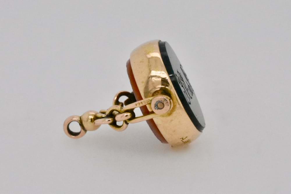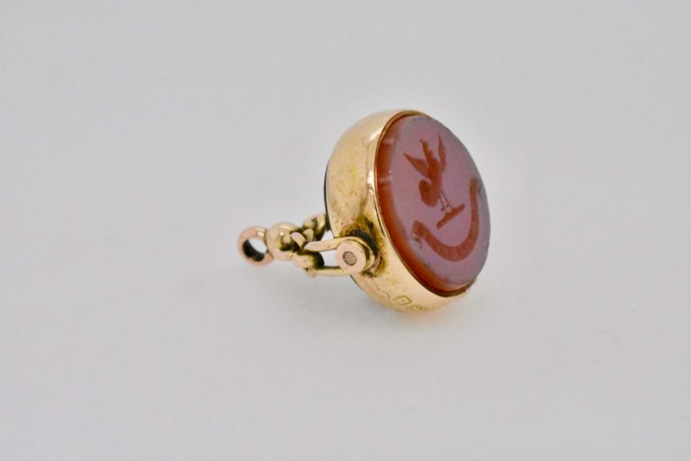 Spectacular example of a Victorian intaglio spinner in lovely condition. This antique piece was crafted in 15ct yellow gold and features a 16.5mm round panel of bloodstone with the intaglio "Pde G. C." and a 16.5mm round panel of banded white and brownish agate with an intaglio of a bird and the words "DUM VIVO CANTO" translating to "While I live, I sing". The spinner is fully hallmarked Birmingham 1882, maker AW. Independent Valuation Supplied