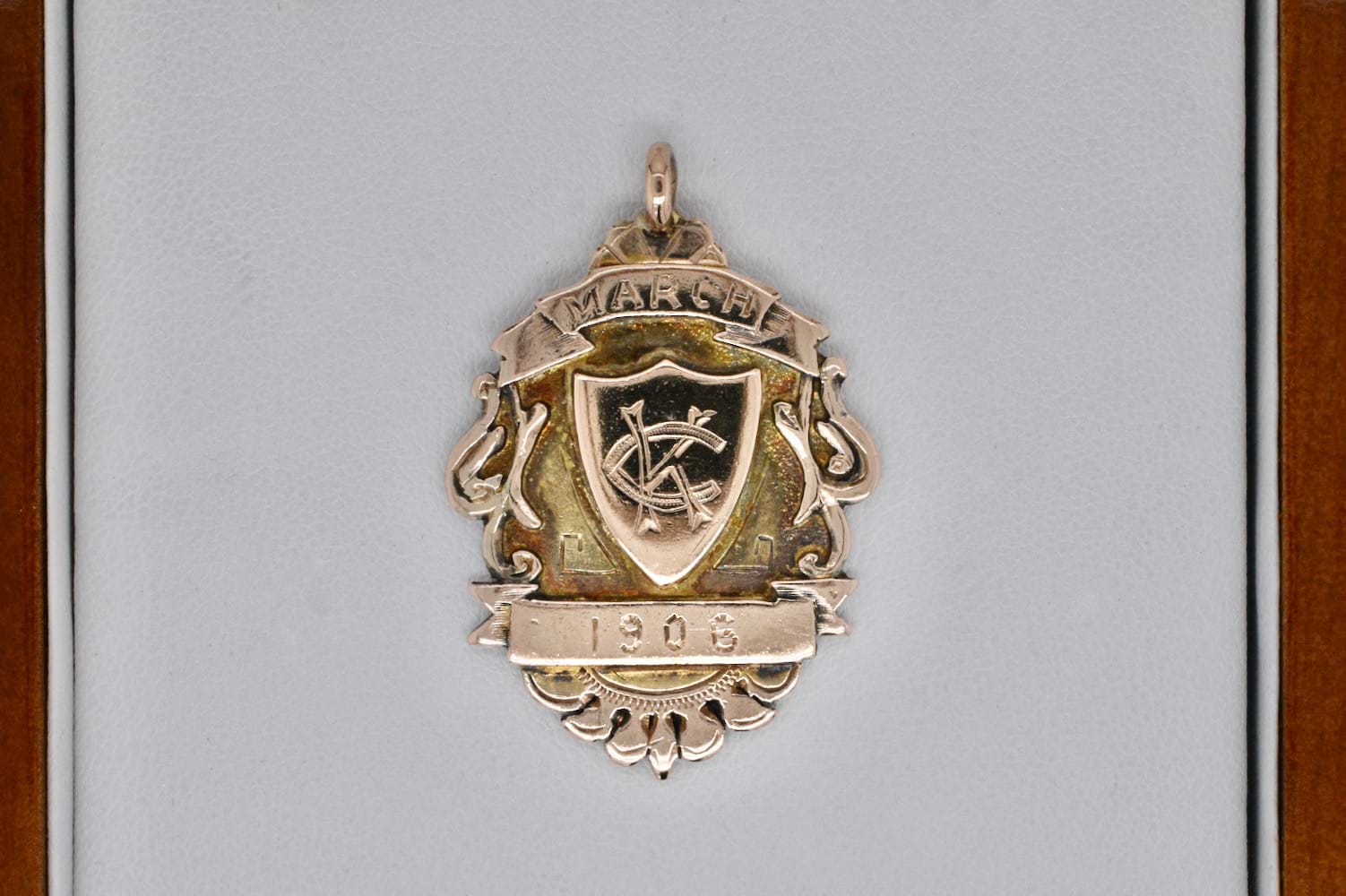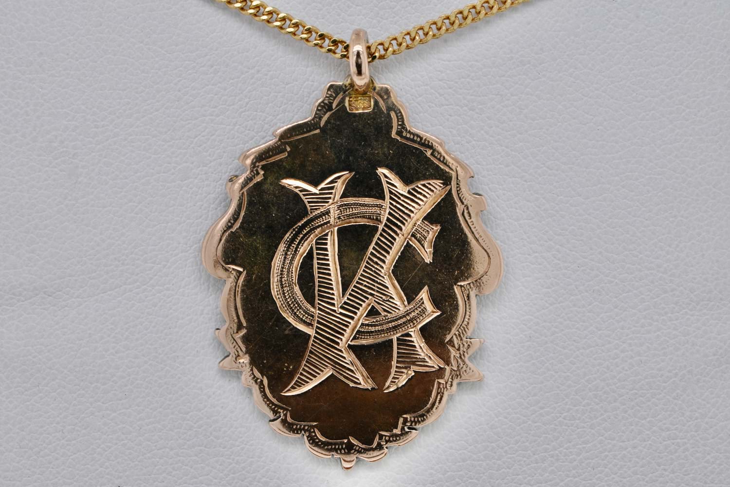 A 9ct 'old gold' shield pendant with embossed banners and shield on the front and engraving on both sides. The front reads "March 1906" with the back featuring large and bold initials 'CK'. Shield measures 38.5x26.5mm