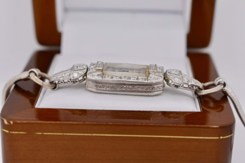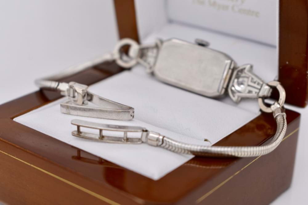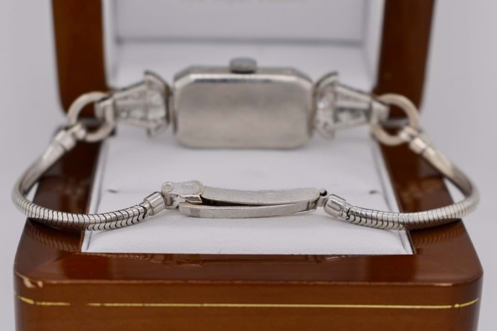 9ct white gold ladies bracelet watch. Rectangular numeral dial set with 28 single cut diamonds grain set in bezel with tapered articulated lugs, each grain set with 11 single cut diamonds. On a 2.5mm snake bracelet connected by jump rings with a ladder style clasp. Diamonds 50 =.60CT GH/P1, Total weight of the watch including the movement is 18.78 grams. 15 Jewel Swiss movement. Circa 1940
