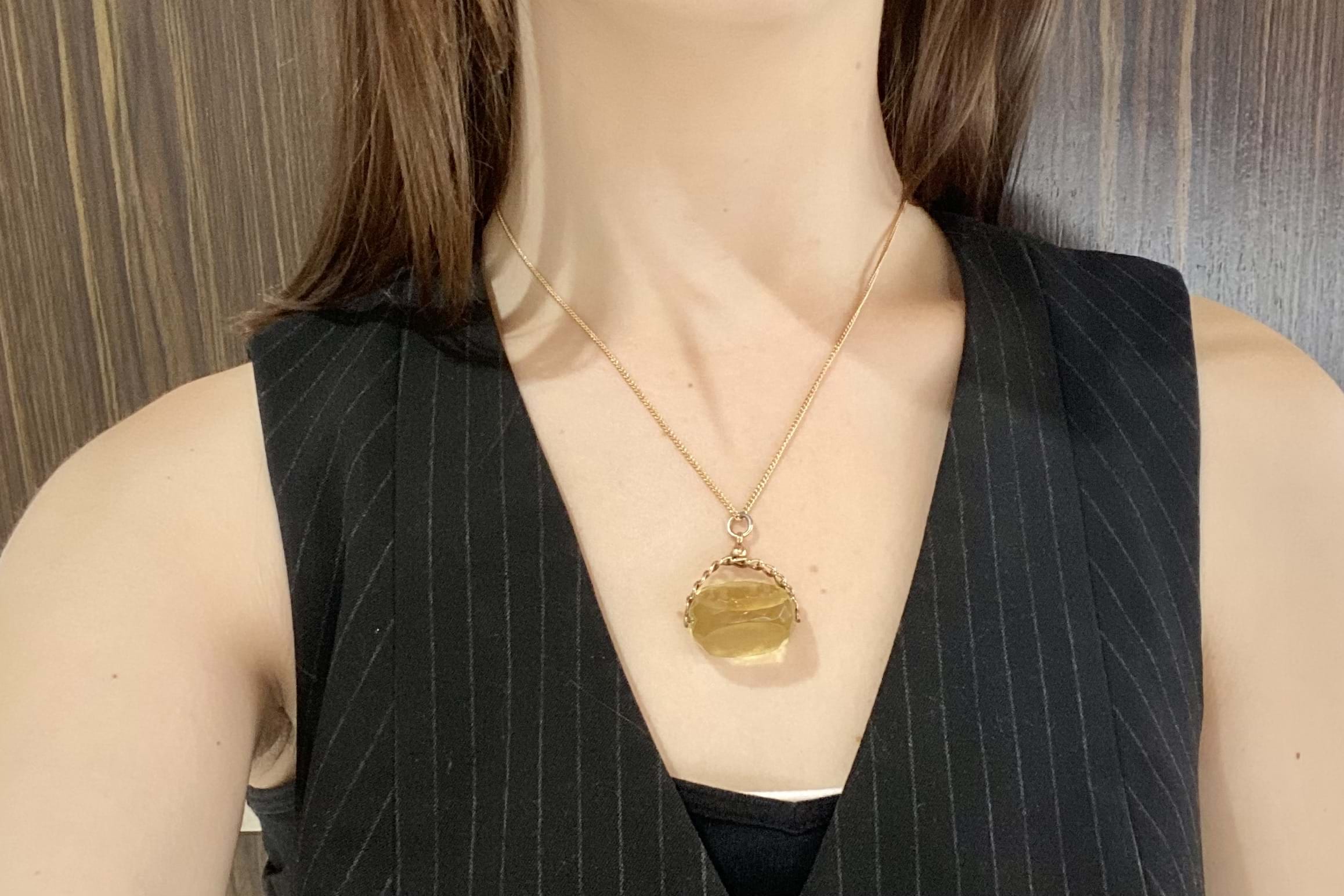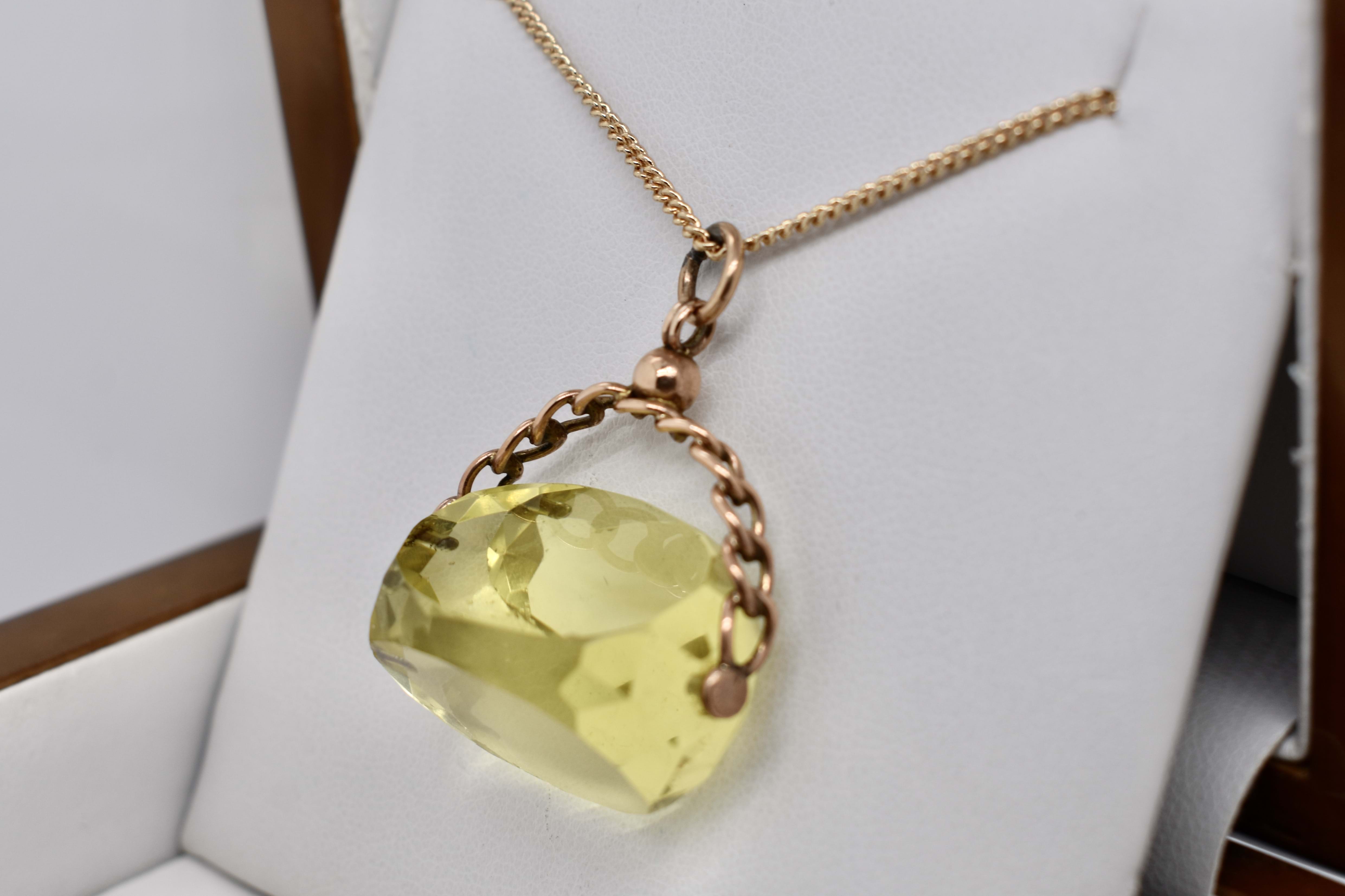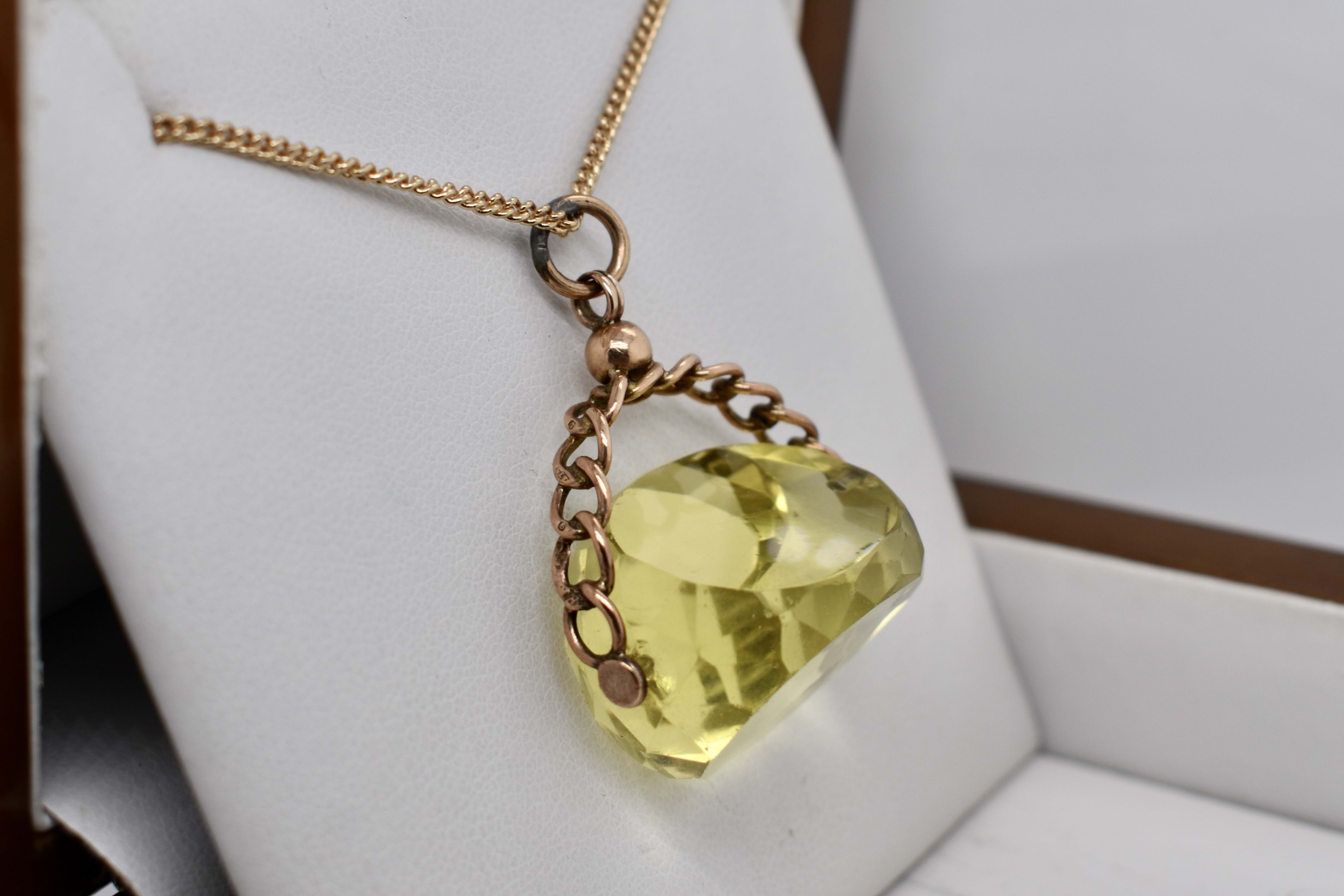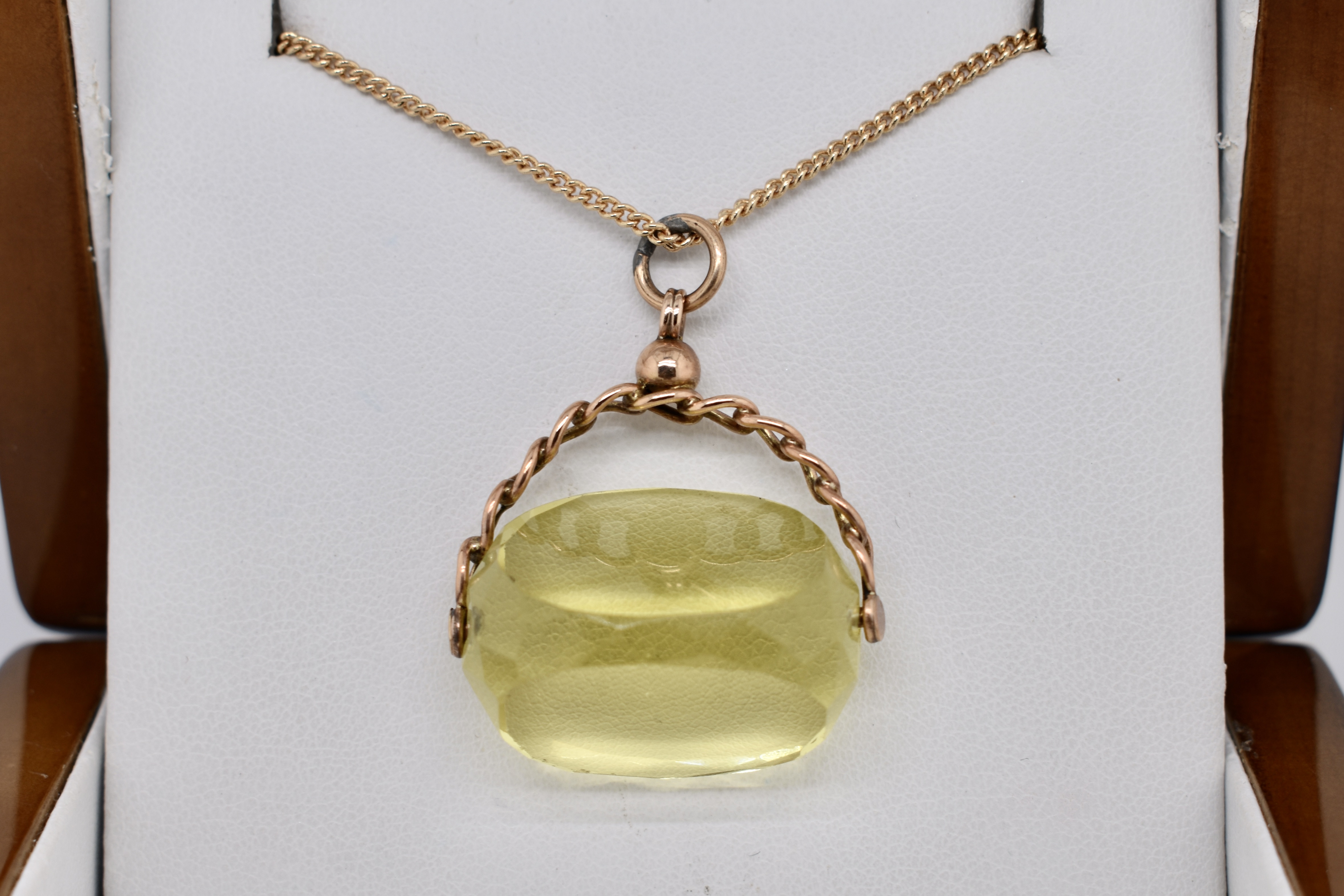 9ct gold spinner with faceted yellow paste and chain top detailing. Circa 1910. Chains available for seperate purchase.