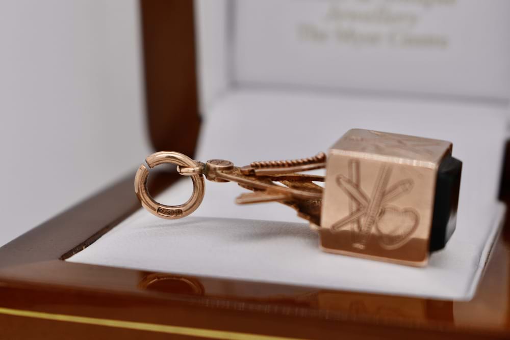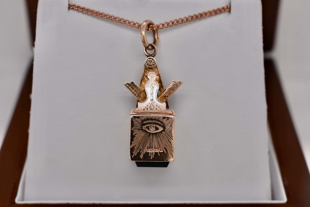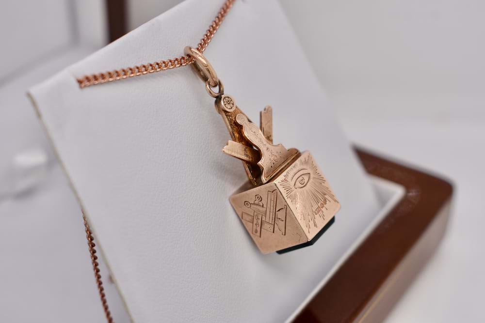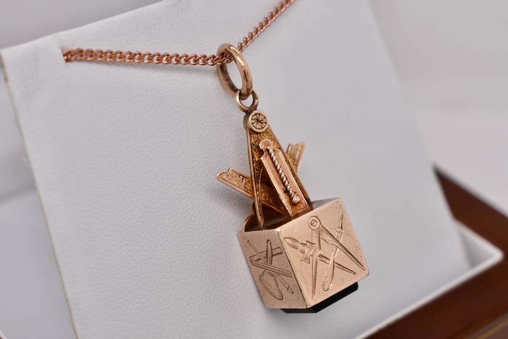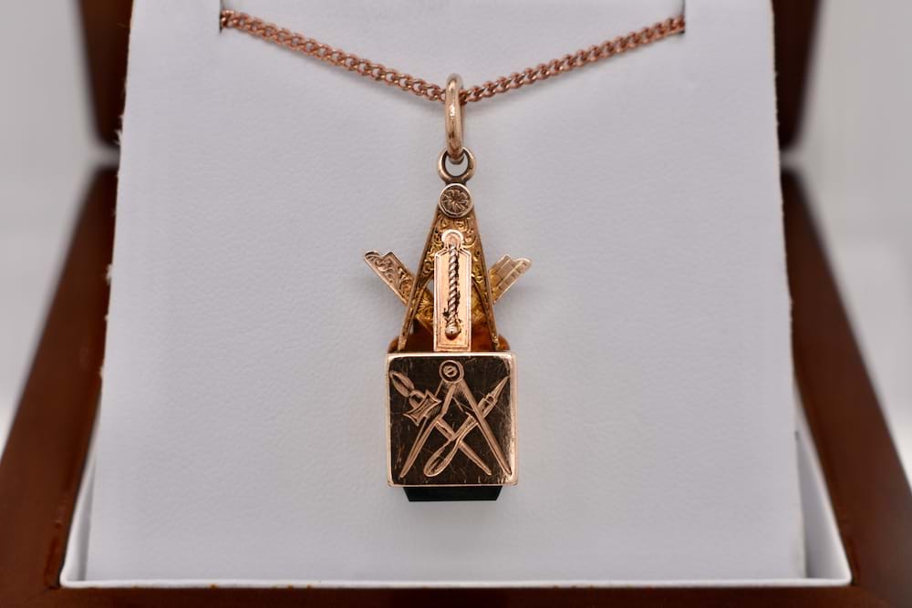 The perfect addition to a Masonic collection. Crafted in 9ct rose gold this Masonic cube pendant features a single piece of bloodstone and masonic symbols engraved on each side. With a compass top and jumpring bale this piece is hallmarked Birmingham 1945. Independent Valuation Supplied