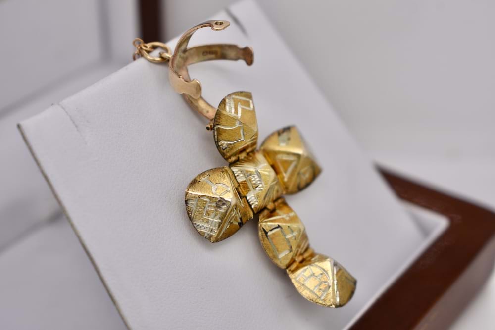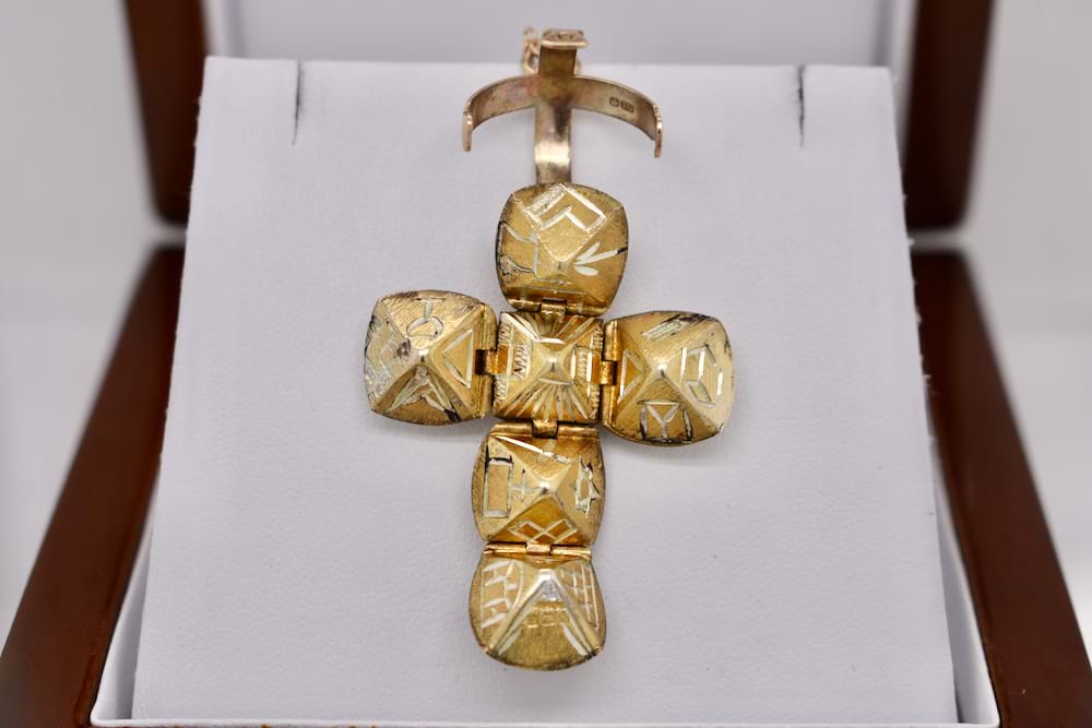 A 9ct yellow gold masonic orb pendant with fixed arms dated circa 1950. Weight: 9.67grams and ball diameter is 16mm. Independent Valuation Supplied. Chains are available for separate purchase