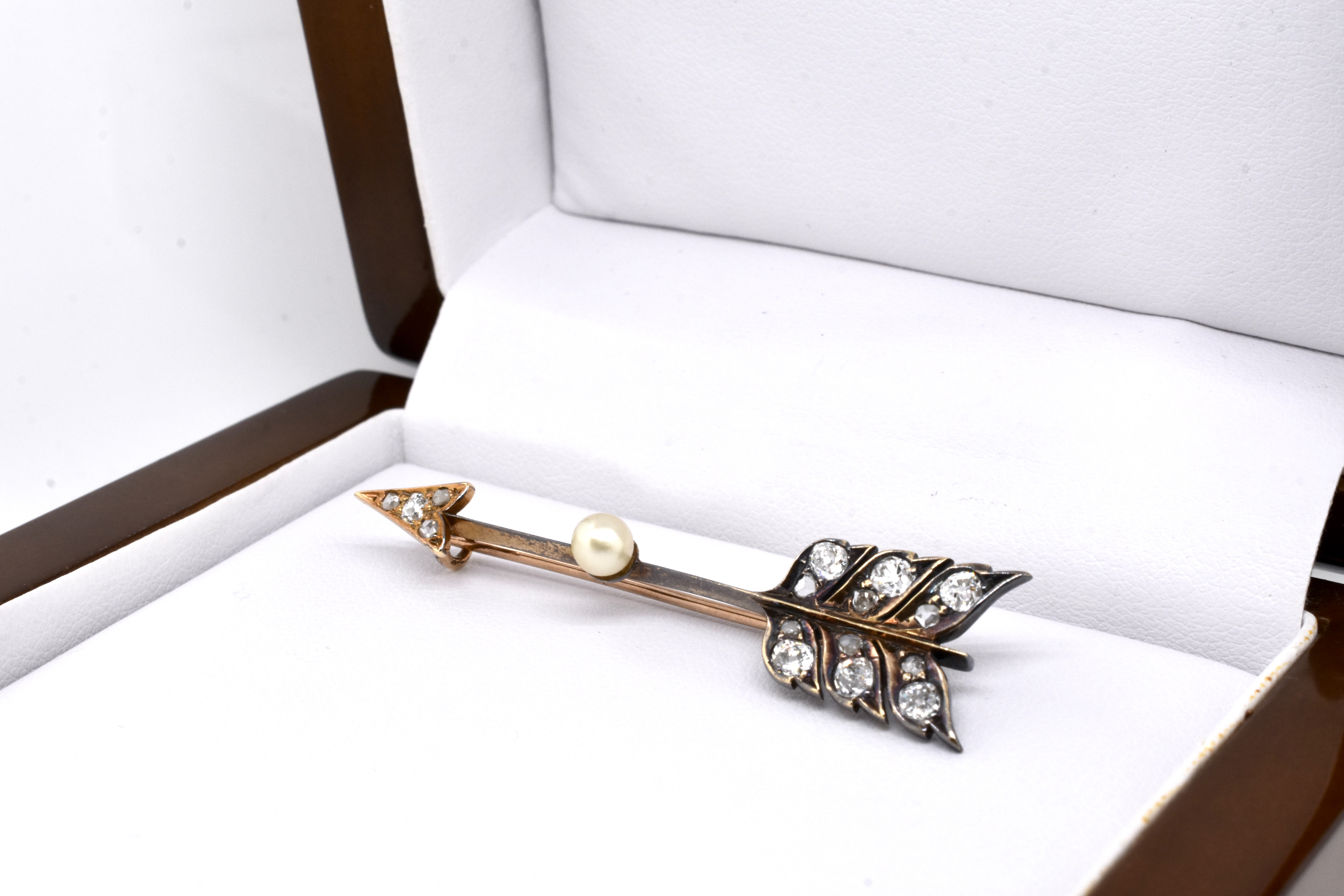 A beautiful and striking antique brooch in 14ct yellow gold in the shape of an arrow, with old mine cut and rose cut diamond studded fletching and arrow head and a creamy white 4.4mm pearl in the centre of the knife edge shaft, with C clip closure. Total of sixteen diamonds equalling 0.71ct G-H/VS-SI. Brooch is 5cm long. Circa 1900