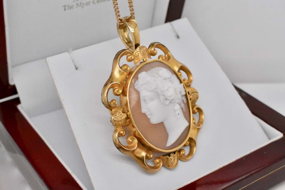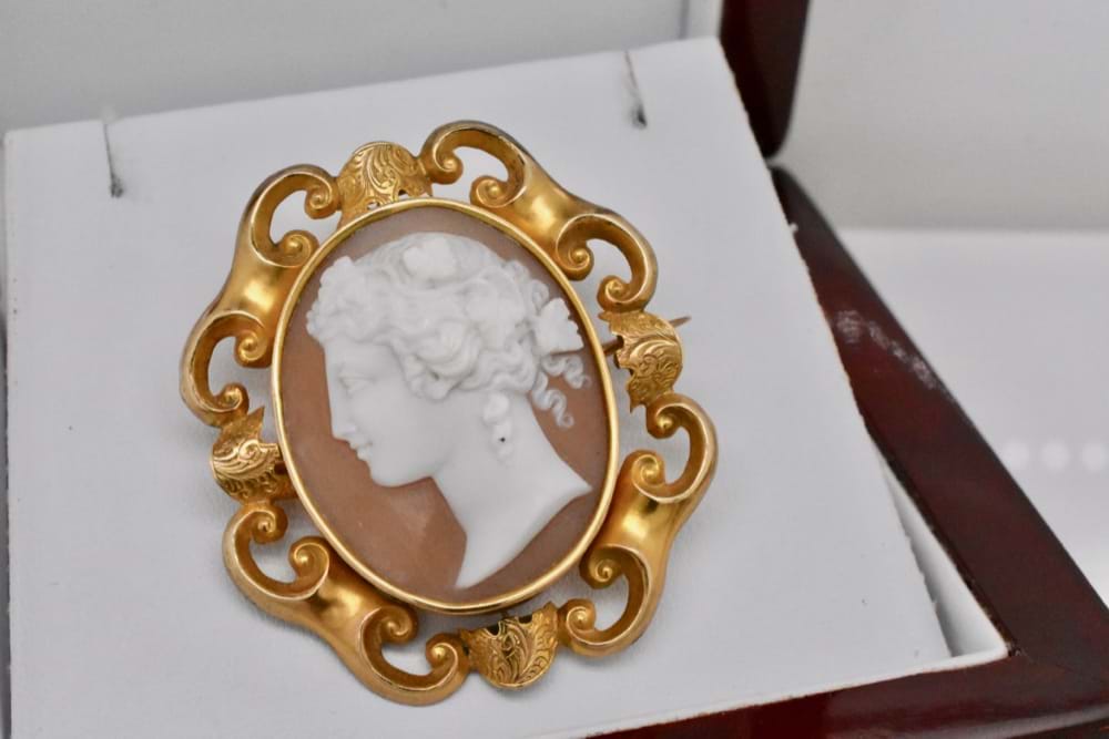 Dated circa 1890s this beautiful antique cameo has a 9ct yellow gold fancy scroll border and an enhancer bale which has been added at a later date. Independent Valuation Supplied