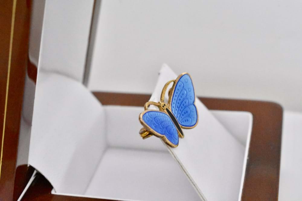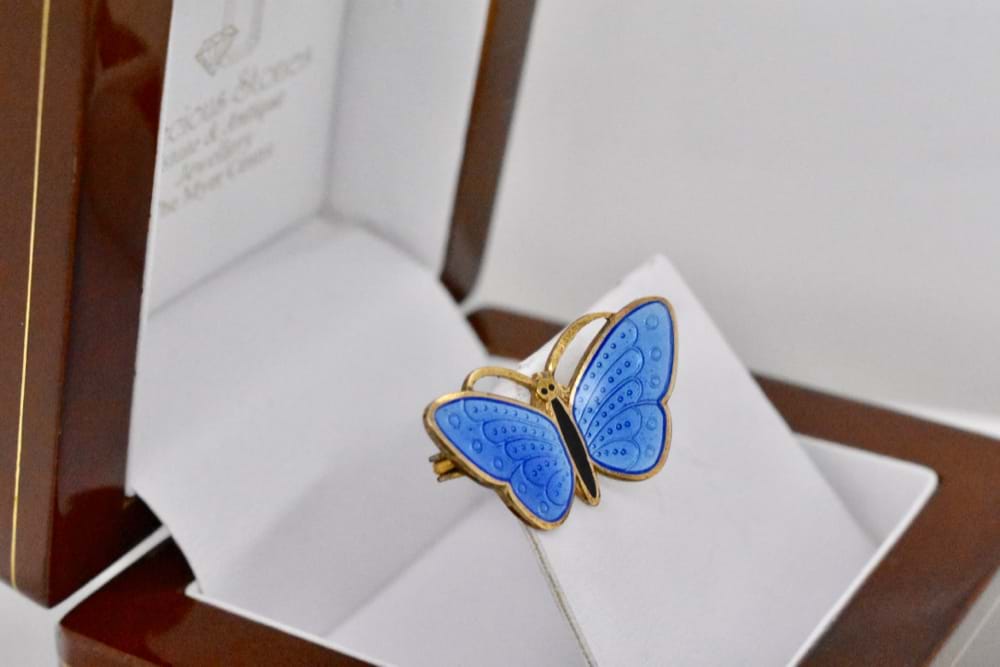 This European antique brooch in the design of a butterfly has been crafted in sterling silver and features beautiful pale blue enamelling. Origin: Danish
