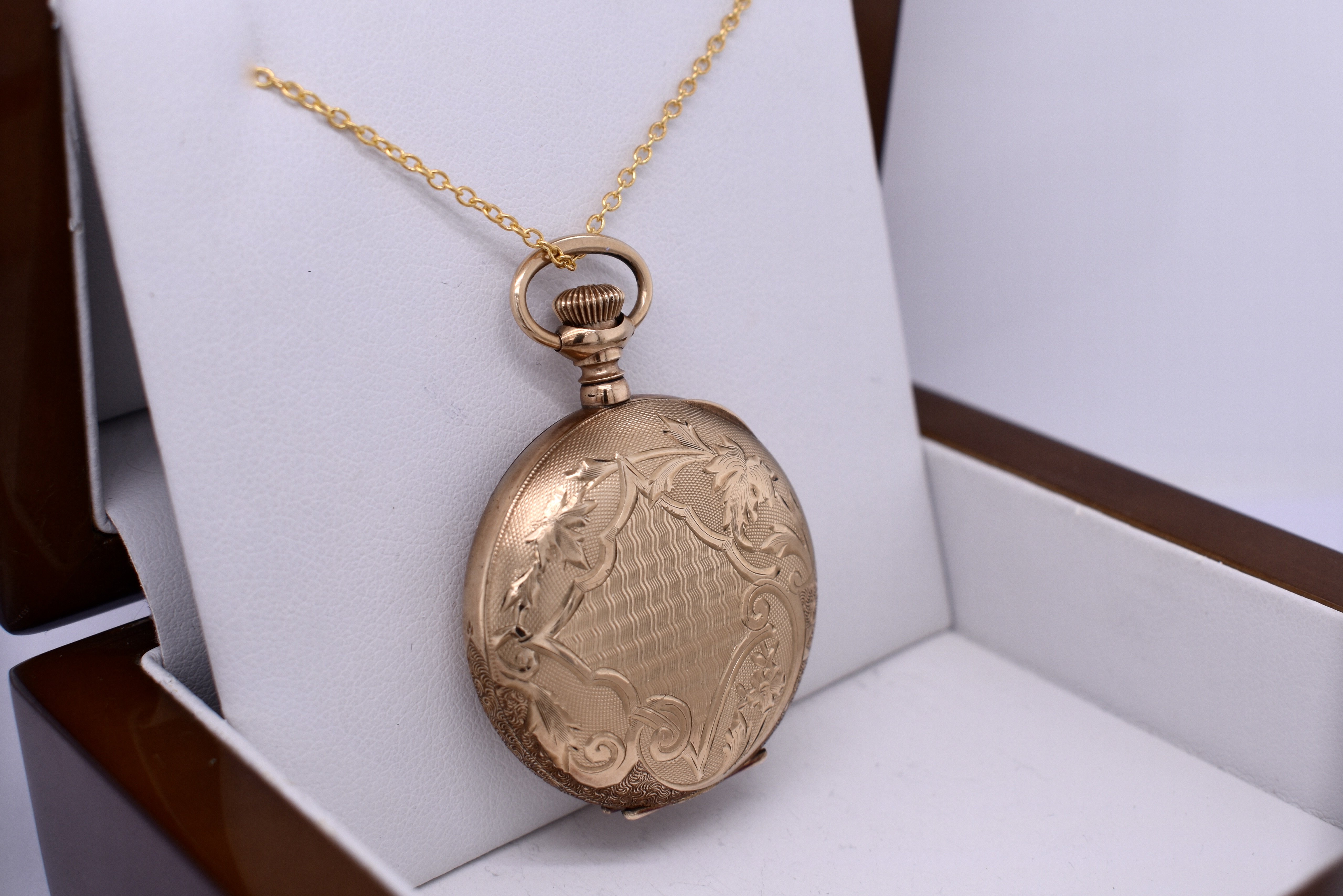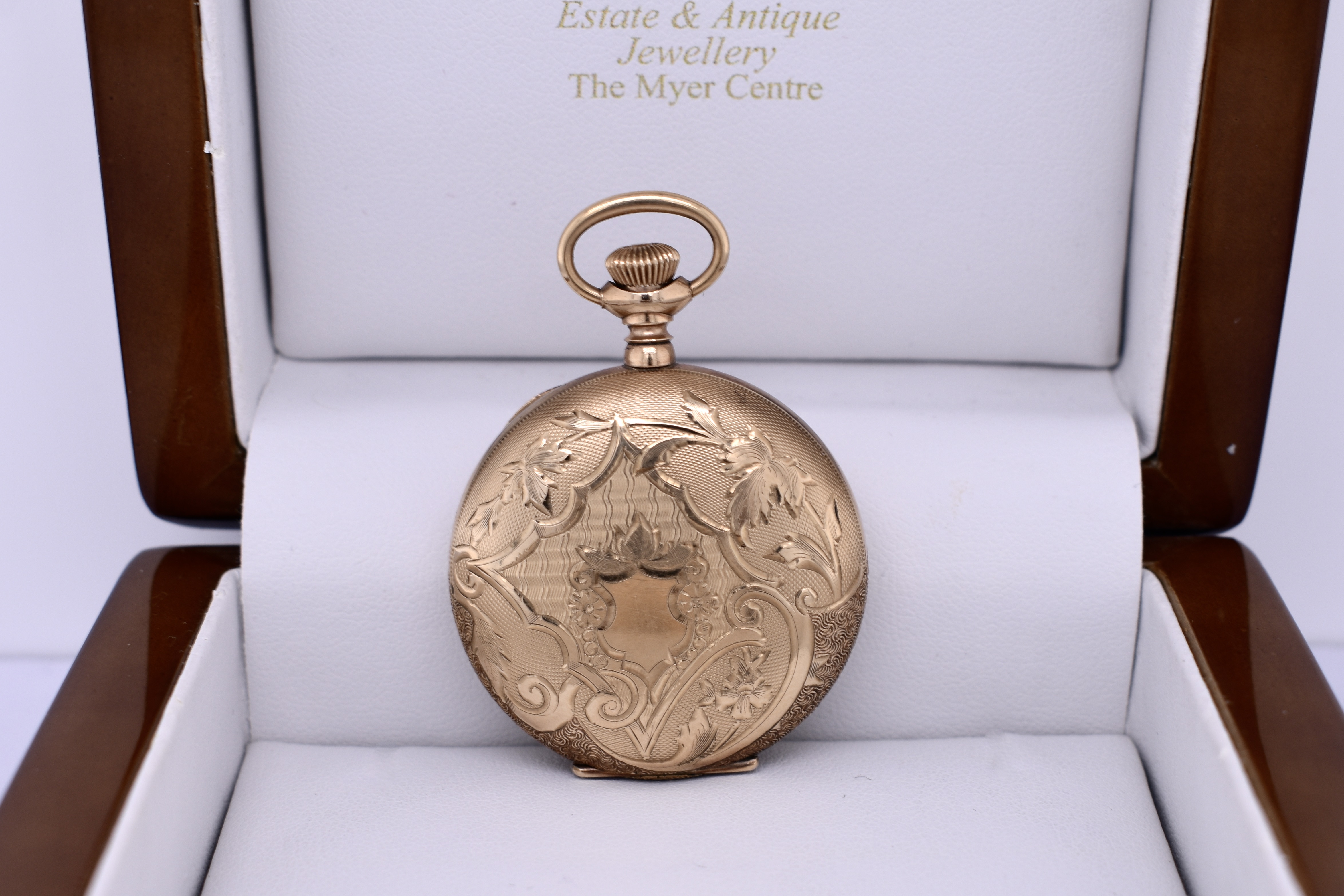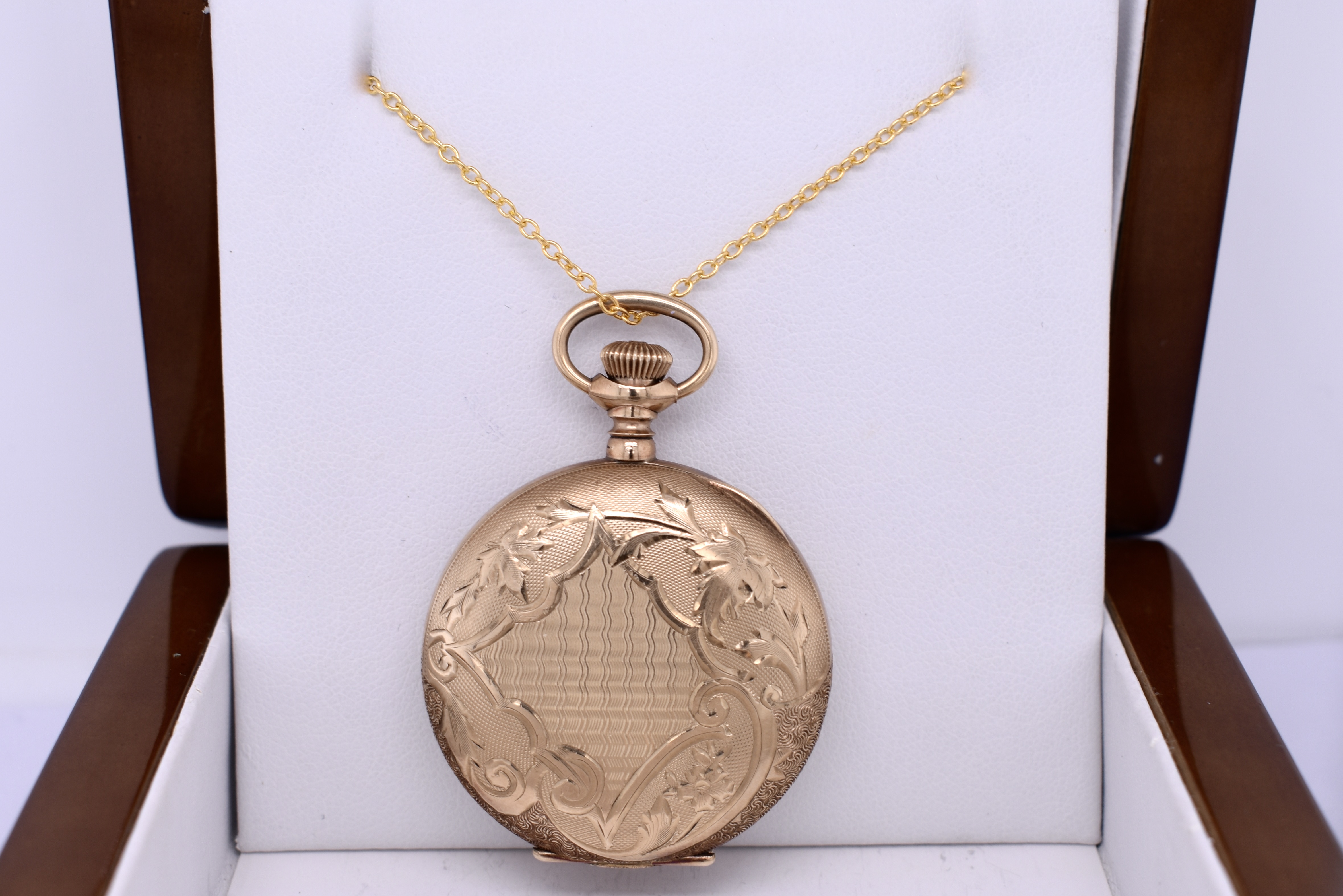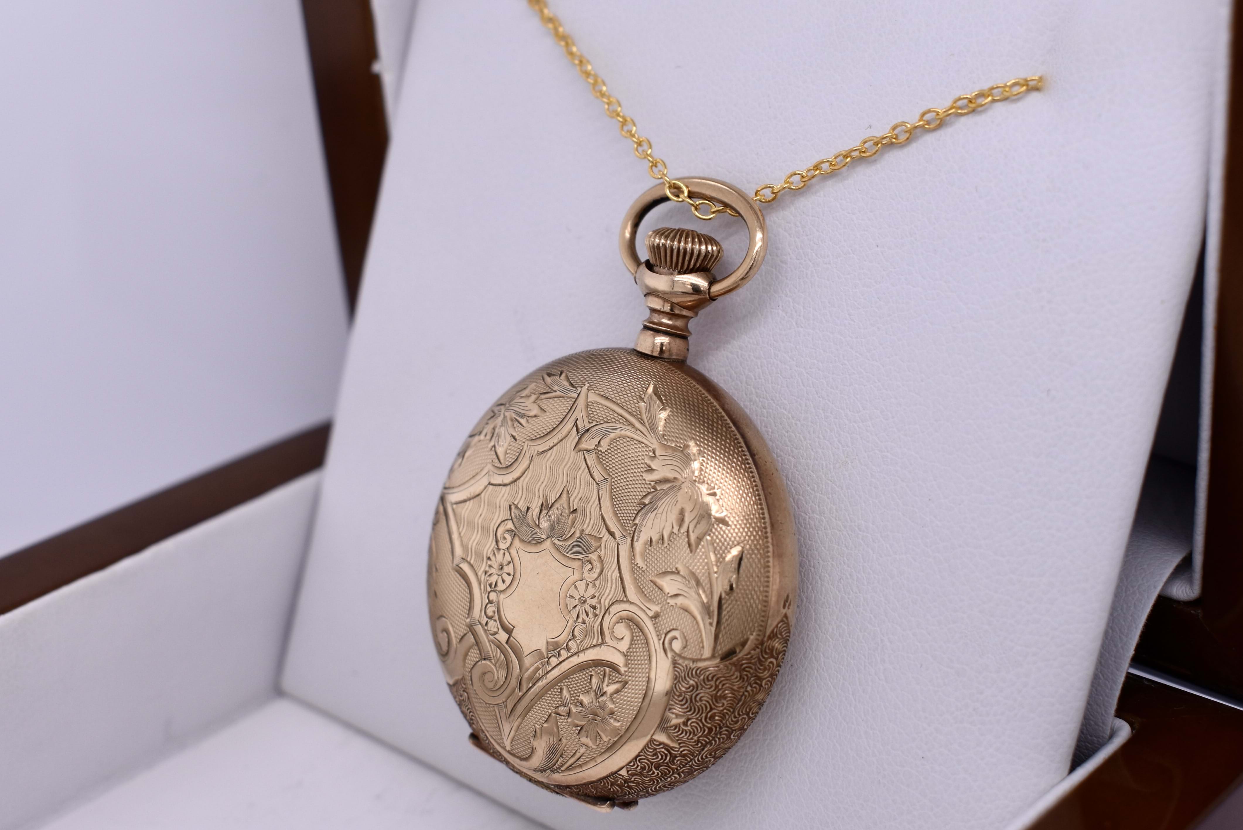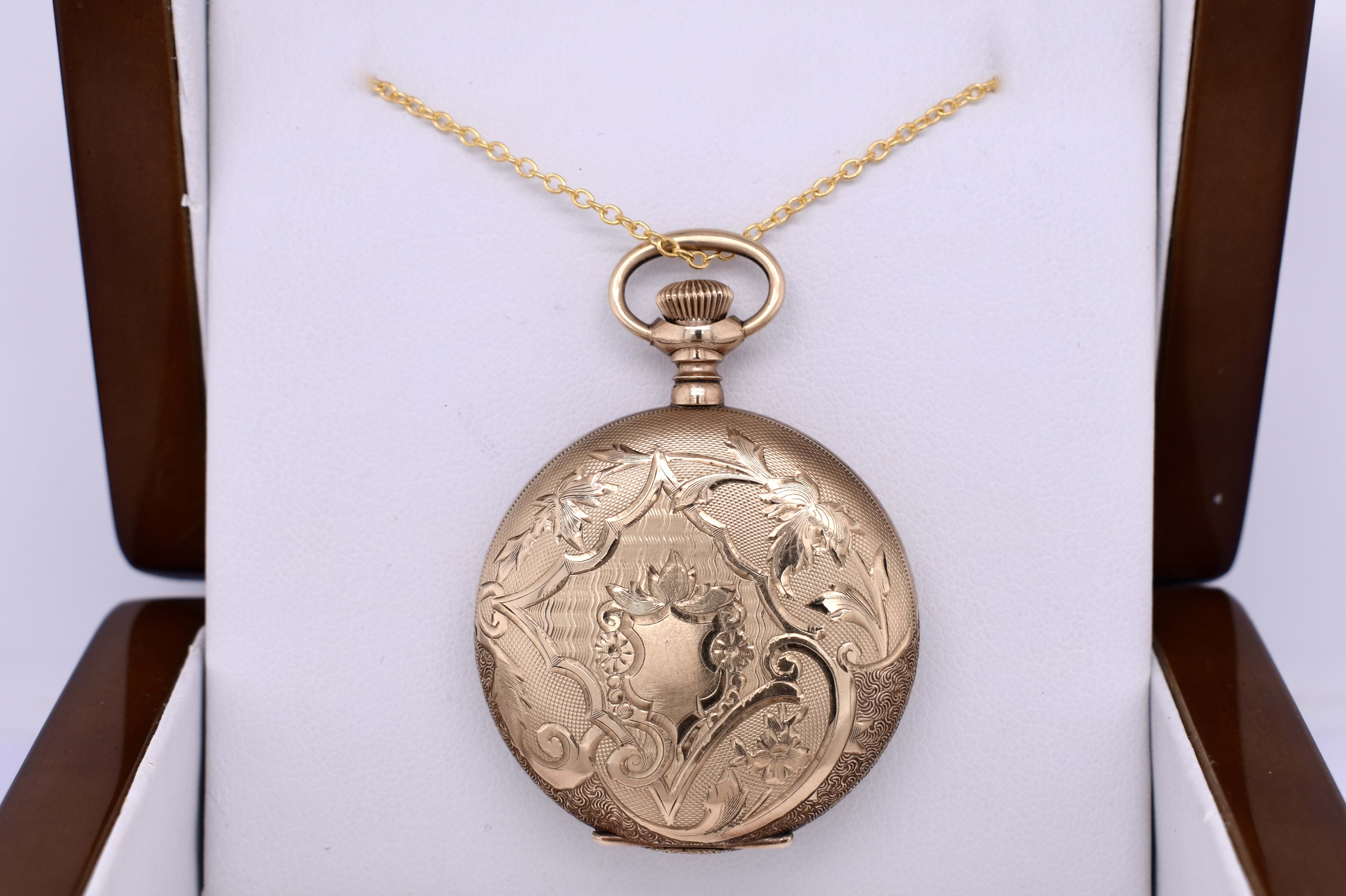 This lovely full hunter Elgin pocket watch is gold cased with incredible decorative leaf detailing on the case, measuring 35mm round and dated circa 1900s. Please Note: We are selling for jewellery purposes not as a timepiece. Chains available for separate purchase.