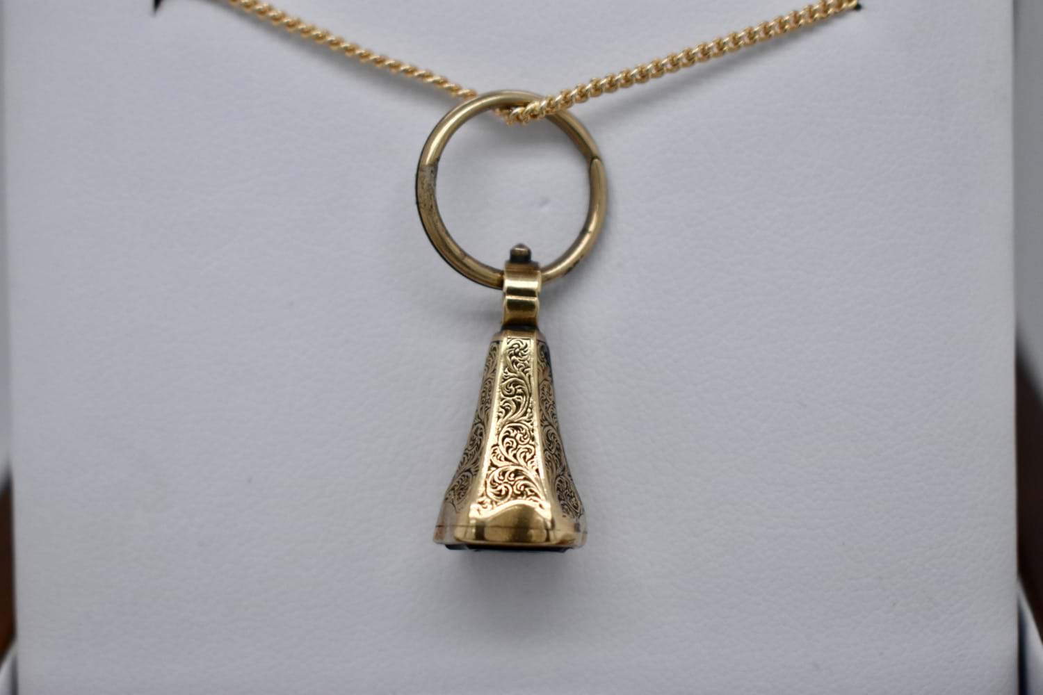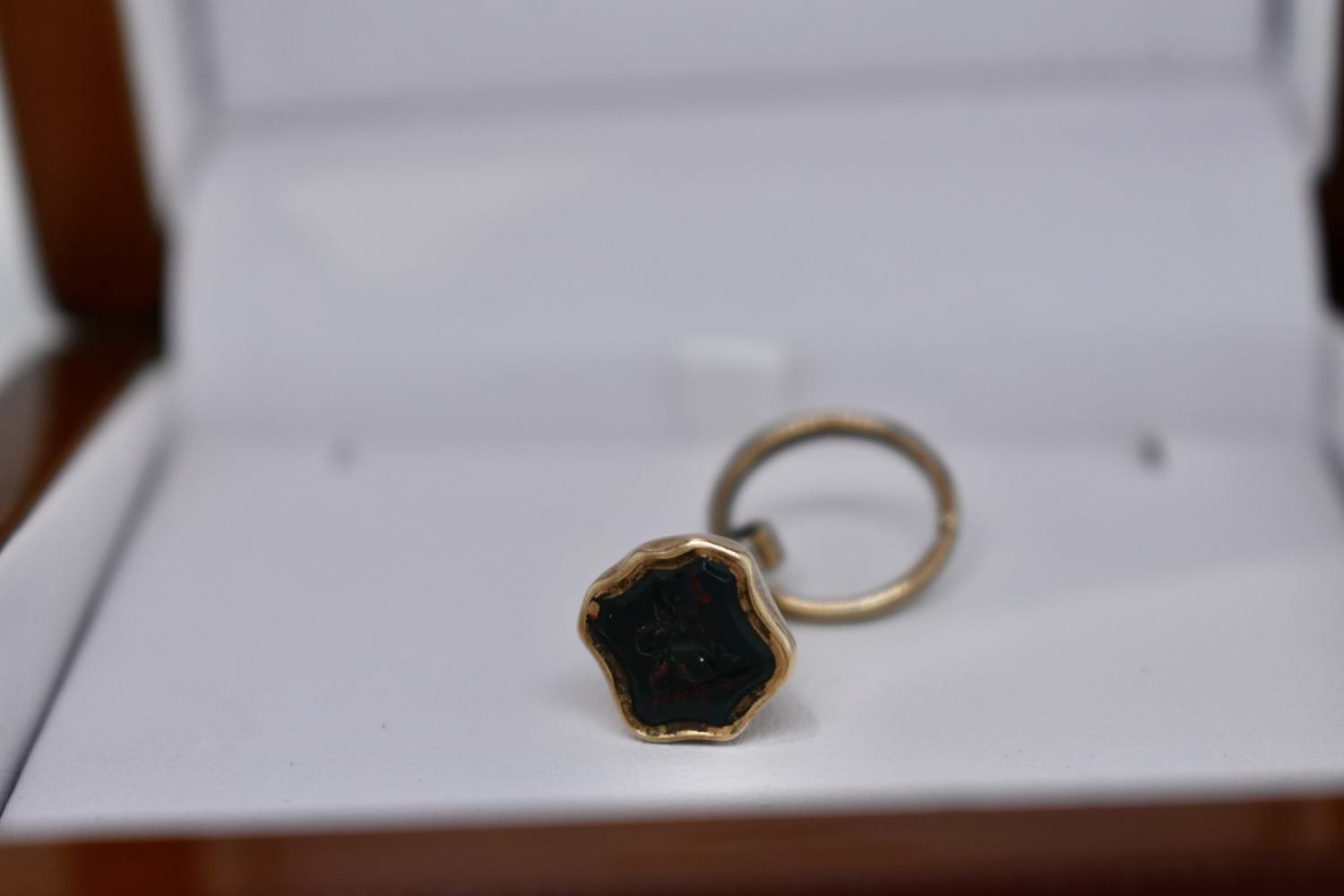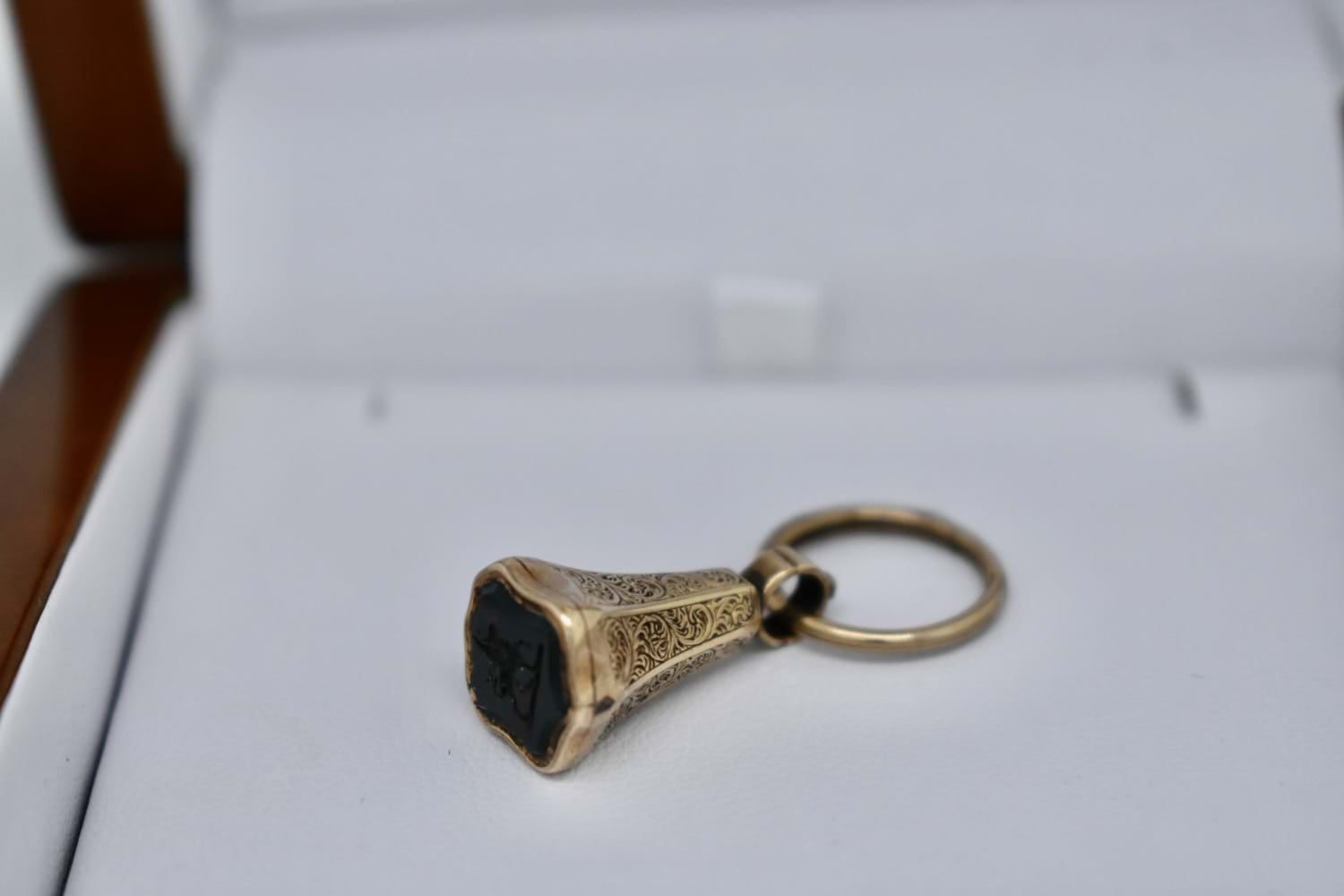 This lovely antique seal and antique split ring is gold cased and features a Griffin intaglio in the bloodstone base. Chains available for separate purchase.