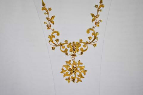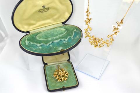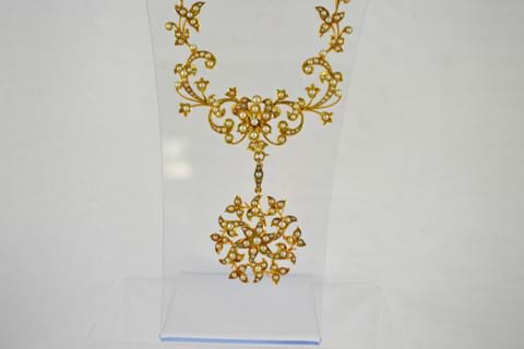 This absolutely exquisite parure consists of a 15ct gold, floral design, seed pearl encrusted necklace and brooch with the ability to be worn in five different combinations. Expert Victorian craftsmenship allows the brooch fitting to be removed and the flower burst to be worn as a pendant with the addition of a removable bale, this pendant can then be suspended from the main necklace. Complete with their original fitted boxes and all components in perfect working condition this parure is truly a testiment to the artisan jewellers of it's time and one to be admired and appreciated. Independent Valuation Supplied