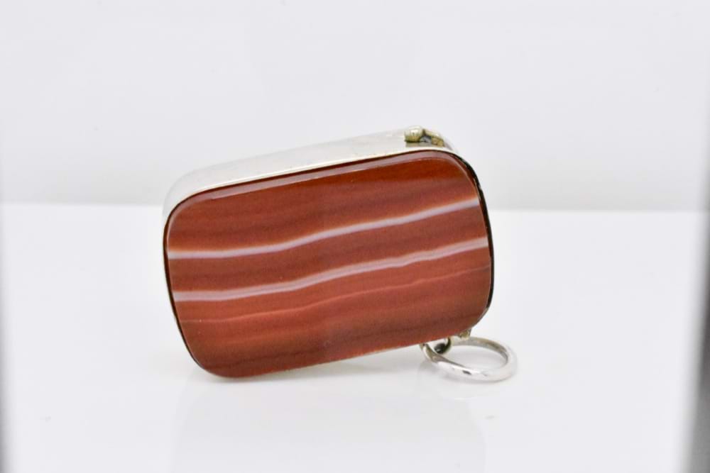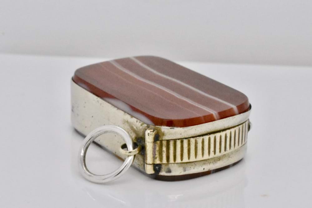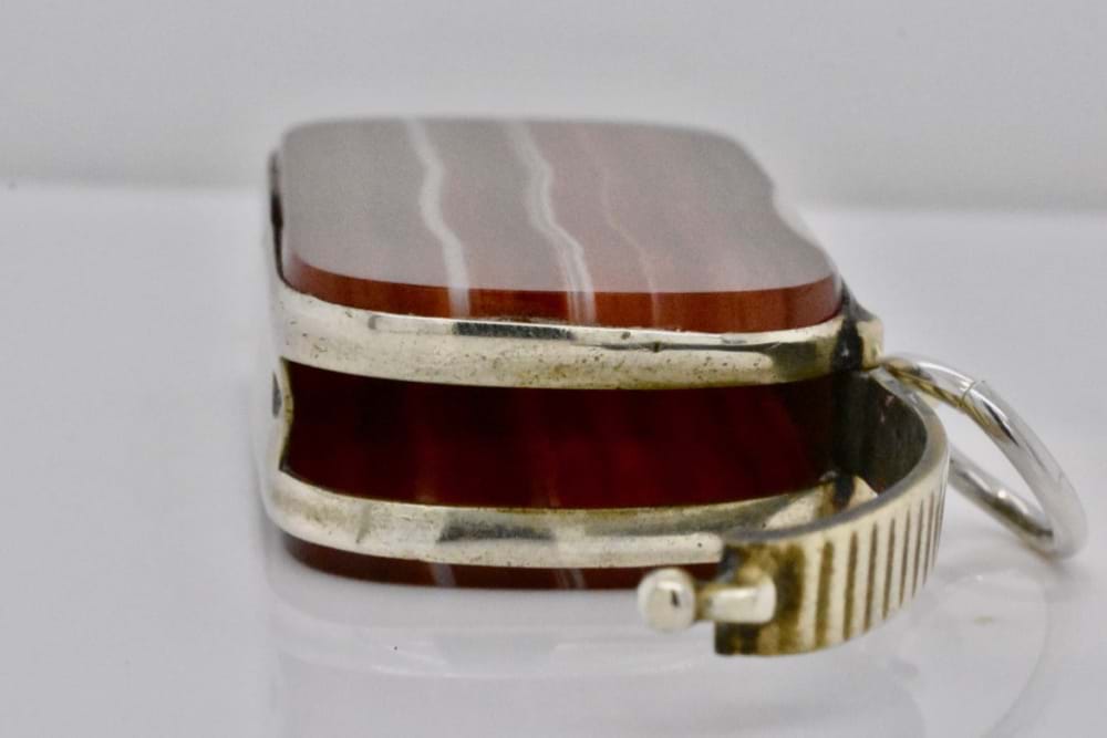 This extremely rare and fantastic vesta case consisting of two panels of banded carnelian forming the front and back, silver side panels and a sterling silver lid which doubles as the striking panel. A very unusual and never befroe seen vesta, perfect for an avid antique collector.