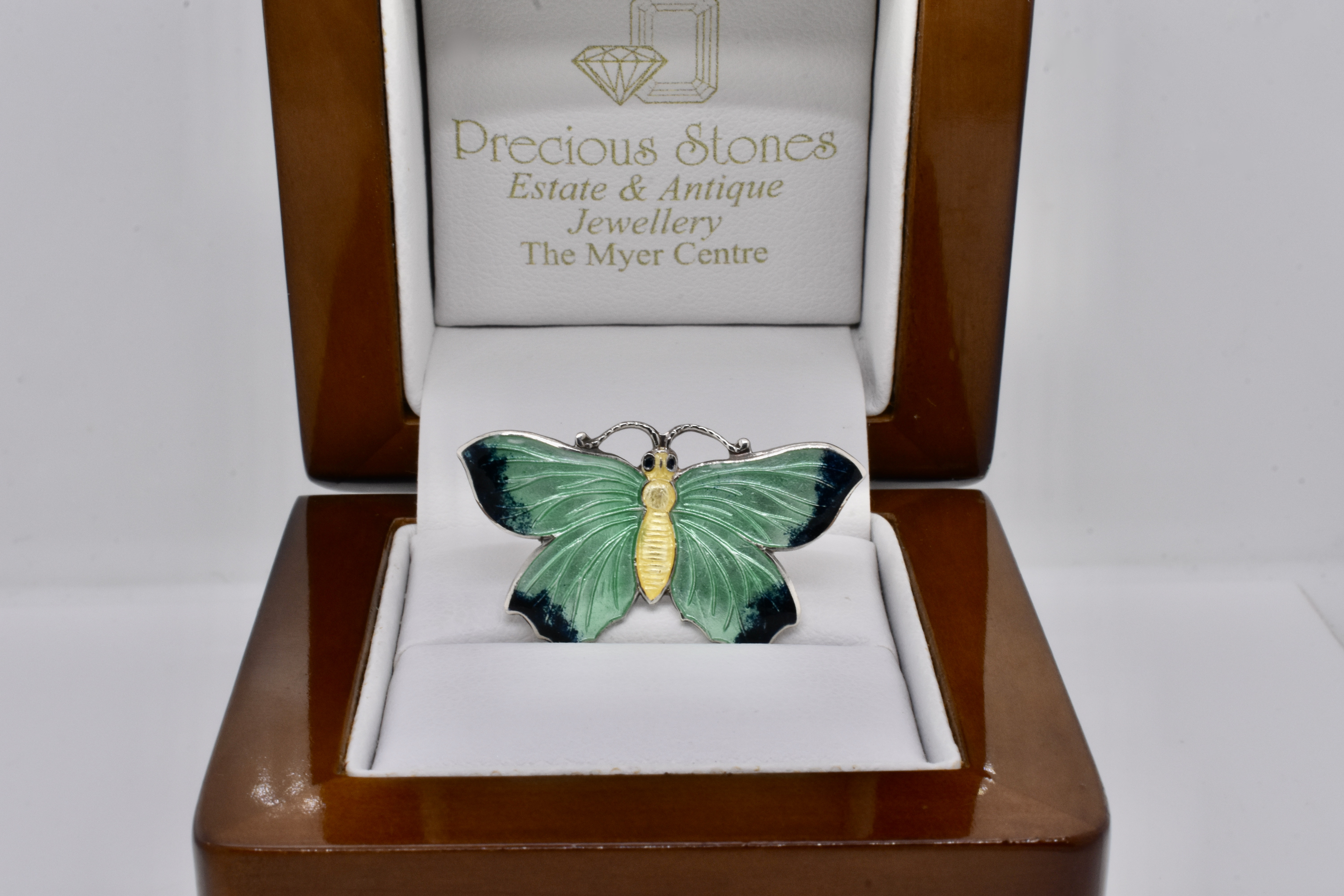SOLD Vintage Sterling Silver Green & Yellow Enamel Butterfly Brooch