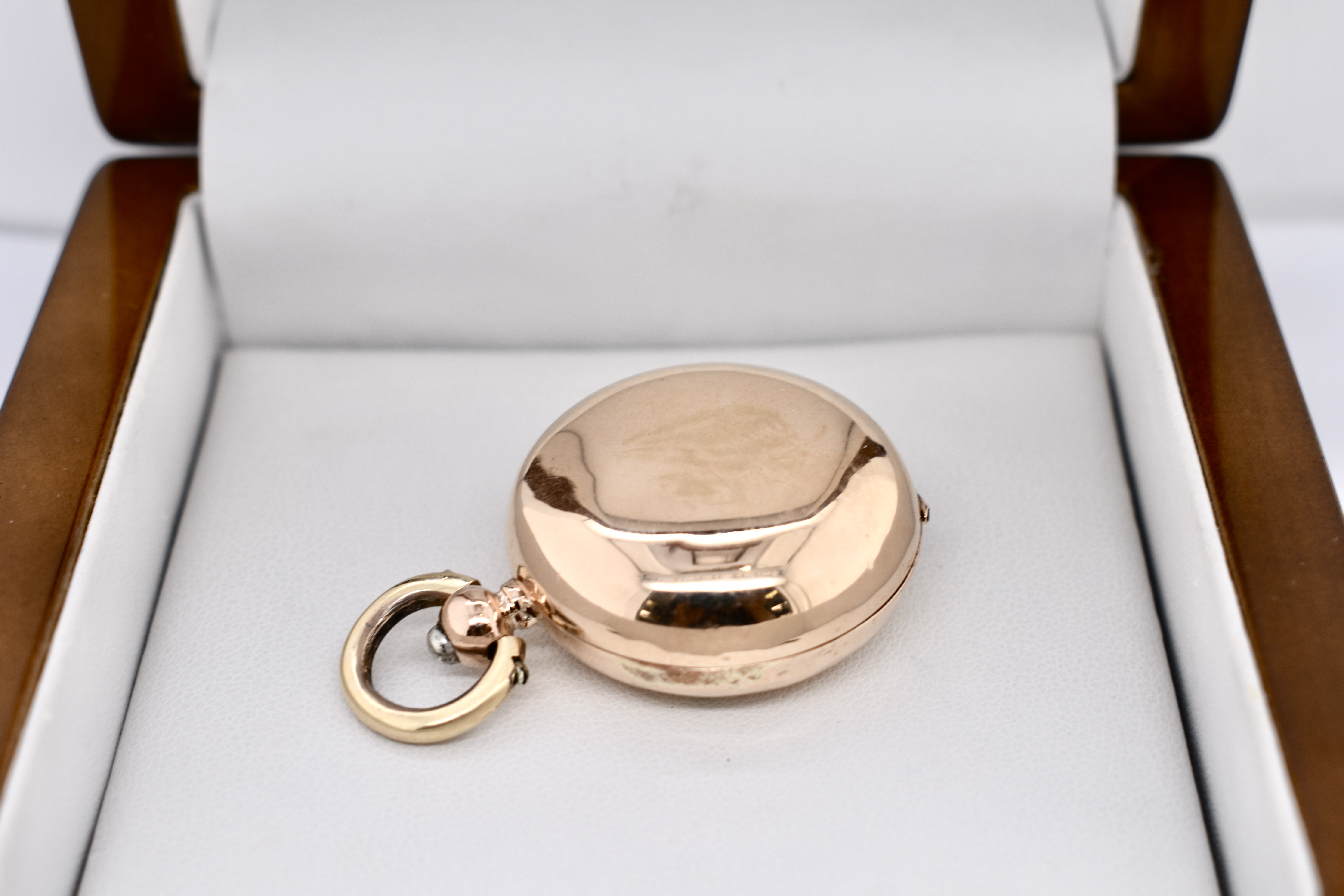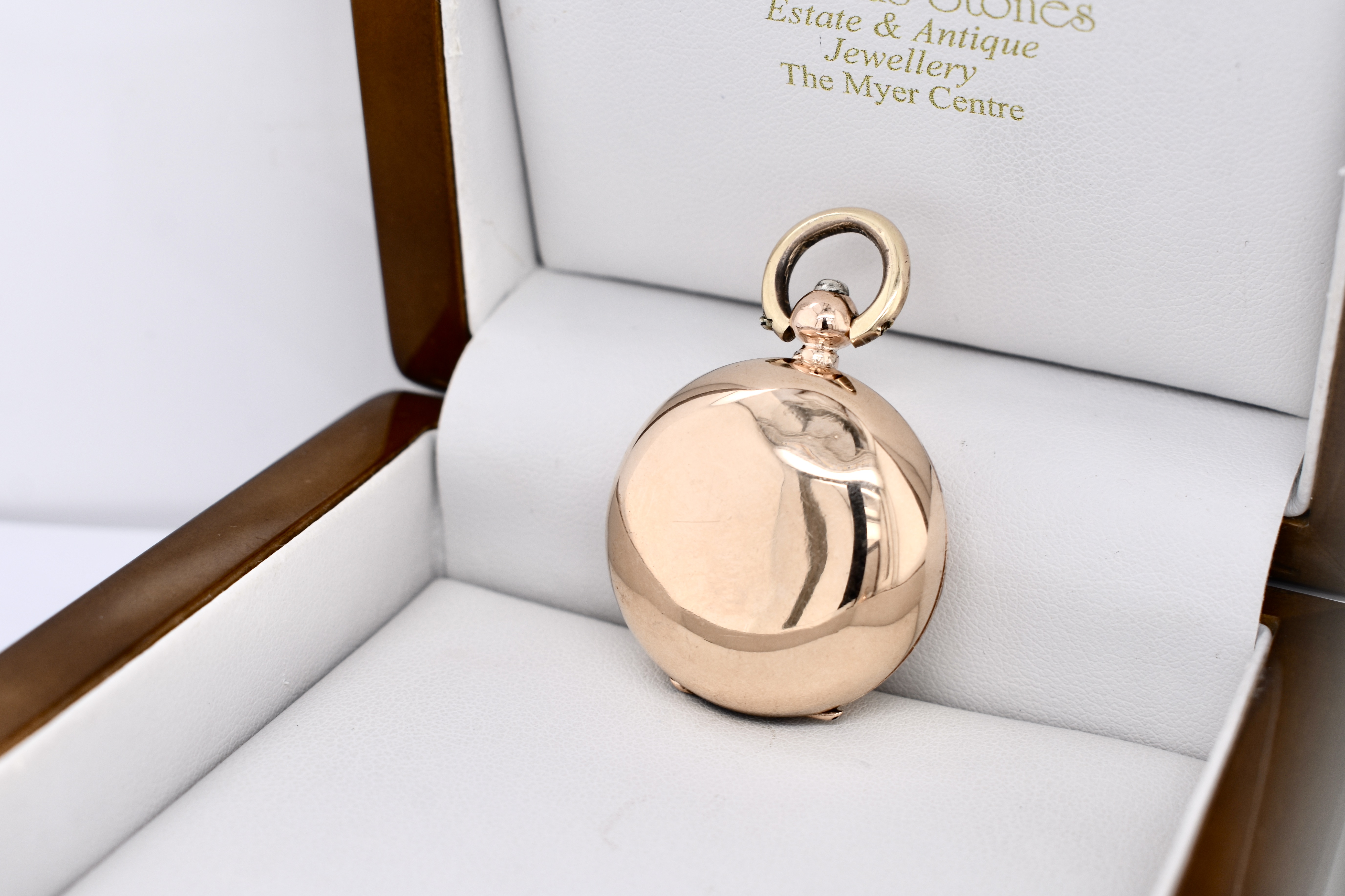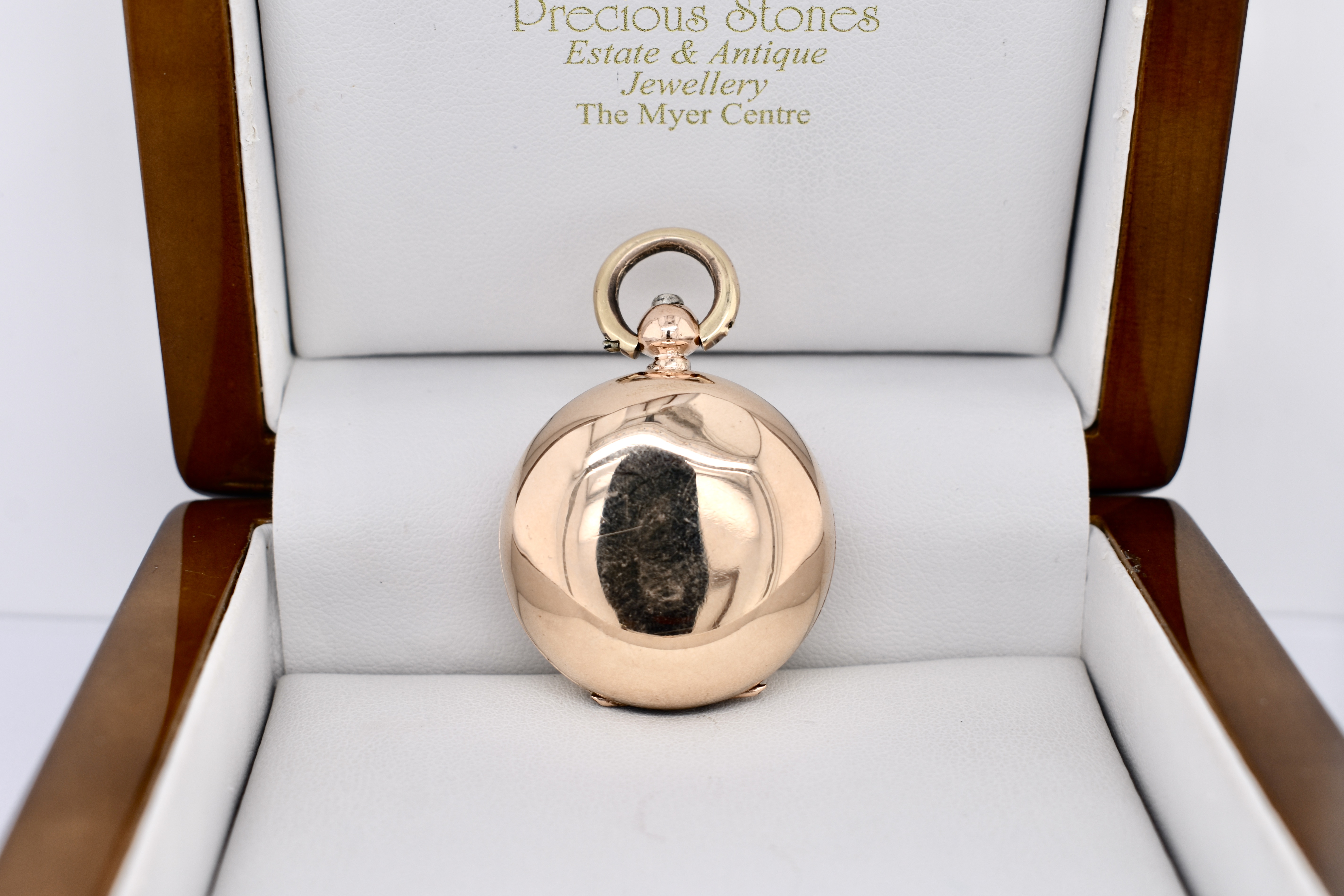 In beautiful condition is this solid 9ct rose gold sovereign holder/case. This case is plain front and back and fits full sovereign coins. Completed with a push button to open and with a ring loop, this case would make a fabulous addition to a rose gold chain.