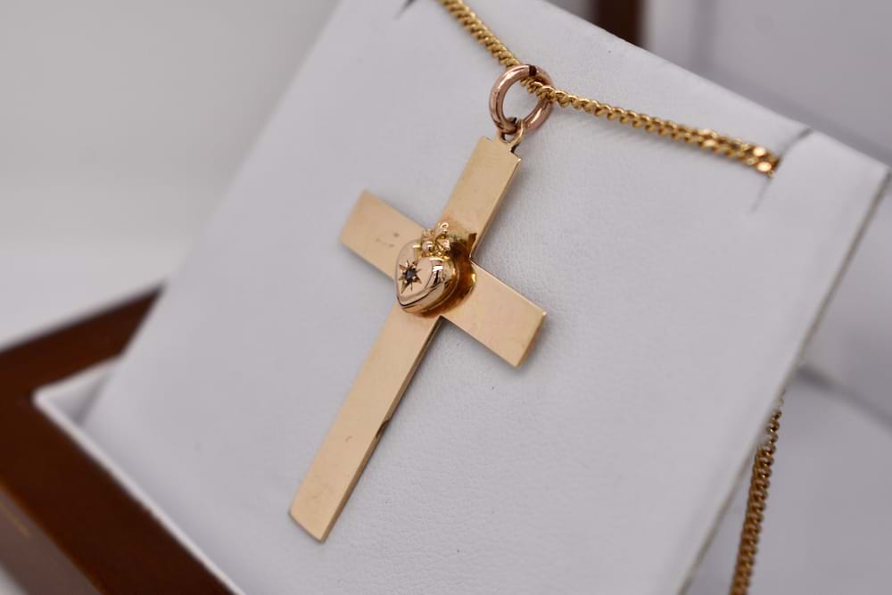 SOLD Antique 9ct Yellow Gold Cross with Heart & Diamond Pendant
