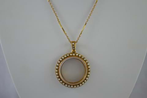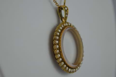 15ct yellow gold memory locket in exceptional condition. This double sided glass locket features a boarder of creamy seed pearls on both sides and is entirely handmade. This locket is the perfect gift for someone who appreciates beautiful antique pieces. Circa 1900. Chains available for separate purchase. Independent Valuation Supplied