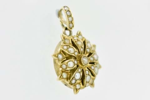 Dated circa 1915 this 15ct yellow gold pendant is encrusted with creamy white seed pearls in a floral design. Independent Valuation Supplied