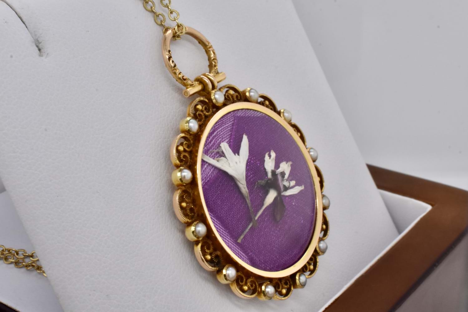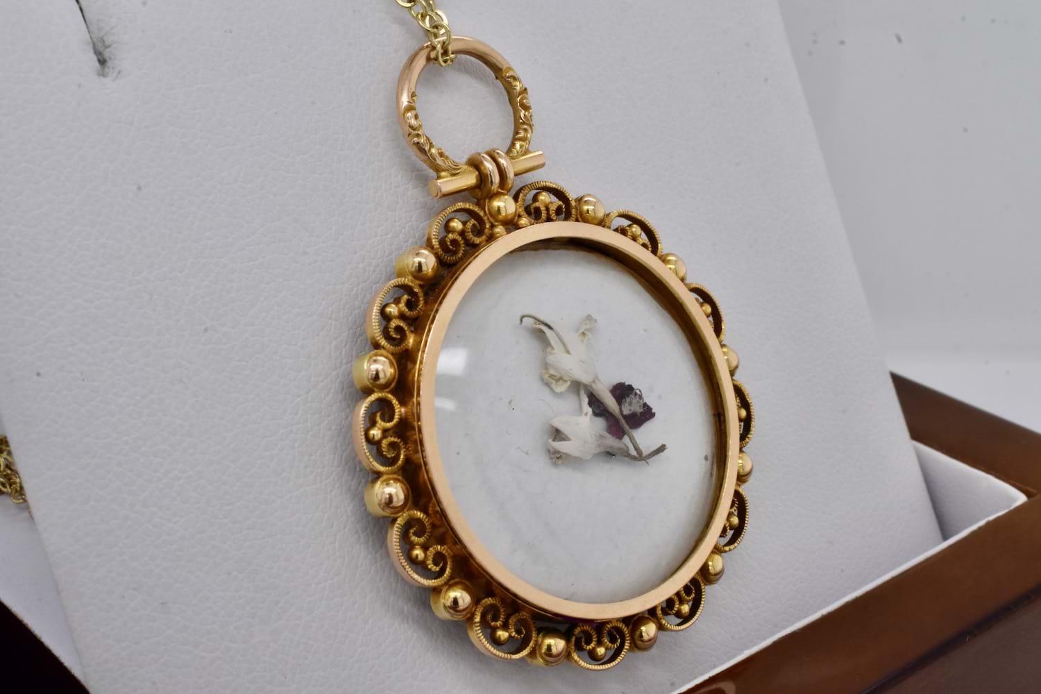 Beautiful antique glass locket crafted in 15ct yellow gold with a scroll border set with seed pearls and an embossed circle top. Dated circa 1900. Independent Valuation Supplied