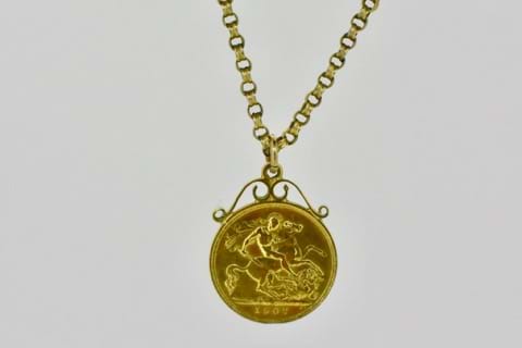 This 1907 sovereign has been converted into a pendant in an 18ct yellow gold frame. (Coin has been solder into the setting). Chain not included.