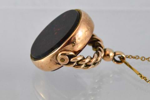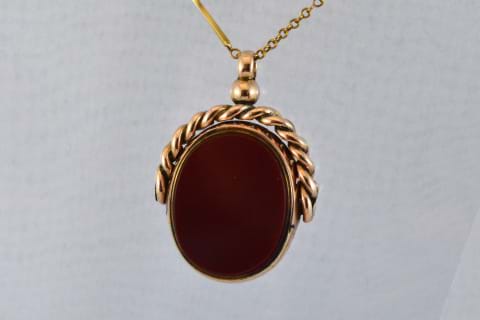 Hallmarked Birmingham 1896 this traditional and lovley spinner features carnelian & bloodstone with a curb link chain top. This spinner is 9ct gold and makes a great pendant or addition to a gentlemans watch chain. Independent Valuation Supplied