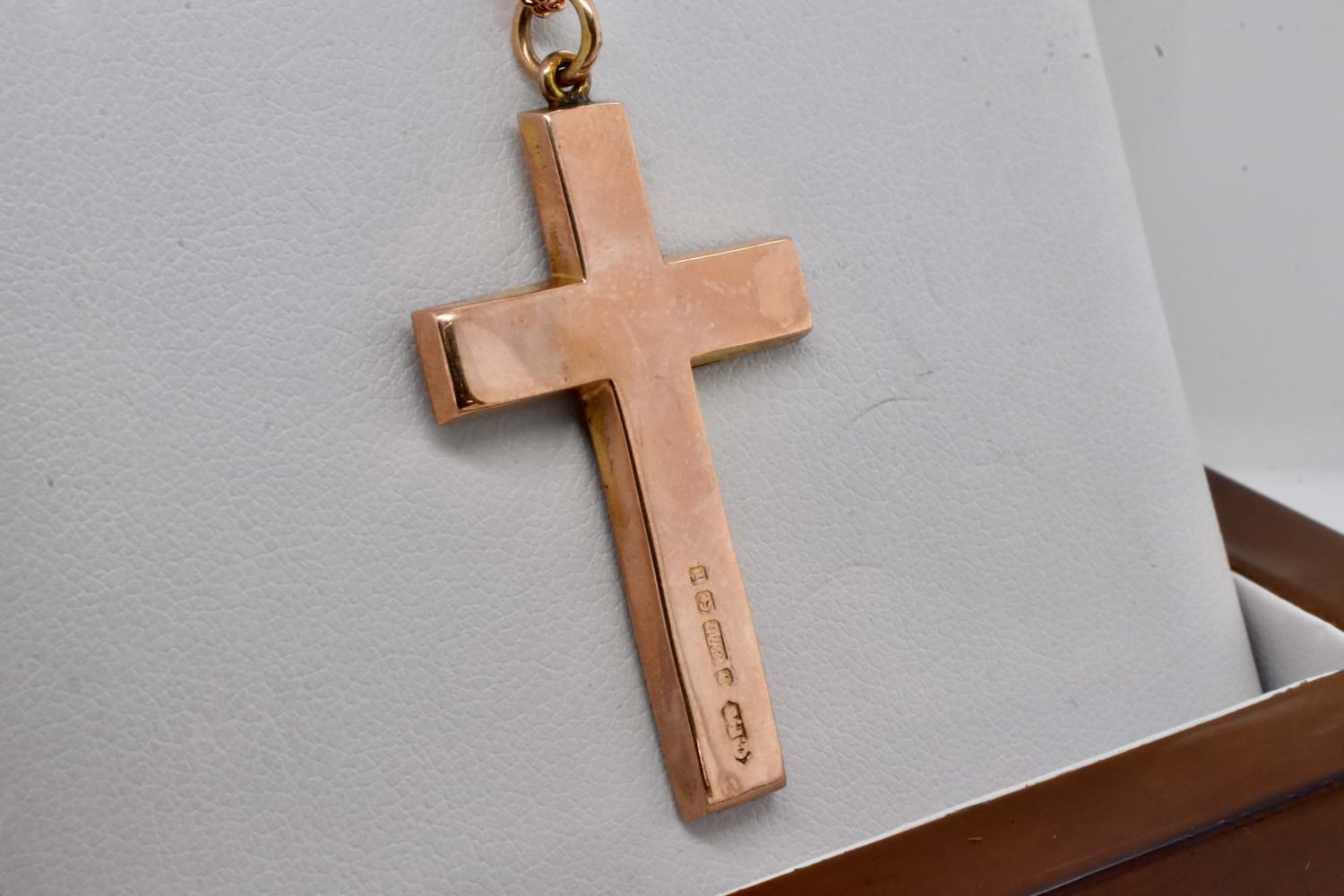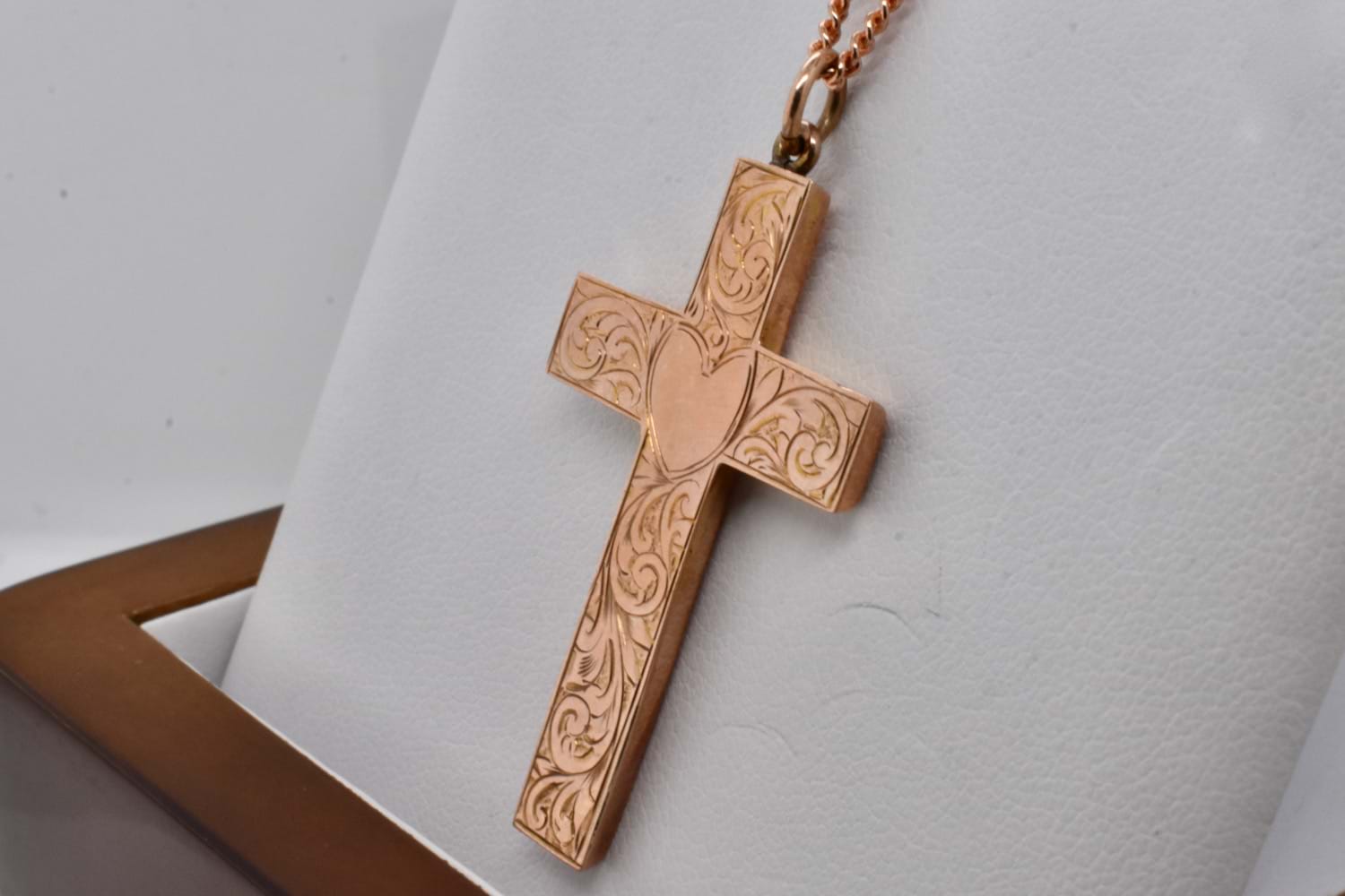 This beautiful antique cross pendant is in great condition and is complete with hallmarks indicating Birmingham 1908. The 9ct rose gold hollow pendant features a heart shape centre surrounded by scroll engraving and measures approx. 39x24x2.6mm. Chains are available for separate purchase