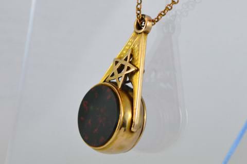 What first appears to be a traditional bloodstone & banded agate spinner with the Masonic star at the top, reveals itself to be a concealed locket. Opening from a hinge mechanism at the side of the banded agate this piece is both cool, beautifully made and a great addition to a womans chain or a Masons collection. Crafted in 9ct yellow gold this piece is dated circa 1890. Independent Valuation Supplied