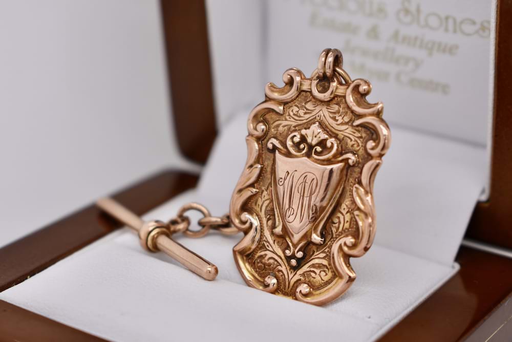 This 9ct rose gold shield is hallmarked Birmingham and has a lovely embossed border with the original owners initials engraved on the front with a plain back ideal for its' new owner to engrave. It is suspended from a 34mm long chain with a T-bar measuring 34mm long. Shield measures 36x22mm